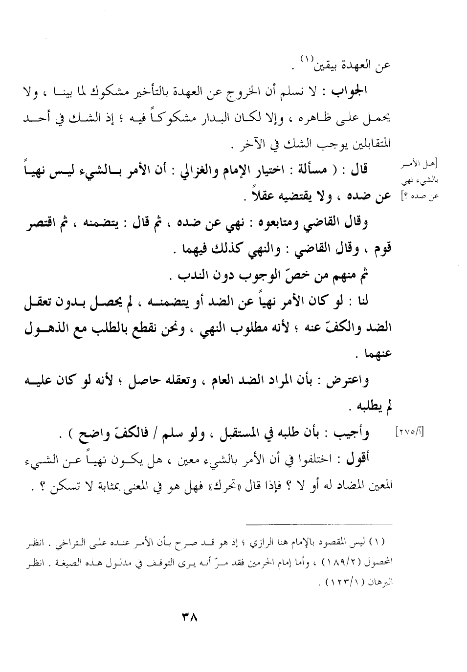 قال: (مسألة: اختيار الإمام والغزالي: أن الأمر بالشيء ليس نهيًا عن ضده, ولا يقتضيه عقلًا.