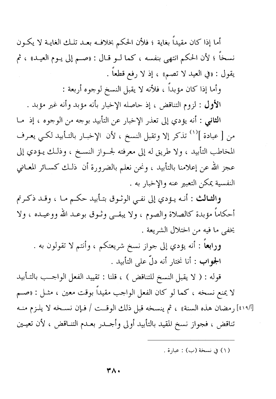 قوله: (لا يقبل النسخ للتناقض) , قلنا: تقييد الفعل الواجب بالتأبيد لا يمنع نسخه, كما لو كان الفعل الواجب مقيدًا بوقت معين, مثل: «صم رمضان هذه السنة» , ثم ينسخه قبل ذلك الوقت / فإن نسخه لا يلزم منه تناقض, فجواز نسخ المقيد بالتأبيد أولى وأجدر بعدم التناقض, لأن تعيين