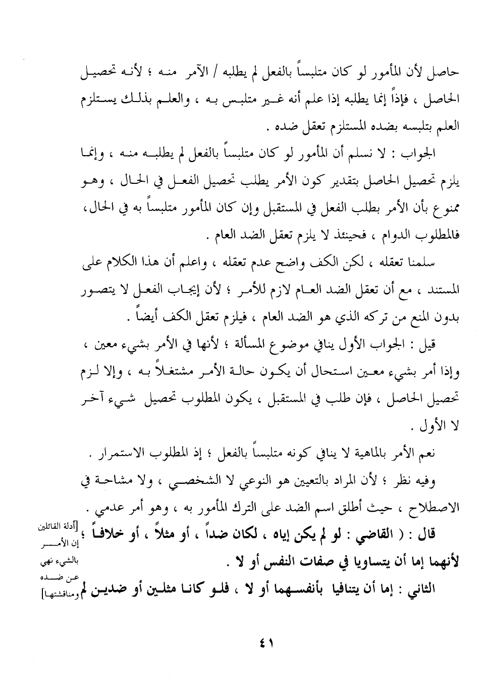 الجواب: لا نسلم أن المأمور لو كان متلبسًا بالفعل لم يطلبه منه, وإنما يلزم تحصيل الحاصل بتقدير كون الأمر يطلب تحصيل الفعل في الحال, وهو ممنوع بأن الأمر بطلب الفعل في المستقبل وإن كان المأمور متلبسًا به في الحال, فالمطلوب الدوام, فحينئذ لا يلزم تعقل الضد العام.