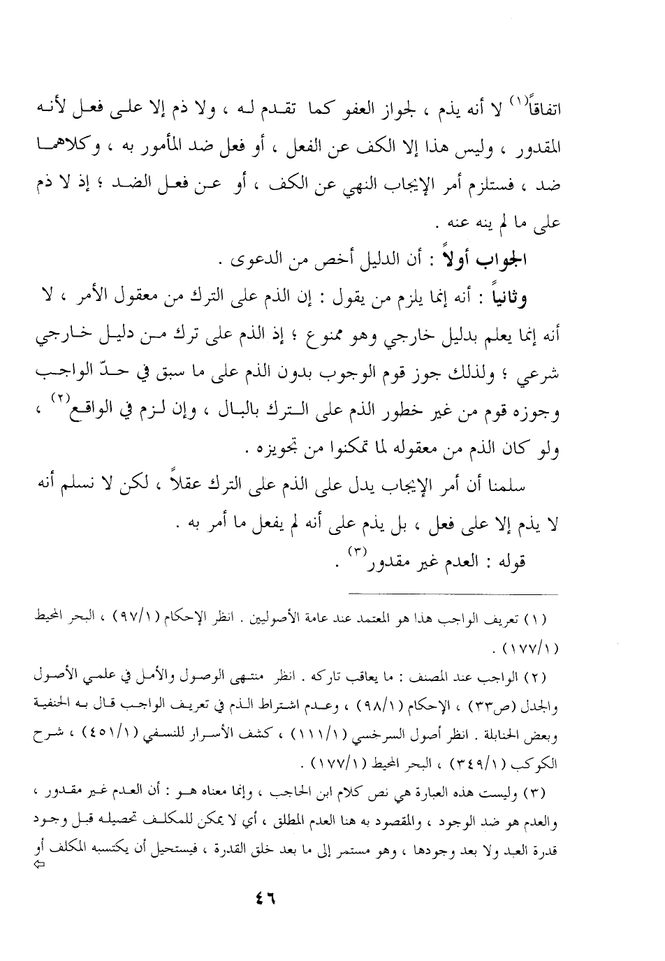 وثانيًا: أنه إنما يلزم من يقول: إن الذم على الترك من معقول الأمر, لا أنه إنما يعلم بدليل خارجي وهو ممنوع؛ إذ الذم على ترك من دليل خارجي شرعي؛ ولذلك جوز قوم الوجوب بدون الذم على ما سبق في حدّ الواجب وجوزه قوم من غير خطور الذم على الترك بالبال, وإن لزم في الواقع, ولو كان الذم من معقوله لما تمكنوا من تجويزه.