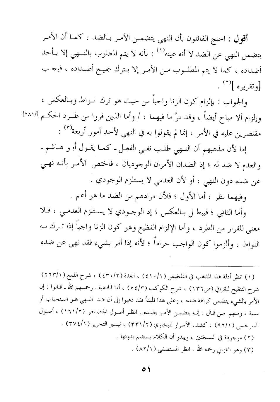 والجواب: بإلزام كون الزنا واجبًا من حيث هو ترك لواط وبالعكس, وإلزام ألا مباح أيضًا, وقد مرَّ ما فيهما, وأما الذين فروا من طرد الحكم متقصرين عليه في الأمر, إنما يقولون به في النهي لأحد أمور أربعة: