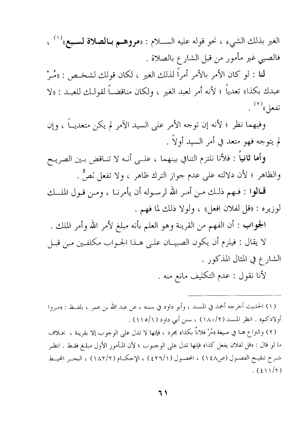 الغير بذلك الشيء, نحو قوله عليه السلام: «مروهم بالصلاة لسبع» , فالصبي غير مأمور من قبل الشارع بالصلاة.