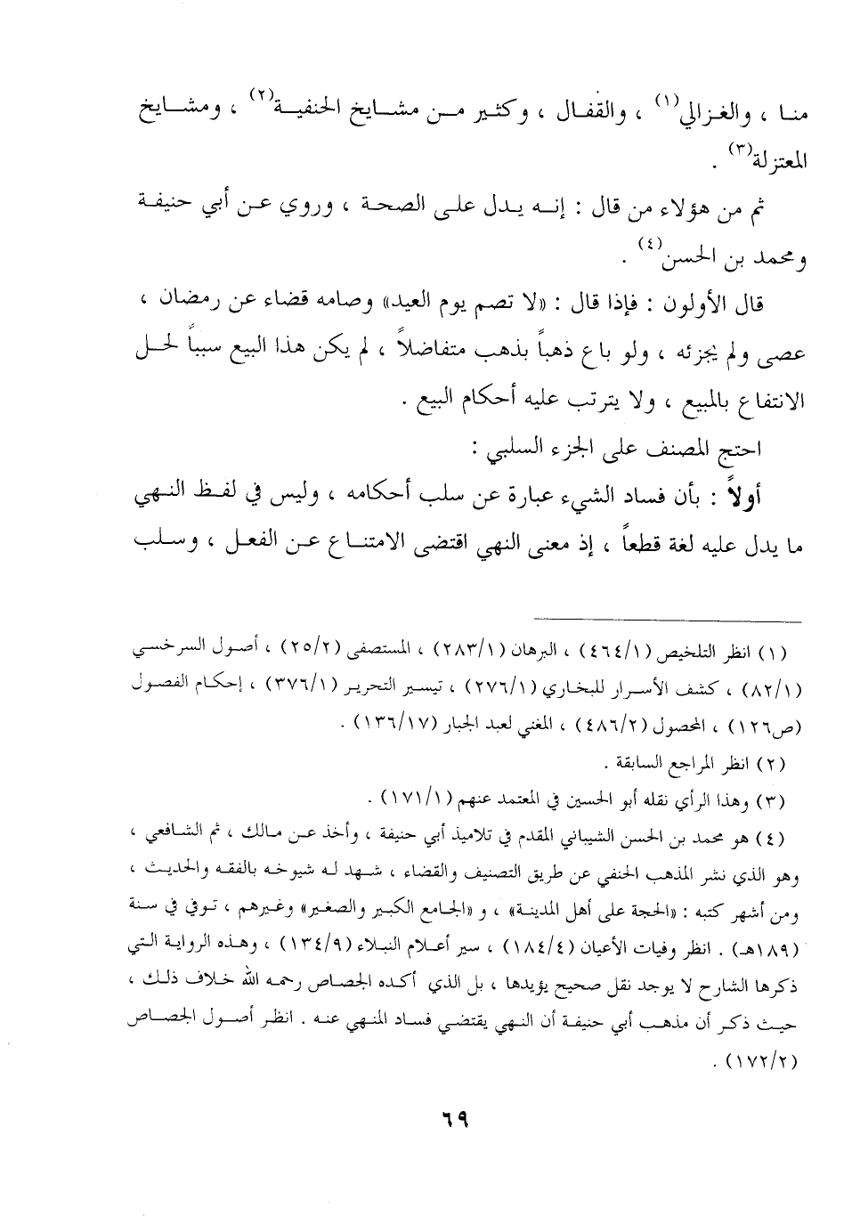قال الأولون: فإذا قال: «لا تصم يوم العيد» وصامه قضاء عن رمضان, عصى ولم يجزئه, ولو باع ذهبًا بذهب متفاضلًا, لم يكن هذا البيع سببًا لحل الانتفاع بالمبيع, ولا يترتب عليه أحكام البيع.