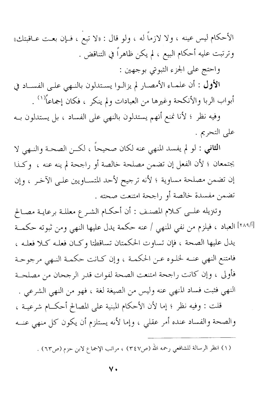 قلت: وفيه نظر؛ إما لأن الأحكام المبنية على المصالح أحكام شرعية, والصحة والفاسد عنده أمر عقلي, وإما لأنه يستلزم أن يكون كل منهي عنه