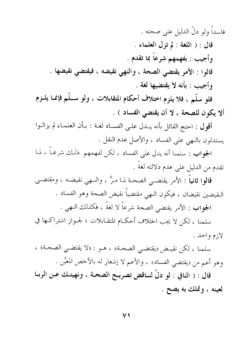 قالوا ثانيًا: الأمر يقتضي الصحة لما مرَّ, والنهي نقيضه, ومقتضى النقيضين نقيضان, فيكون النهي مقتضيًا نقيض الصحة وهو الفساد.