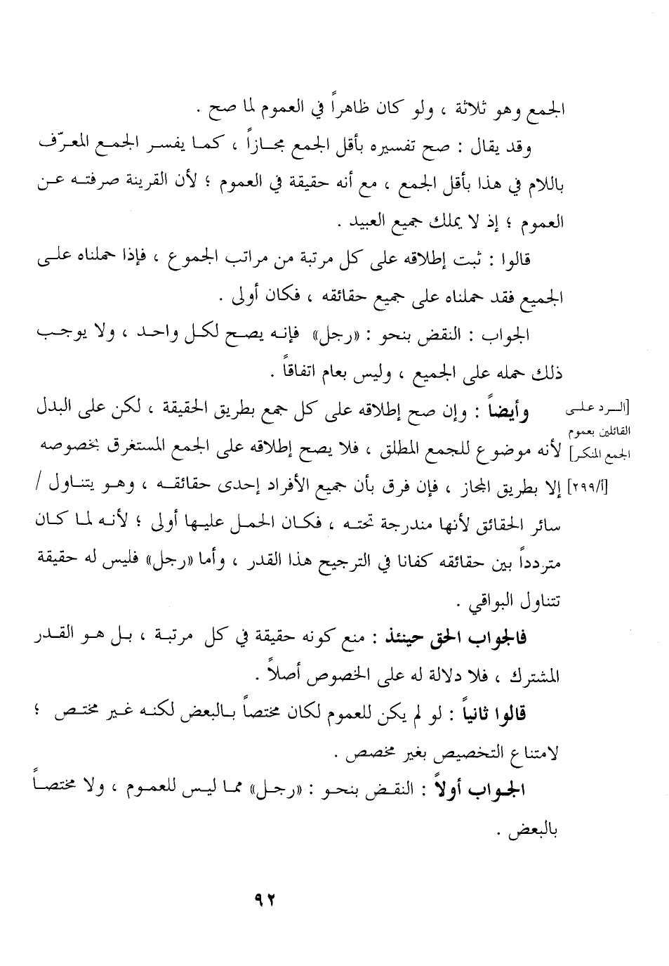وأيضًا: وإن صح إطلاقه على كل جمع بطريق الحقيقة, لكن على البدل لأنه موضوع للجمع المطلق, فلا يصح إطلاقه على الجمع المستغرق بخصوصه إلا بطريق المجاز, فإن فرق بأن جميع الأفراد إحدى حقائقه, وهو يتناول / سائر الحقائق لأنها مندرجة تحته, فكان الحمل عليها أولى؛ لأنه لما كان مترددًا بين حقائقه كفانا في الترجيح هذا القدر, وأما «رجل» فليس له حقيقة تتناول البواقي.