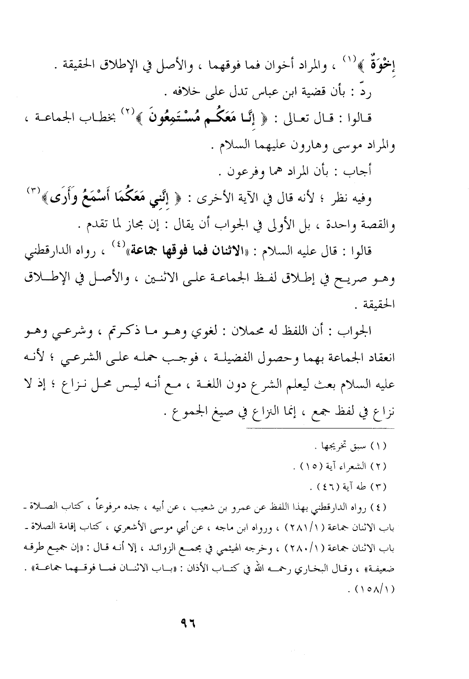 الجواب: أن اللفظ له محملان: لغوي وهو ما ذكرتم, وشرعي وهو انعقاد الجماعة بهما وحصول الفضيلة, فوجب حمله على الشرعي؛ لأنه عليه السلام بعث ليعلم الشرع دون اللغة, مع أنه ليس محل نزاع؛ إذ لا نزاع في لفظ جمع, إنما النزاع في صيغ الجموع.