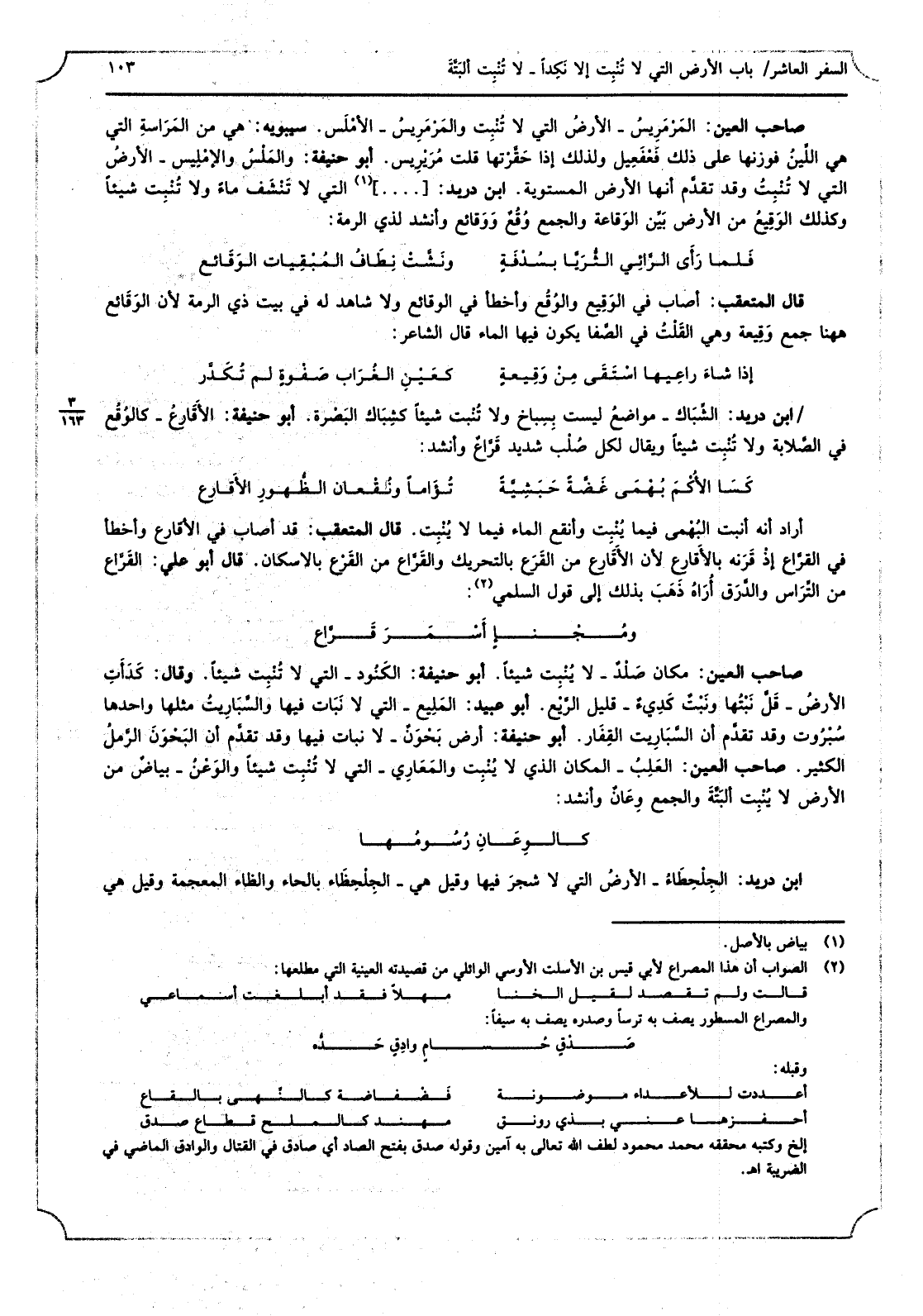 صَاحب الْعين المرمريس - الأَرْض الَّتِي لَا تنْبت والمرمريس - الأملس سِيبَوَيْهٍ هِيَ من المراسلة الَّتِي هِيَ اللين فوزتها على ذَلِك فعقعيل وَلذَلِك إِذا حقرتها قلت مريريس أَبُو حنيفَة والملس والأمليس - الأَرْض الَّتِي لَا تنْبت وَقد تقدم أَنَّهَا الأَرْض المستوية ابْن دُرَيْد الَّتِي لَا تنشف مَاء وَلَا تنْبت شيأ وَكَذَلِكَ الوقيع من الأَرْض بَين الوقاعة وَالْجمع وَقع ووقائع وَأنْشد لذِي الرمة: فَلَمَّا رأى الرَّائِي الثريا بسدفةٍ ونشت نطاف المبقيات الوقائع قَالَ المتعقب أصَاب فِي الوقيع والوقع وَأَخْطَأ فِي الوقائع ولاشاهد لَهُ فِي بَيت ذِي الرمة لِأَن الوقائع هَهُنَا جمع وقيعة وَهِي القلت فِي الصَّفَا يكون فِيهَا المَاء قَالَ الشَّاعِر: إِذا شَاءَ راعيها استقى من وقيعةٍ كعين الْغُرَاب صفوةٍ لم تكدر ابْن دُرَيْد الشباك - مَوَاضِع لَيست بسياخ وَلَا تنْبت شيأ كشباك الْبَصْرَة أَبُو حنيفَة الأفارع - كالوقع فِي الصلابة وَلَا تنْبت شيأ وَيُقَال لكل صلب شَدِيد قراع وَأنْشد: كسا الأكم بهمي غضةً حبشيةً تؤاما ونقعان الظُّهُور الأفارع أَرَادَ أَنه النبت البهمي فِيمَا ينْبت وأنقع المَاء فِيمَا لَا ينْبت قَالَ المتعقب قد أصَاب فِي الأقارع وَأَخْطَأ فِي القراع إِذْ قرنه بالأقارع لِأَن الأقارع من القرع بِالتَّحْرِيكِ والقراع بالاسكان قَالَ أَبُو عَليّ القراع من التراس والدرق اراء ذهب بذلك إِلَى قَول السّلمِيّ: ومجنا أسمر قراع صَاحب الْعين مَكَان صلد - لَا ينْبت شيأ أَبُو حنيفَة التكنود - الَّتِي لَا تنْبت شيأ وَقَالَ كدأت الأَرْض - قل نبتها وَنبت كدىً - قَلِيل الرّبع أَبُو عبيد المليع - الَّتِي لَا نَبَات فِيهَا والسباريت مثلهَا وَاحِدهَا سبروت وَقد تقدم أَن السباريت القفار أَبُو حنيفَة أَرض بحونٌ - لَا نَبَات فِيهَا وَقد تقدم أَن البحون الرمل الْكثير صَاحب الْعين العلب - الْمَكَان الَّذِي لَا ينْبت والمعاري - الَّتِي لَا تنْبت شيأ والوعن - بَيَاض من الأَرْض لَا ينْبت الْبَتَّةَ وَالْجمع وعان وَأنْشد: كالوعان رسومها ابْن دُرَيْد الجلحطاء - الأَرْض الَّتِي لَا شجر فِيهَا وَقيل هِيَ - الجلحظاء بِالْحَاء والظاء الْمُعْجَمَة وَقيل هِيَ -