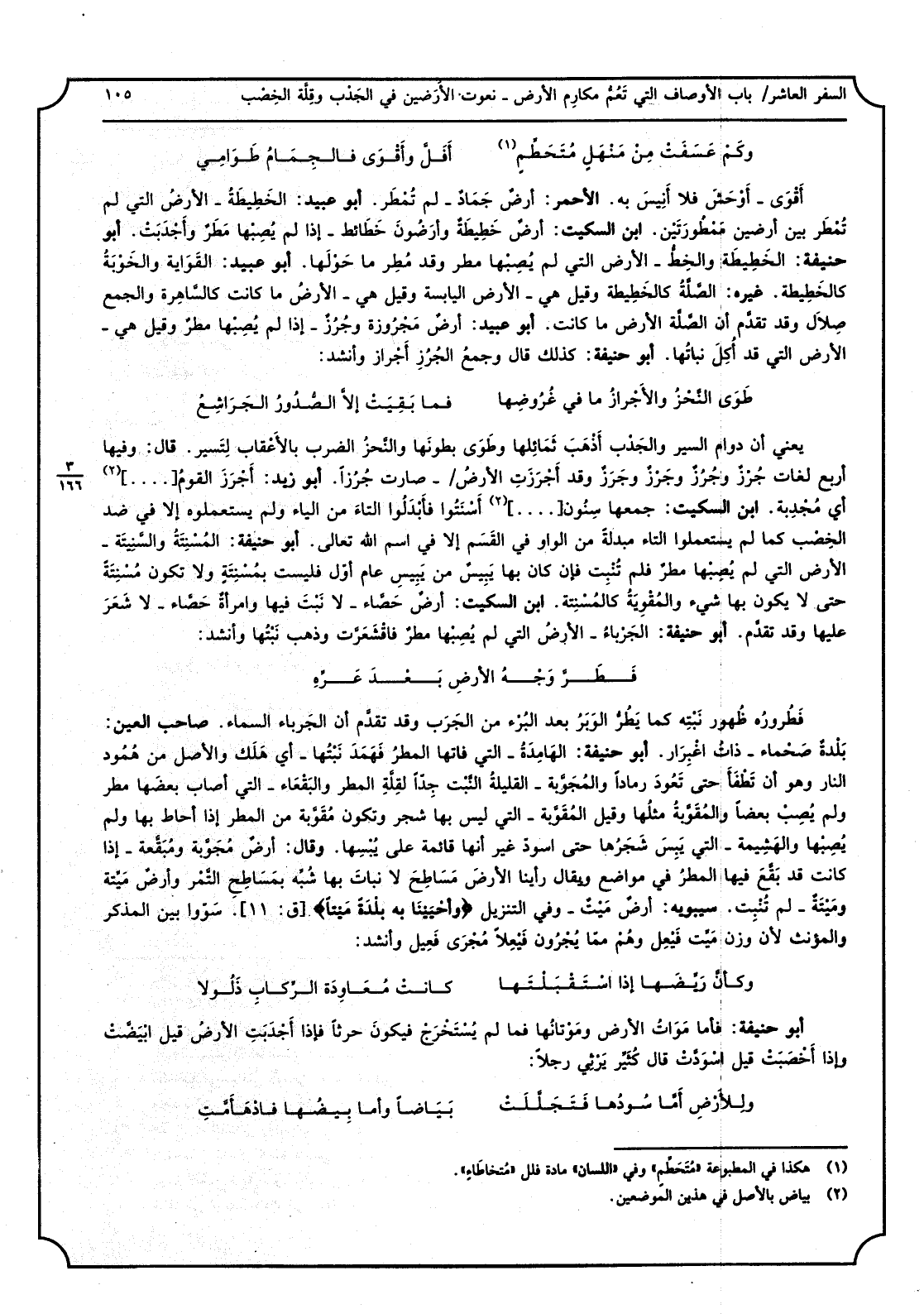 وَكم عسفت من منهل متحطمٍ أفل وَأقوى فلجمام طوام أقوى - أوحش فَلَا أنيس بِهِ الْأَحْمَر أرضٌ جمادٌ - لم تمطر أَبُو عبيد الخطيطة - الأَرْض الَّتِي لم تمطر بَين أَرضين ممطورتين ابْن السّكيت أرضٌ خطيطة وأرضون خطائط - إِذا لم يصبهَا مطر وأجدبت أَبُو حنيفَة الخطيطة والخط - الأَرْض الَّتِي لم يصبهَا مطر وَقد مطر مَا حولهَا أَبُو عبيد القواية والخوبة كالخطيطة غَيره الصِّلَة كالخطيطة وَقيل هِيَ - الأَرْض الْيَابِسَة وَقيل هِيَ - الأَرْض مَا كَانَت كالساهرة وَالْجمع صلال وَقد تقدم أَن الصِّلَة الأَرْض مَا كَانَت أَبُو عبيد أَرض مجرورة وجرزٌ - إِذا لم يصبهَا مطر وَقيل هِيَ - الأَرْض الَّتِي قد أكل نباتها أَبُو حنيفَة كَذَلِك قَالَ وَجمع الجرز أجراز وَأنْشد: طوى النحز والاجراز مَا فِي غروضها فَمَا بقيت إِلَّا الصُّدُور الجراشع يَعْنِي ان دوَام السّير والجدب أذهب ثمائلها وطوى بطونها والنحز الضَّرْب بالاعقاب لتسير قَالَ وفيهَا أَربع لُغَات جرز وجرز وجرز وجرز وَقد أجرزت الأَرْض - صَارَت جرزاً أَبُو زيد أجرز الْقَوْم ... ... . . أَي مُجْدِبَة ابْن السّكيت جمعهَا سنُون ... ... . أسنتوا فأبدلوا التَّاء من الْبَاء إلافي ضد الخصب كَمَا لم يستعملوا التَّاء مبدلة من الْوَاو فِي الْقسم إِلَّا فِي اسْم الله تَعَالَى أَبُو حنيفَة المسنتة والسنتية - الأَرْض الَّتِي لم يصبهَا مطرٌ فَلم تنْبت فَإِن كَانَ بهَا يبس من يبس عَام أول فَلَيْسَتْ بمسنتةٍ وَلَا تكون مسنتةً حَتَّى لَا يكون بهَا شَيْء والمقوية كالمسنتة ابْن السّكيت أرضٌ حصاء - لَا نبت فِيهَا وَامْرَأَة حصاء - لَا شعر عَلَيْهَا وَقد تقدم أَبُو حنيفَة الجرباء - الأَرْض الَّتِي لم يصبهَا مطرٌ فاقشعرت وَذهب نبتها وَأنْشد: فطر وَجه الأَرْض بعد عزه فطروره ظُهُوره كَمَا يطر الْوَبر بعد الْبُرْء من الجرب وَقد تقدم أَن الجرباء السَّمَاء صَاحب الْعين بَلْدَة صحماء - ذَات اغبرار أَبُو حنيفَة الهامدة - الَّتِي فاتها الْمَطَر فهمد نبتها - أَي هلك والاصل من همود النَّار وَهُوَ أَن تطفأ حَتَّى تعود رَمَادا والمجوبة - القليلة النبت جدا لقة الْمَطَر والبقعاء - الَّتِي أصَاب بَعْضهَا مطر وَلم يصب بَعْضًا والمقوبة مثلهَا وَقيل المقوبة - الَّتِي لَيْسَ بهَا شجر وَتَكون مقوبة من الْمَطَر إِذا أحَاط بهَا وَلم يصبهَا والهشيمة - الَّتِي يبس شَجَرهَا حَتَّى اسود غير أَنَّهَا قَائِمَة على يبسها وَقَالَ أرضٌ مجوبة ومبقعة - إِذا كَانَت قد بقع فِيهَا الْمَطَر فِي مَوَاضِع وَيُقَال رَأينَا الأَرْض مساطح لَا نَبَات بهَا شبه بمساطح التَّمْر وأرضٌ ميتَة وميتة - لم تنْبت سِيبَوَيْهٍ أرضٌ ميتٌ - وَفِي التَّنْزِيل (وأحيينا بِهِ بَلْدَة مَيتا) سؤوا بَين الْمُذكر والمؤنث لِأَن وزن ميتٍ فيعل وهم مِمَّا يجرونَ فيعلاً مجْرى فعيل وَأنْشد: وَكَأن ريضها إِذا استقبلتها كَانَت معاودة الركاب ذلولاً أَبُو حنيفَة فَأَما موَات الأَرْض وموتانها فَمَا لم يسْتَخْرج فَيكون حرثاً فَإِذا أجدبت الأَرْض قيل ابْيَضَّتْ وَإِذا أخصبت قيل اسودت قَالَ كثير يرثي رجلا: وللأرض أما سودها فتجللت بَيَاضًا وَأما بيضها فادهأمت