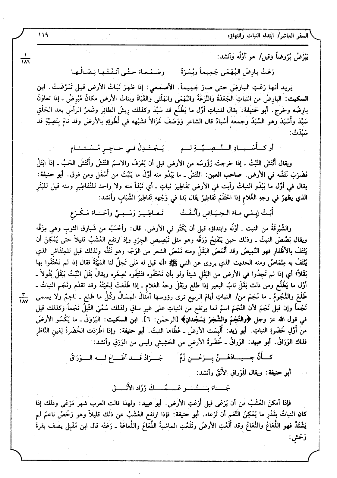 يبرض بروضاً وَقيل هُوَ أَوله وَأنْشد: رعت بارض البهمي جميماً وبسرة وصمعاء حَتَّى أنفقتها نصالها يُرِيد أَنَّهَا رعت البارض حَتَّى صَار جميماً الْأَصْمَعِي إِذا ظهر نَبَات الأَرْض قيل تبرضت ابْن السّكيت البارض من النَّبَات الجعدة والنزعة والبهمي والهلتي والقباة ونبات الأَرْض مَكَان مبرضٌ - إِذا تعاون بارضه وَخرج أَبُو حنيفَة يُقَال للنبات أول مَا يطلع قد سبد وَكَذَلِكَ ريش الطَّائِر وَشعر الرَّأْس بعد الْحلق سبد وأسبد وَهُوَ السبد وَجمعه أسباد قَالَ الشَّاعِر وَوصف غزالاً فشبهه فِي لطوائه بِالْأَرْضِ وَقد نَام بنصية قد سبدت: أَو كأسباد النصية لم يجتدل فِي حاجر مستنام وَيُقَال أنتش النبت - إِذا خرجت رءوسه من الأَرْض قبل أَن يعرف وَالِاسْم النتش وأنتش الْحبّ - إِذا ابتل فَضرب نتشه فِي الأَرْض صَاحب الْعين النتش - مَا يَبْدُو مِنْهُ أول مَا ينْبت من أَسْفَل وَمن فَوق أَبُو حنيفَة يُقَال فِي أول مَا يَبْدُو النَّبَات رَأَيْت فِي الأَرْض تفاطير نباتٍ - أَي نبذاً مِنْهُ وَلَا وَاحِد للتفاطير وَمِنْه قيل للبثر الَّذِي يظْهر فِي وَجه الْغُلَام إِذا احثلم تفاطير يُقَال بدا فِي وَجهه تفاطير الشَّبَاب وَأنْشد: أَبَت إبلي مَاء الْحِيَاض وآلفت تفاطير وسميٍ واحناء مكرع والشبرقة من النبت - أَوله وابتداؤه قبل أَن يكثر فِي الأَرْض قَالَ وَأَحْسبهُ من شبارق الثَّوْب وَهِي مزقه زيقال بصص النبت - وَذَلِكَ حِين ينتفخ ورقه وَهُوَ مثل تبصيص الجرو وَإِذا ارْتَفع العشب قَلِيلا حَتَّى يُمكن أَن ينتف بالأظفار فَهُوَ للمنقاش وَقد أنمص البقل وَمِنْه نمص الشّعْر من الْوَجْه وَهُوَ نتفه وَلذَلِك قيل للمنقاش الَّذِي ينتف بِهِ منماصٌ وَمِنْه الحَدِيث الَّذِي يرْوى عَن النَّبِي صلى الله عَلَيْهِ وَسلم (أَنه قيل لَهُ مَتى تحل لنا الْميتَة فَقَالَ إِذا لم تحتفوا بهَا بقلاً) أَي إِذا لم تَجدوا فِي الأَرْض من البقل شيأ وَلَو بِأَن تحتفره فتنتفوه لصغره وَيُقَال بقل النبت يبقل بقولاً - أول مَا يطلع وَمن ذَلِك بقل نَاب الْبَعِير إِذا طلع وبقل وَجه الْغُلَام - إِذا طلعت لحيته وَقد تقدم وَنجم النَّبَات - طلع والنجوم - مَا نجم من النَّبَات أَيَّام الرّبيع ترى رءوسها أَمْثَال المَال وكل مَا طلع - ناجمٌ وَلَا يُسمى نجماً وَإِن قيل نجم لِأَن النَّجْم اسمٌ لما يرْتَفع من النَّبَات على غير سَاق وَلذَلِك سمي الثيل نجماً وَكَذَلِكَ قيل فِي قَول الله عز وَجل: (والنجم وَالشَّجر يسجدان) ابْن السّكيت البروق - مَا يكسو الأَرْض من أول خضرَة النَّبَات أَبُو زيد ألبست الأَرْض - غطاها النبت أَبُو حنيفَة وَإِذا طردت الخضرة لعين النَّاظر فَذَاك الْوراق أَبُو عبيد الْوراق - خضرَة الأَرْض من الْحَشِيش وَلَيْسَ من الْوَرق وَأنْشد: كَأَن جيادهن برعن زمٍ جرادٌ قد أطَاع لَهُ الْوراق أَبُو حنيفَة وَيُقَال للوراق الأنق وَأنْشد: جَاءَ بنوعمك رواد الأنق فَإِذا أمكن العشب من أَن يرْعَى قيل أرعت الأَرْض أبوعبيد وَلِهَذَا قَالَت الْعَرَب شهر معىً وَذَلِكَ إِذا كَانَ النَّبَات بقدرٍ مَا يُمكن النعم أَن ترعاه أَبُو حنيفَة فَإِذا ارْتَفع العشب عَن ذَلِك قَلِيلا وَهُوَ رخصٌ ناعم لم يشْتَد فَهُوَ اللعاع والنعاع وَقد ألعت الأَرْض وتلعت الْمَاشِيَة اللعاع واللعاعة - رعته قَالَ ابْن مقبل يصف بقرة وحشٍ: