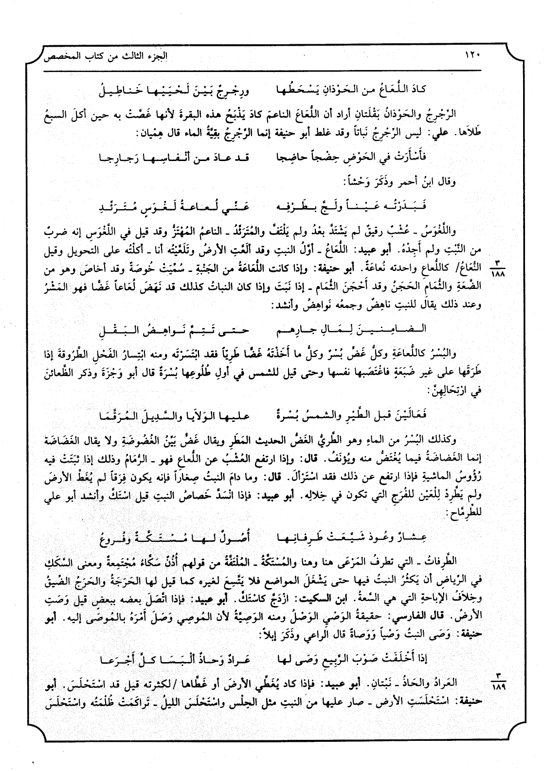 كَاد اللعاع من الحوذان يسحطها ورجرجٍ بَين لحييها خناطيل الرجرج والحوذان بقلتان أَرَادَ أَن اللعاع الناعم كَاد يذبح هَذِه الْبَقَرَة لِأَنَّهَا غصت بِهِ حِين أكل السَّبع طلاها عَليّ لَيْسَ الرجرج نباتاً وَقد غلط أَبُو حنيفَة إِنَّمَا الرجرج بَقِيَّة المَاء قَالَ هميان: فأسارت فِي الْحَوْض حضجاً حاضجاً قد عَاد من أنفاسها رجارجاً وَقَالَ ابْن أَحْمَر وَذكر وحشاً: فبدرته عينا ولج بطرفه عَنى لعاعة لغوسٍ مترئد واللغوس - عشب رقيقٌ لم يشْتَد بعد وَلم يلتف والمترئد - الناعم المهتز وَقد قيل فِي اللغوس إِنَّه ضرب من النبت وَلم أَجِدهُ أَبُو عبيد اللعاع - أول النبت وَقد ألعتٍ الأَرْض وتلعيته أَنا - أَكلته على التَّحْوِيل وَقيل النعاع كاللعاع واحدته نعاعة أَبُو حنيفَة وَإِذا كَانَت اللعاعة من الجنبة - سمت خوصَة وَقد اخاص وَهُوَ من الضعة والثمام الحجن وَقد أحجن الثمام - إِذا نبت وَإِذا كَانَ النَّبَات كَذَلِك قد نَهَضَ لعاعاً غضاً فَهُوَ المنشر وَعند ذَلِك يُقَال للنبت ناهض وَجمعه نواهض وَأنْشد: الضامنين لما جارهم حَتَّى تتمّ نواهض البقل والبسر كاللعاعة وكل غضٍ بسر وكل مَا أَخَذته غضاً طرياً فقد ابتسرته وَمِنْه ابتسار الْفَحْل الطروقة إِذا طرقها على غير ضبعةٍ فاغتصبها نَفسهَا وَحَتَّى قيل للشمس فِي أول طُلُوعهَا بسرةٌ قَالَ أَبُو وجزة وَذكر الظعائن فِي ارتحالهن: فعالين قبل الطير وَالشَّمْس بسرةٌ عَلَيْهَا الولايا والسديل المرقما وَكَذَلِكَ الْبُسْر من المَاء وَهُوَ الطرى الغض الحَدِيث الْمَطَر وَيُقَال غضٌ بَين الغضوضة وَلَا يُقَال الغضاضة إِنَّمَا الغضاضة فِيمَا يغتض مِنْهُ ويؤنف قَالَ وَإِذا ارْتَفع العشب عَن ذَلِك فقد استرأل قَالَ وَمَا دَامَ النبت صغَارًا فَإِنَّهُ يكون فرقا لم يغط الأر ض وَلم يطرد للعين لِلْفَرجِ الَّتِي لَا تكون فِي خلاله أَبُو عبيد فَإِذا استد خصاص النبت قيل استك وَأنْشد أَبُو عَليّ للطرماح: عثار وعوذ شيعت طرفانها أصولٌ لَهَا مستكةٌ وفروع الطرفات - الَّتِي تطرف المرعى هُنَا وَهنا والمستكلة - الملتفة من قَوْلهم أذنق سكاء مجتمعةٌ وَمعنى السكَك فِي الرياض أَن يكثر النبت فِيهَا حَتَّى يشغل الْمَوَاضِع فَلَا يَتَّسِع لغيره كَمَا قيل لَهَا الحرجة والحرج الضّيق وَخلاف الاباحة الَّتِي هِيَ السعَة ابْن السّكيت ازدج كاستك أَبُو عبيد فَإِذا اتَّصل بعضه بِبَعْض قيل وصت الأَرْض قَالَ الْفَارِسِي حَقِيقَة الْوَصِيّ الْوَصْل وَمِنْه الْوَصِيَّة لِأَن الْمُوصي وصل أمره بالموصي إِلَيْهِ أَبُو حنيفَة وصّى النبت وَصِيّا ووصاةً قَالَ الرَّاعِي وَذكر إبِلا: إِذا أخلفت صوب الرّبيع وصّى لَهَا عراد وحاذٌ ألبسا كل أجرعا العراد والحاذ - نبتان أَبُو عبيد فَإِذا كَاد يُغطي الأَرْض أَو غطاها لكثرته قيل قد استحلس أَبُو حنيفَة استحلست الأَرْض - صَار عَلَيْهَا من النبت مثل الحلس واستحلس اللَّيْل - تراكمت ظلمته واستحلس