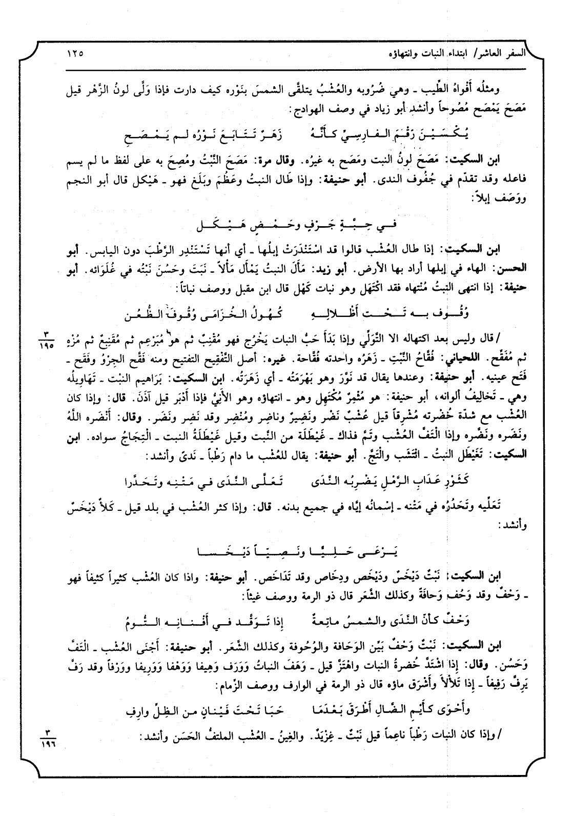 وَمثله أَفْوَاه الطّيب - وَهِي ضروبه والعشب يتلَقَّى الشَّمْس بنوره كَيفَ دارت فَإِذا ولى لون الزهر قيل مصح يمصح مصوحاً وَأنْشد أَبُو زِيَاد فِي وصف الهوادج: يكسين رقم الْفَارِسِي كَأَنَّهُ زهر تتَابع نوره لم يمصح ابْن السّكيت مصح لون النبت ومصح بِهِ غَيره وَقَالَ مرّة مصح النبت ومصح بِهِ على لفظ مَا لم يسم فَاعله وَقد تقدم فِي جفوف الندى أَبُو حنيفَة وَإِذا طَال النبت وَعظم وَبلغ فَهُوَ - هيكل قَالَ أَبُو النَّجْم وَوصف إبِلا: فِي حبةٍ جرفٍ وحمضٍ هيكل ابْن السّكيت إِذا طَال العشب قَالُوا قد استندرت إبلها - أَي أَنَّهَا تستندر الرطب دون الْيَابِس أَبُو الْحسن الْهَاء فِي إبلها أَرَادَ بهَا الأَرْض أَبُو زيد مأل النبت يمأل مألاً - نبت وَحسن نبته فِي غلوائه أَبُو حنيفَة إِذا انْتهى النبت منتهاه فقد اكتهل وَهُوَ نَبَات كهل قَالَ ابْن مقبل وَوصف نباتاً: وقُوف بِهِ تَحت أظلاله كهول الخزامى وقُوف الظعن قَالَ وَلَيْسَ بعد اكتهاله الا التولي وَإِذا بَدَأَ حب النَّبَات يخرج فَهُوَ مقنبٌ ثمَّ هُوَ مبرعم ثمَّ مقنبعٌ ثمَّ مزهٍ ثمَّ مفقح اللحياني فقاحٌ النبت - زهره واحدته قفاحة غَيره أصل التفقيح التفتيح وَمِنْه فقح الجرو وفقح - فتح عَيْنَيْهِ أَبُو حنيفَة وَعِنْدهَا يَقُول قد نور وَهُوَ بهرمته - أَي زهرته ابْن السّكيت براهيم النبت - تهاويله وَهِي - تخاليف ألوانه أَبُو حنيفَة هُوَ مثمرٌ مكتهل وَهُوَ - انتهاؤه وَهُوَ الأني فَإِذا أدبر قيل آذن قَالَ وَإِذا كَانَ العشب مَعَ شدَّة خضرته مشرقاً قيل عشبٌ نضر ونضير وناضر ومنضر وَقد نضر ونضر وَقَالَ أنضره الله ونضره ونضره وَإِذا التف العشب وَتمّ فَذَاك - غيطلة من النبت وَقيل غيطلة النبت - التجاج سوَاده ابْن السّكيت تغيطل النبت - ائتشب والتج أَبُو حنيفَة يُقَال للعشب مَا دَامَ رطبا - ندىً وَأنْشد: كثور عداب الرمل يضْربهُ الندى تعلى الندى فِي مَتنه وتحدرا تعلبه وتحدره فِي مَتنه - إسمانه إِيَّاه فِي جَمِيع بدنه قَالَ وَإِذا كثر العشب فِي بلد قيل - كلأ ديخس وَأنْشد: يرْعَى حليا ونصياً ديخسا ابْن السّكيت نبتٌ ديخس وديخص ودخاص وَقد تداخص أَبُو حنيفَة وَإِذا كَانَ العشب كثيرا فَهُوَ - وحفٌ وَقد وحف وحافةً وَكَذَلِكَ الشّعْر قَالَ ذُو الرمة وَوصف غيثاً: وحفٌ كَأَن الندى وَالشَّمْس ماتعةٌ إِذا توقد فِي أفنانه التوم ابْن السّكيت نبتٌ وحفٌ بَين الوحافة والوحوفة وَكَذَلِكَ الشّعْر أَبُو حنيفَة أجنى العشب - التف وَحسن وَقَالَ إِذا اشْتَدَّ خضرَة النَّبَات واهتز قيل - وهف النَّبَات وورف وهيفا ووهفا ووريفا وورفاً وَقد رف يرف رفيفاً - إِذا تلألأ وأشرق مَاؤُهُ قَالَ ذُو الرمة فِي الوارف وَوصف الزِّمَام: وأحوى كأيم الضال أطرق بَعْدَمَا حبا تَحت فينانٍ من الظل وارف وَإِذا كَانَ النَّبَات رطبا نَاعِمًا قيل نبتٌ غزيد والغين - العشب الملتف الْحسن وَأنْشد: