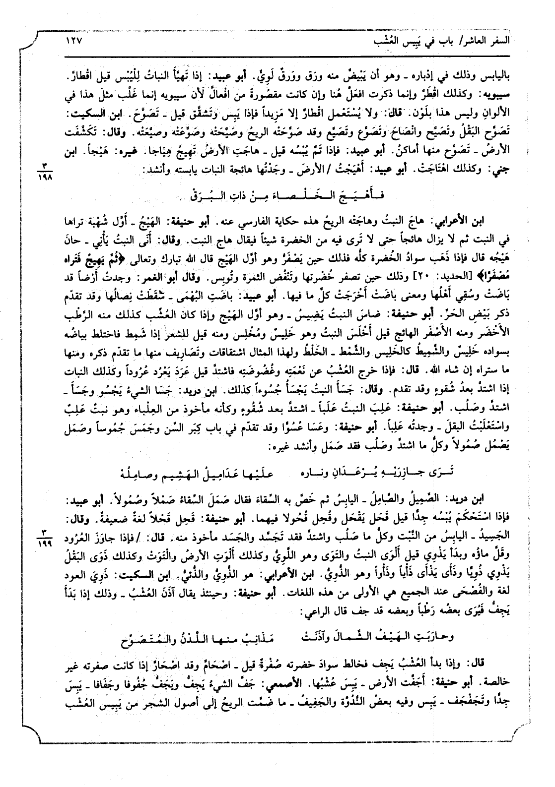 باليابس وَذَلِكَ فِي إدباره - وَهُوَ أَن يبيض مِنْهُ ورق وورق لوىٌ أَبُو عبيد إِذا تهَيَّأ النَّبَات لليبس قيل اقطار سِيبَوَيْهٍ وَكَذَلِكَ اقطر وَإِنَّمَا ذكرت افْعَل هُنَا وَإِن كَانَت مَقْصُورَة من أَفعَال لِأَن سِيبَوَيْهٍ إِنَّمَا غلب مثل هَذَا فِي الألوان وَلَيْسَ هَذَا بلون قَالَ وَلَا يسْتَعْمل أقطار الا مزيدا فَإِذا يبس وتشقق قيل - تصوح ابْن السّكيت تصوح البقل وَتَصْحِيح وانصاح وتصوح وتصيع وَقد صوحته الرّيح وصيحته وصوعته وصيعته وَقَالَ تكشفت الأَرْض - تصوح مِنْهَا أَمَاكِن أَبُو عبيد فَإِذا تمّ يبسه قيل - هَاجَتْ الأَرْض تهيج هياجاً غَيره هيجا ابْن جني وَكَذَلِكَ اهتاجت أَبُو عبيد أهيجت الأَرْض - وَجدتهَا هائجة النَّبَات يابسته وَأنْشد: فأهج الخلصاء من ذَات الْبَرْق ابْن الْأَعرَابِي هاج النبت وهاجته الرّيح هَذِه حِكَايَة الْفَارِسِي عَنهُ أَبُو حنيفَة الهيج - أول شهية ترَاهَا فِي النبت ثمَّ لَا يزَال هائجاً حَتَّى لاترى فِيهِ من الخضرة شيأ فَيُقَال هاج النبت وَقَالَ أَنى النبت يأنى - حَان هيجه قَالَ فَإِذا ذهب سَواد الخضرة كُله فَذَلِك حِين يصفر وَهُوَ أول الهيج قَالَ الله تبَارك وَتَعَالَى: (ثمَّ يهيج فتراه مصفراً) وَذَلِكَ حِين تصفر خضرتها وتنفض الثَّمَرَة وتوبس وَقَالَ أَبُو الْغمر وجدت أَرضًا قد باضت وَسقي أَهلهَا وَمعنى باضت أخرجت كل مَا فِيهَا أَبُو عبيد باضت البهمي - سقكت نصالها وَقد تقدم ذكر بيض الْحر أَبُو حنيفَة ضاس النبت يضيس - وَهُوَ أول الهيج وَإِذا كَانَ العشب كَذَلِك مِنْهُ الرطب الْأَخْضَر وَمِنْه الْأَصْفَر الهائج قيل أخلس النبت وَهُوَ خليسٌ ومخلس وَمِنْه قيل للشعر إِذا شمط فاختلط بياضه بسواده خليسٌ والشميط كالخليس والشمط - الْخَلْط وَلِهَذَا الْمِثَال اشتقاقات وتصاريف مِنْهُ مَا تقدم ذكره وَمِنْهَا مَا ستراه إِن شَاءَ الله قَالَ فَإِذا خرج العشب عَن نعْمَته وغضوضته فَاشْتَدَّ قيل عرد يعرد عروداً وَكَذَلِكَ الناب إِذا شتد بعد شقوء وَقد تقدم وَقَالَ جسأ النبت يجسأ جسوءاً كَذَلِك ابْن دُرَيْد جسا الشَّيْء يجسو وجسأ - اشْتَدَّ وصلب أَبُو حنيفَة علب النبت عُلَبًا - اشْتَدَّ بعد شقوءٍ وَكَأَنَّهُ مَأْخُوذ من العلباء وَهُوَ نبت علبٌ واستعلبت البقل - وجدته عُلَبًا أَبُو حنيفَة وعسا عسواً وَقد تقدم فِي بَاب كبر السن وجمس جموساً وصمل يصمل صمولاً وكل مَا اشْتَدَّ وصلب فقد صمل وَأنْشد غَيره: ترى جازريه يرعدان وناره عَلَيْهَا عداميل الهشيم وصامله ابْن دُرَيْد الصميل والصامل - الْيَابِس ثمَّ خص بِهِ السقاء فَقَالَ صمل السقاء صملاً وصمولاً أَبُو عبيد فَإِذا استحكم يبسه جدا قيل قحل يقحل وقحل قحولاً فيهمَا أَبُو حنيفَة قحل قحلاً لغةٌ ضعيفةٌ وَقَالَ الجسيد - الْيَابِس من النبت وكل مَا صلب وَاشْتَدَّ فقد تجسد مَأْخُوذ مِنْهُ قَالَ فَإِذا جَاوز العرود وَقل مَاؤُهُ وَبَدَأَ يذوي قيل ألوى النبت والتوى وَهُوَ اللوى وَكَذَلِكَ ألوت الأَرْض والتوت وَكَذَلِكَ ذوى البقل يذوي ذوياً وذأى يذأى ذأياً وذأواً وَهُوَ الذوى ابْن الْأَعرَابِي هُوَ الذوى والذئي ابْن السّكيت ذوى الْعود لُغَة والفصحى عِنْد الْجَمِيع هِيَ الأولى من هَذِه اللُّغَات أَبُو حنيفَة وَحِينَئِذٍ يُقَال آذن العشب - وَذَلِكَ إِذا بَدَأَ يجِف فَيرى بعضه رطبا وَبَعضه قد جف قَالَ الرَّاعِي: وحاربت الهيف الشمَال وآذنت مذانب مِنْهَا اللدن والمتصوح قَالَ وَإِذا بَدَأَ العشب يجِف فخالط سَواد خضرته صفرةٌ قيل - اصحام وَقد اصحار إِذا كَانَت صفرته غير خَالِصَة أَبُو حنيفَة أجفت الأَرْض - يبس عشبها الْأَصْمَعِي جف الشَّيْء يجِف جفوفاً وجفافا - يبس جدا وتجفجف - يبس وَفِيه بعض الندوة والجفيف - مَا ضمت الرّيح إِلَى أصُول الشّجر من يبيس العشب