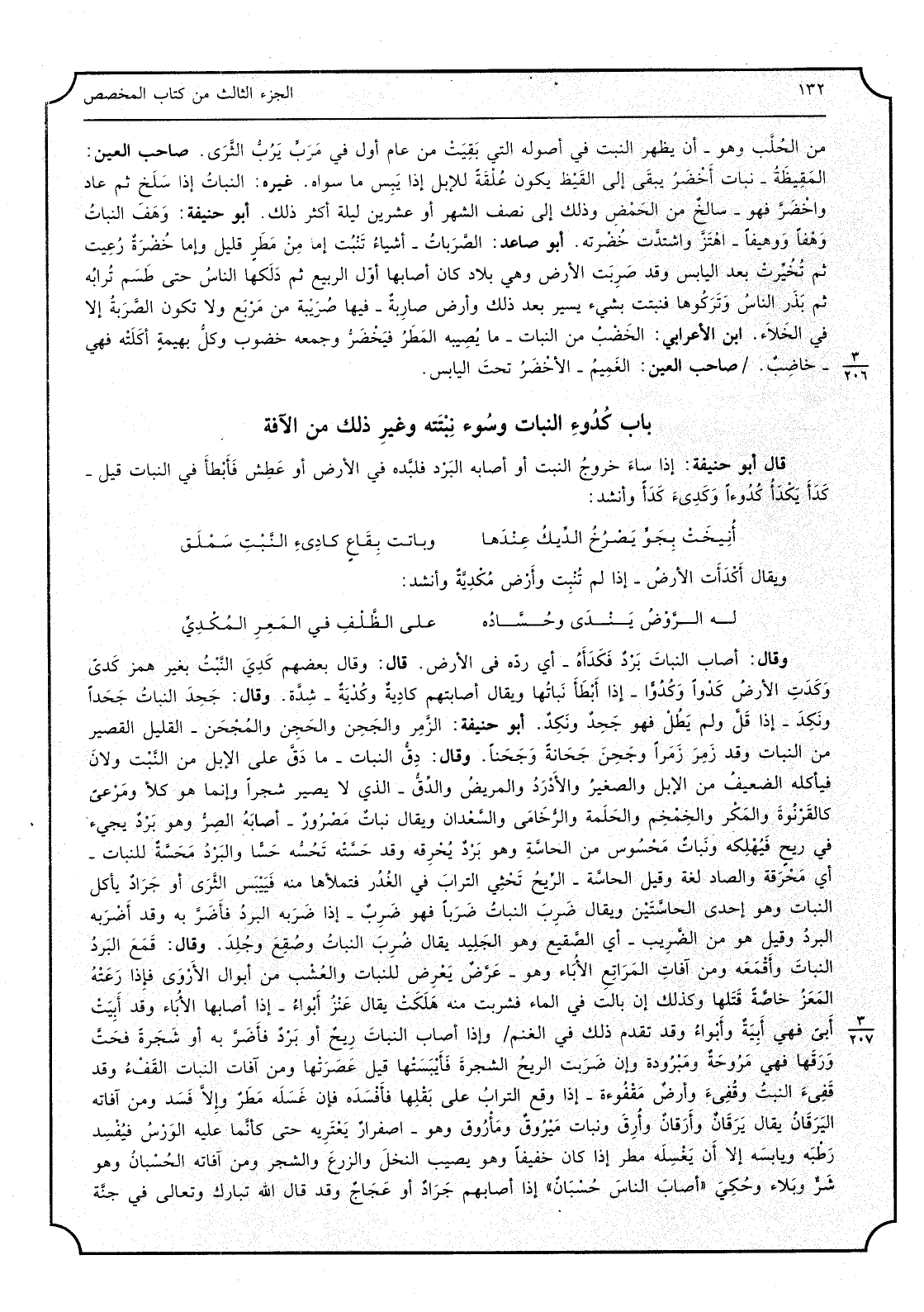 من الْحَلب وَهُوَ - أَن يظْهر النبت فِي أُصُوله الَّتِي بقيت من عَام أول فِي مربٍ يرب الثرى صَاحب الْعين المقيظة - نَبَات أَخْضَر يبْقى إِلَى القيظ يكون علقَة للابل إِذا يبس مَا سواهُ غَيره النَّبَات إِذا سلخ ثمَّ عَاد واخضر فَهُوَ - سالخٌ من الحمض وَذَلِكَ إِلَى نصف الشَّهْر أَو عشْرين لَيْلَة أَكثر ذَلِك أَبُو حنيفَة وهف النَّبَات وهفاً ووهيفاً - اهتز واشتدت خضرته أَبُو صاعد الصربات - أَشْيَاء تنْبت إِمَّا من مطرٍ قَلِيل وَإِمَّا خضرَة رعيت ثمَّ تخيرت بعد الْيَابِس وقدصربت الأَرْض وَهِي بِلَاد كَانَ أَصَابَهَا أول الرّبيع ثمَّ دلكها النَّاس حَتَّى طسم ترابه ثمَّ بذر النَّاس وتركوها فَنَبَتَتْ بِشَيْء يسير بعد ذَلِك وَأَرْض صاربةٌ - فِيهَا صريبة من مربع وَلَا تكون الصربة إى فِي الْخَلَاء ابْن الْأَعرَابِي الخضب من النَّبَات - مَا يُصِيبهُ الْمَطَر فيخضر وَجمعه خضوب وكل بهيمةٍ أَكلته فَهِيَ - خاضبٌ صَاحب الْعين الغميم - الاخضر تَحت الْيَابِس