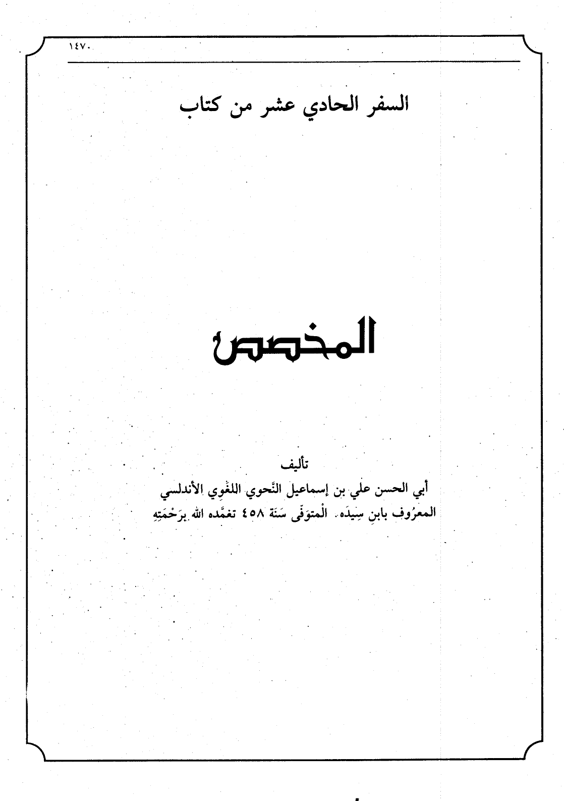 السّفر الْحَادِي عشر من كتاب الْمُخَصّص. تأليف أبي الْحسن عَليّ بن إِسْمَاعِيل النَّحْوِيّ اللّغَوِيّ الأندلسي الْمَعْرُوف بِابْن سَيّده. الْمُتَوفَّى سنة 458 تغمده الله برحمته.