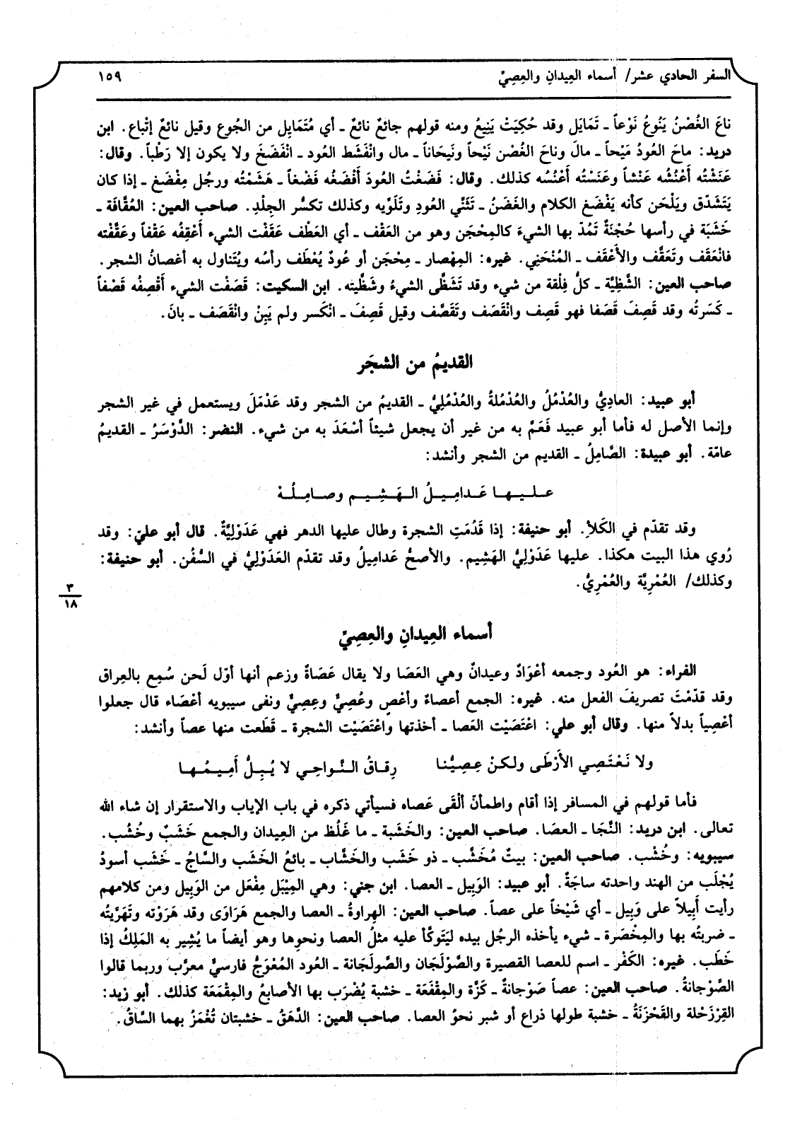 الْفراء هُوَ الْعود وَجمعه أَعْوَاد وعيدان وَهِي الْعَصَا وَلَا يُقَال عصاة وَزعم أَنَّهَا أول لحن سمع بالعراق وَقد قدمت تصريف الْفِعْل مِنْهُ غَيره الْجمع أعصاء وأعص وَعصى وَنفى سيبوبه أعصاء قَالَ جعلُوا أعصيا بَدَلا مِنْهَا وَقَالَ أبوعلي اعتصيت الْعَصَا - أَخَذتهَا واعتصيت الشَّجَرَة - قطعت مِنْهَا عَصا وَأنْشد: وَلَا نعتصي الأرطى وَلَكِن عصينا رقاق النواحي لايبل أميمها فَأَما قَوْلهم فِي الْمُسَافِر اذا أَقَامَ وَاطْمَأَنَّ ألْقى عَصَاهُ فَسَيَأْتِي ذكره فِي بَاب الاياب والاستقرار ان شَاءَ الله تَعَالَى ابْن دُرَيْد النجا - الْعَصَا صَاحب الْعين والخشبة - مَا غلظ من العيدان وَالْجمع خشب وخشب سيبوبه وخشب صَاحب الْعين بَيت مخشب - ذُو خشب والخشاب - بَائِع الْخشب والساج - خشب أسود يجلب من الْهِنْد واحدته ساجة أبوعبيد الوبيل - الْعَصَا ابْن جنى وَهِي المسيبل مفعل من البيل وَمن كَلَامهم رَأَيْت أيبلاً على وبيل - أى شَيخا على عَصا صَاحب الْعين الهراوة - الْعَصَا وَالْجمع هراوى وَقد هروته وتهريته - ضَربته بهَا والمختصرة - شئ يَأْخُذهُ الرجل بِيَدِهِ ليتوكأ عَلَيْهِ مثل الْعَصَا وَنَحْوهَا وَهُوَ أَيْضا مَا يُشِير بِهِ الْملك اذا خطب غَيره الْكفْر - اسْم للعصا القصيرة والصولجان والصولجانة - الْعود المعوج فَارسي مُعرب وَرُبمَا قَالُوا الصولجانة صَاحب الْعين عَصا صوجانة - كزة والمقفة - خَشَبَة طولهَا ذِرَاع أَو شبر نَحْو الْعَصَا صَاحب الْعين الدهق - خشبتان تغمز بهما السَّاق