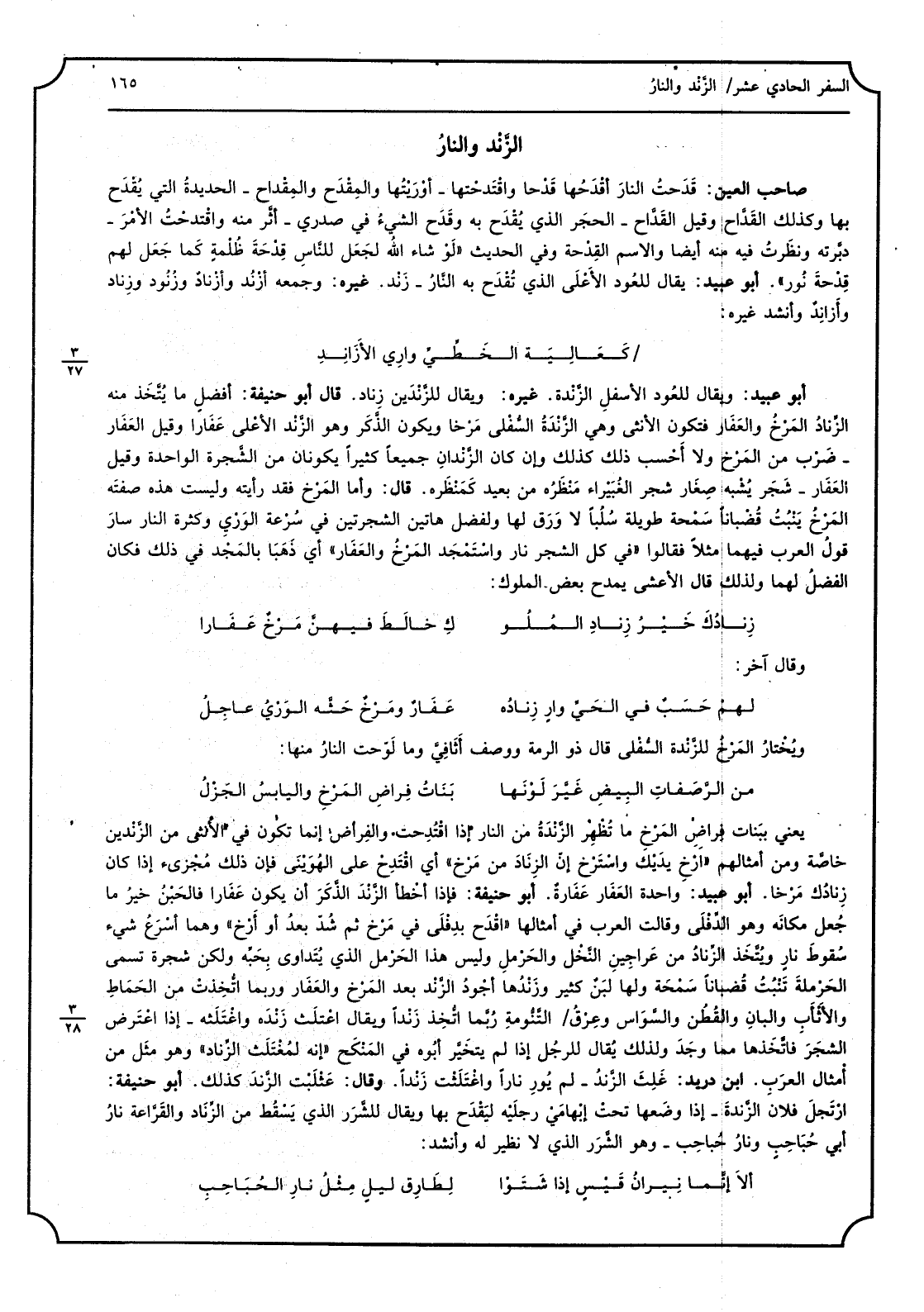صَاحب الْعين قدحت النَّار اقدحها قدحاً واقتدحتها - أوريتها والمقدح والمقداح - الحديدة الَّتِي يقْدَح بهَا وَكَذَلِكَ القداح وَقيل القداح - الْحجر الَّذِي يق ح بِهِ وقدح الشَّيْء فِي صَدْرِي - أثر مِنْهُ واقتدحت الْأَمر - دَبرته وَنظرت فِيهِ مِنْهُ أَيْضا وَالِاسْم القدحة وَفِي الحَدِيث: (لَو شَاءَ الله لجعل للنَّاس قدحة ظلمةٍ كَمَا جعل لَهُم قدحة نور) أَبُو عبيد يُقَال للعود الْأَعْلَى الَّذِي تقدح بِهِ النَّار - زند غَيره وَجمعه أزناد وأناد وزنود وزناد وأزناد وَأنْشد غَيره: كعالية الخطي وارى الأزاند أَبُو عبيد وَيُقَال للعود الْأَسْفَل الزندة غَيره وَيُقَال للزندين زناد وَهِي الزندة السُّفْلى مرخا وَيكون الذّكر وَهُوَ الزند الْأَعْلَى عفارا وَقيل العفار - ضرب من المرخ وَلَا أَحسب ذَلِك كَذَلِك وَإِن كَانَ الزندان جَمِيعًا كثيرا يكونَانِ من الشَّجَرَة الْوَاحِدَة وَقيل العفار - شجر يشبه صغَار شجر الغبيراء منظره من بعيد كمنظره قَالَ وَأما المرخ فقد رَأَيْته وَلَيْسَت هَذِه صفته المرخ ينْبت قضباناً سَمْحَة طَوِيلَة سلباً لَا ورق لَهَا ولفضل هَاتين الشجرتين فِي سرعَة الورى وَكَثْرَة النَّار سَار قَول الْعَرَب فيهمَا مثلا فَقَالُوا: (فِي كل الشّجر نَار واستمجد المرخ والعفار) أَي ذَهَبا بالمجد فِي ذَلِك فَكَانَ الْفضل لَهما وَلذَلِك قَالَ الْأَعْشَى يمدح بعض الْمُلُوك: زنادك خير زناد الملو ك خالط فِيهِنَّ مرخٌ عفارا وَقَالَ آخر: لَهُم حسب فِي الْحَيّ وارٍ زناده عفارٌ ومرخٌ حثه الورى عَاجل ويختار المرخ للزندة السُّفْلى قَالَ ذُو الرمة وَوصف أثافي وَمَا لوعت النَّار مِنْهَا: من الرصفات الْبيض غير لَوْنهَا بَنَات فراض المرخ واليابس الجزل يَعْنِي بَيِّنَات فراض المرخ مَا تظهر الزندة من النَّار إِذا اقتدحت والفراض إِنَّمَا تكون فِي الْأُنْثَى من الزندين خَاصَّة وَمن أمثالهم (أرخ يَديك واسترخ أَن الزِّنَاد من مرخ) أَي اقتدح على الهويني فَإِن ذَلِك مجزئ إِذا كَانَ زنادك مرخا أَبُو عبيد وَاحِدَة العفار عفارةٌ أَبُو حنيفَة فَإِذا أَخطَأ الزند الذّكر أَن يكون عفارا فالحبن خير مَا جعل مَكَانَهُ وَهُوَ الدفلى وَقَالَت الْعَرَب فِي أَمْثَالهَا (اقدح بدفلى فِي مرخ ثمَّ شدّ بعد أَو أرخ) وهما أسْرع شَيْء سُقُوط نارٍ ويتخذ الزِّنَاد عَن عراجين النّخل والحرمل وَلَيْسَ هَذَا الحرمل الَّذِي يتداوى بحبه وَلَكِن شَجَرَة تسمى الحرملة تنْبت قضباناً سَمْحَة وَلها لبنٌ كثير وزندها أَجود الزند بعد المرخ والعفار وَرُبمَا اتَّخذت من الحماط والأثاب والبان والقطن والسواس وعرق التنوسة رُبمَا اتخذ زنداً وَيُقَال اعتلت زنده واغتلثه - إِذا اعْترض الشّجر فاتخذها مِمَّا وجد وَلذَلِك يُقَال للرجل إِذا لم يتَخَيَّر أَبوهُ فِي المنكح (إِنَّه لمغتلث الزِّنَاد) وَهُوَ مثل من أَمْثَال الْعَرَب ابْن دُرَيْد غلث الزند - لم يور نَارا واغتلثت زنداً وَقَالَ عثلبت الزند كَذَلِك أَبُو حنيفَة ارتجل فلَان الزندة - إِذا وَضعهَا تَحت إبهامي رجلَيْهِ ليقدح بهَا وَيُقَال للشرر الَّذِي يسْقط من الزِّنَاد والقراعة نَار أبي حباحب ونار حباحب - وَهُوَ الشرر الَّذِي لَا نَظِير لَهُ وَأنْشد: أَلا إِنَّمَا نيران قيسٍ إِذا شتوا لطارق ليلٍ مثل نَار الحباحب