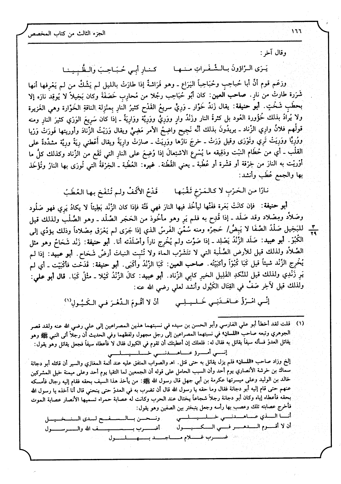 وَقَالَ آخر: يرى الراءون بالشفرات مِنْهَا كنار أبي حباحب والظبينا وَزعم قوم أَن أَبَا حباحب وحباحبا اليراع - وَهُوَ فراشةٌ إِذا طارت بِاللَّيْلِ لم يشك من لم يعرفهَا انها شررة طارت من نارٍ صَاحب الْعين كَانَ أَبُو حباحب رجلا من محَارب خصفة وَكَانَ بَخِيلًا لَا يُوقد ناره إِلَّا بحطب شختٍ أَبُو حنيفَة يُقَال زندٌ خوار - ورىٌ سريع الْقدح كثير النَّار وزندٌ وارٍ وورىٌ وورية ووارية - إِذا كَانَ سريع الورى كثير النَّار وَمِنْه قَوْلهم فلانٌ وارى الزِّنَاد - يُرِيدُونَ بذلك أَنه نجيح وَاضح الْأَمر مضىٌ وَيُقَال أوريت الزِّنَاد وأوريتها فورت ورياً وورياً ووريت ترى وتورى وَقيل ورت - خرج نارها ووريت - صَارَت واريةً وَيُقَال أَعْطِنِي ريةً ورية مُشَدّدَة على الْقلب - أَي من حطام النبت ودقيقة مَا يسْرع الاشتعال إِذا وضع على النَّار الَّتِي تقع من الزِّنَاد وَكَذَلِكَ كل مَا أوريت بِهِ النَّار من خرقَة أَو قشرة أَو عطبة - يَعْنِي القطنة غَيره العطبة - الْخِرْقَة الَّتِي تورى بهَا النَّار واؤخذ بهَا وَالْجمع عطب وَأنْشد: نَارا من الْحَرْب لَا كالمرخ ثغبها قدح الأكف وَلم تنفخ بهَا العطب أَبُو حنيفَة فَإِن كَانَت بَعرَة ففتها ليَأْخُذ فِيهَا النَّار فَهِيَ فتة فَإِذا كَانَ الزند بطيئاً لَا يكَاد يرى فَهُوَ صلود وصلاد ومصلاد وَقد صلد - إِذا قدح بِهِ فَلم ير وَهُوَ مَأْخُوذ من الْحجر الصلد - وَهُوَ الصلب وَلذَلِك قيل للبخيل صلد الصَّفَا لَا يبض حجره وَمِنْه سمي الْفرس الَّذِي إِذا جرى لم يعرق مصلاداً وَذَلِكَ يُؤَدِّي إِلَى الكبو أَبُو عبيد صلد الزند يصلد - إِذا صَوت وَلم يخرج نَارا وأصلدته أَنا أَبُو حنيفَة زند شحاحً وَهُوَ مثل الصلاد وَلذَلِك قيل للْأَرْض الصلبة الَّتِي لَا تتشرب المَاء وَلَا تنْبت النَّبَات أَرض شحاح أَبُو عبيد إِذا لم يخرج الزند شَيْئا قيل كبا كبواً وأكببته صَاحب الْعين كبا الزند وأكبى أَبُو حنيفَة قدحت فأكببت - أَي لم ير زندي وَلذَلِك قيل للنكد الْقَلِيل الْخَيْر كَأبي الزند أَبُو عبيد كال الزند كَيْلا - مثل كبا قَالَ أَبُو عَليّ وَلذَلِك قيل لآخر صفٍ فِي الْقِتَال الكيول وَأنْشد لعَلي رَضِي الله عَنهُ: إِنِّي امْرُؤ عاهدني خليلي أَن لَا أقوم الدَّهْر فِي الكيول