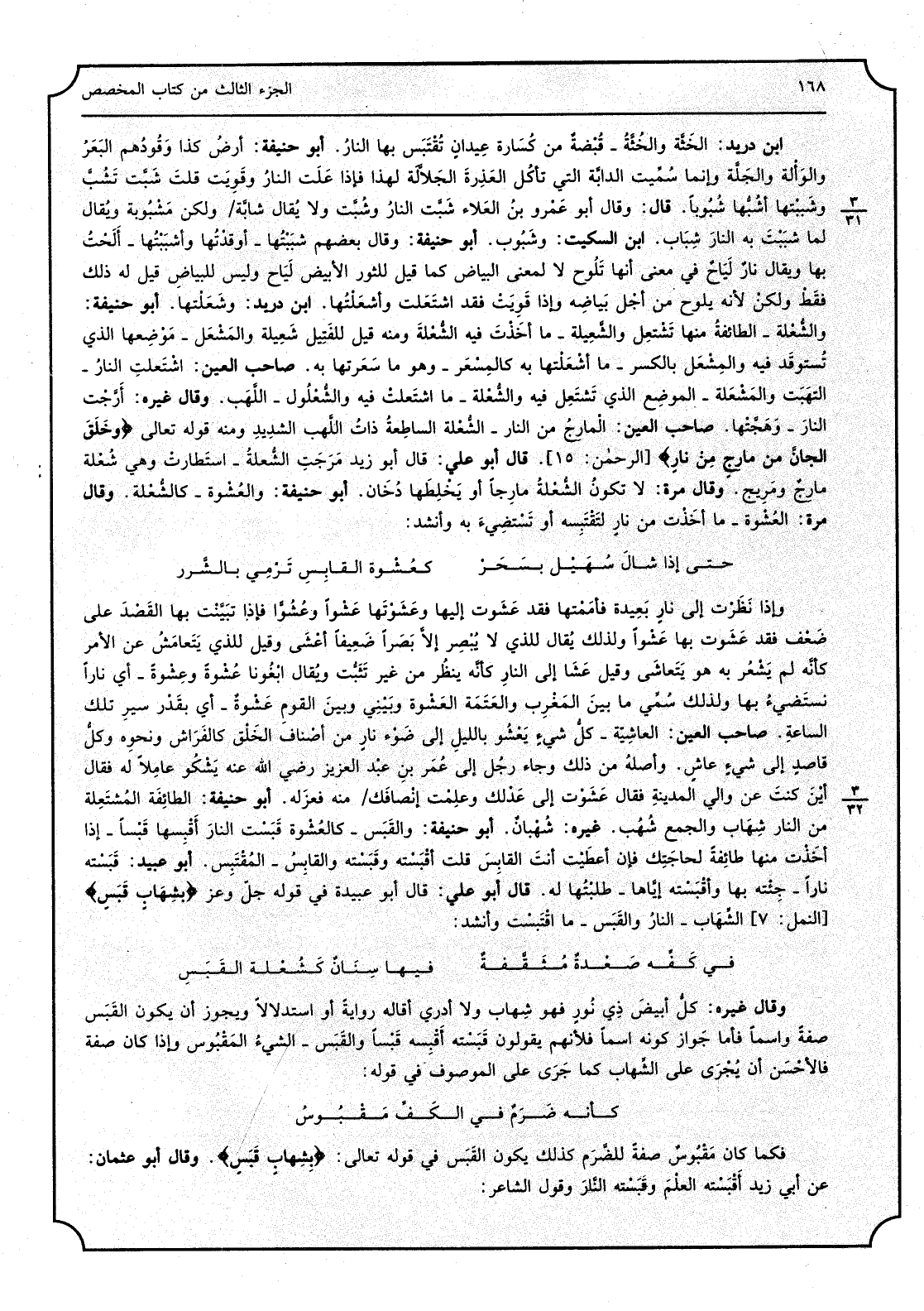 ابْن دُرَيْد الخثة والخثة - قبضةٌ من كسارة عيدانٍ تقتبس بهَا النَّار أَبُو حنيفَة أَرض كَذَا وقودهم البعر والوألة والجلة وَإِنَّمَا سميت الدَّابَّة الَّتِي تَأْكُل الْعذرَة الْجَلالَة لهَذَا فَإِذا علت النَّار وقويت قلت شبت تشب وشببتها أشبها شبوباً قَالَ وَقَالَ أَبُو عَمْرو بن الْعَلَاء شبت النَّار وشبت وَلَا يُقَال شَابة وَلَكِن مشبوبة وَيُقَال لما شببت بِهِ النَّار شباب ابْن السّكيت وشبوب أَبُو حنيفَة وَقَالَ بَعضهم شببتها - أوقدتها وأشببتها - ألحت بهَا وَيُقَال نارٌ لياحٌ فِي معنى أَنَّهَا تلوح لَا لِمَعْنى الْبيَاض كَمَا قيل للثور الْأَبْيَض لياح وَلَيْسَ للبياض قيل لَهُ ذَلِك فَقَط وَلَكِن لِأَنَّهُ يلوح من أجل بياضه وَإِذا قويت فقد اشتعلت وأشعلتها ابْن دُرَيْد وشعلتها أَبُو حنيفَة والشعلة - الطَّائِفَة مِنْهَا تشتعل والشعيلة - مَا اخذت فِيهِ الشعلة وَمِنْه قيل للفتيل شعيلة والمشعل - موضعهَا الَّذِي تستوقد فِيهِ والمشعل بِالْكَسْرِ - مَا أشعلتها بِهِ كالمسعر - وَهُوَ مَا سعرتها بِهِ صَاحب الْعين اشتعلت النَّار - التهبت والمشعلة - الْموضع الَّذِي تشتعل فِيهِ والشعلة - مَا اشتعلت فِيهِ والشعلول - اللهب وَقَالَ غَيره أرجت النَّار - وهجتها صَاحب الْعين المارج من النَّار - الشعلة الساطعة ذَات اللهب الشَّديد وَمِنْه قَوْله تَعَالَى: (وَخلق الجان من مارجٍ من نارٍ) قَالَ أَبُو عَليّ قَالَ أَبُو زيد مرجت الشعلة - استطارت وَهِي شعلة مارجٌ ومريج وَقَالَ مرّة لَا تكون الشعلة مارجاً أَو يخلطها دُخان أَبُو حنيفَة والعشوة - كالشعلة وَقَالَ مرّة العشوة - مَا أخذت من نارٍ لتقتبسه أَو تستضيء بِهِ وَأنْشد: حَتَّى إِذا شال سُهَيْل بِسحر كعشوة القابس ترمى بالشرر وَإِذا نظرت إِلَى نارٍ بعيدَة فأممتها فقد عشوت إِلَيْهَا وعشوتها عشواً وعشواً فَإِذا تبينت بهَا القص على ضعف فقد عشوت بهَا عشواً وَلذَلِك يُقَال للَّذي ى يبصر إلابصرا ضَعِيفا أعشى وَقيل للَّذي يتعامش عَن الْأَمر كَأَنَّهُ لم يشْعر بِهِ هُوَ يتعاشى وَقيل عشا إِلَى النَّار كَأَنَّهُ ينظر من غير تثبت وَيُقَال ابغونا عشوةً وعشوةً - أَي ناراص نستضيء بهَا وَلذَلِك سمي مَا بَين الْمغرب وَالْعَتَمَة العشوة وبيني وَبَين الْقَوْم عشوةٌ - أَي بِقدر سير تِلْكَ السَّاعَة صَاحب الْعين العاشية - كل شَيْء يعشو بِاللَّيْلِ إِلَى ضوء نارٍ من أَصْنَاف الْخلق كالفراش وَنَحْوه وكل قَاصد إِلَى شَيْء عاشٍ وَأَصله من ذَلِك وَجَاء رجل إِلَى عمر بن عبد الْعَزِيز رَضِي الله عَنهُ يشكو عَاملا لَهُ فَقَالَ أَيْن كنت عَن وَالِي الْمَدِينَة فَقَالَ عشوت إِلَى عدلك وَعلمت إنصافك مِنْهُ فَعَزله أَبُو حنيفَة الطَّائِفَة المشتعلة من النَّار شهَاب وَالْجمع شهب غَيره شهبانٌ أَبُو حنيفَة والقبس - كالعشوة قبست النَّار أقبسها قبساً - إِذا أخذت مِنْهَا طائفةٌ لحاجتك فَإِن أَعْطَيْت أَنْت القابس قلت أقبسته وقبسته والقابس - المقتبس أَبُو عبيد قبسته نَارا - جِئْته بهَا وأقبسته إِيَّاهَا - طلبتها لَهُ قَالَ أَبُو عَليّ قَالَ أَبُو عُبَيْدَة فِي قَوْله جلّ وَعز: (بشهابٍ قبسٍ) الشهَاب - النَّار والقبس - مَا اقتبست وَأنْشد: فِي كَفه صعدةٌ مثقفةٌ فِيهَا سنانٌ كشعلة القبس وَقَالَ غَيره كل أَبيض ذِي نورٍ فَهُوَ شهَاب وَلَا أَدْرِي أقاله رِوَايَة أَو اسْتِدْلَالا وَيجوز أَن يكون القبس صفة واسماً فَأَما جَوَاز كَونه اسْما فلأنهم يَقُولُونَ قبسته أقبسه قبساً والقبس - الشَّيْء المقبوس وَإِذا كَانَ صفة فَالْأَحْسَن أَن يجْرِي علىالشهاب كَمَا جرى على الْمَوْصُوف فِي قَوْله: كَأَنَّهُ ضرمٌ فِي الْكَفّ مقبوس فَكَمَا كَانَ مقبوسٌ صفة للضرم كَذَلِك يكون القبس فب قَوْله تَعَالَى بشهابٍ قبسٍ وَقَالَ أَبُو عُثْمَان عَن أبي زيد اقبسته الْعلم وقبسته النَّار وَقَول الشَّاعِر: