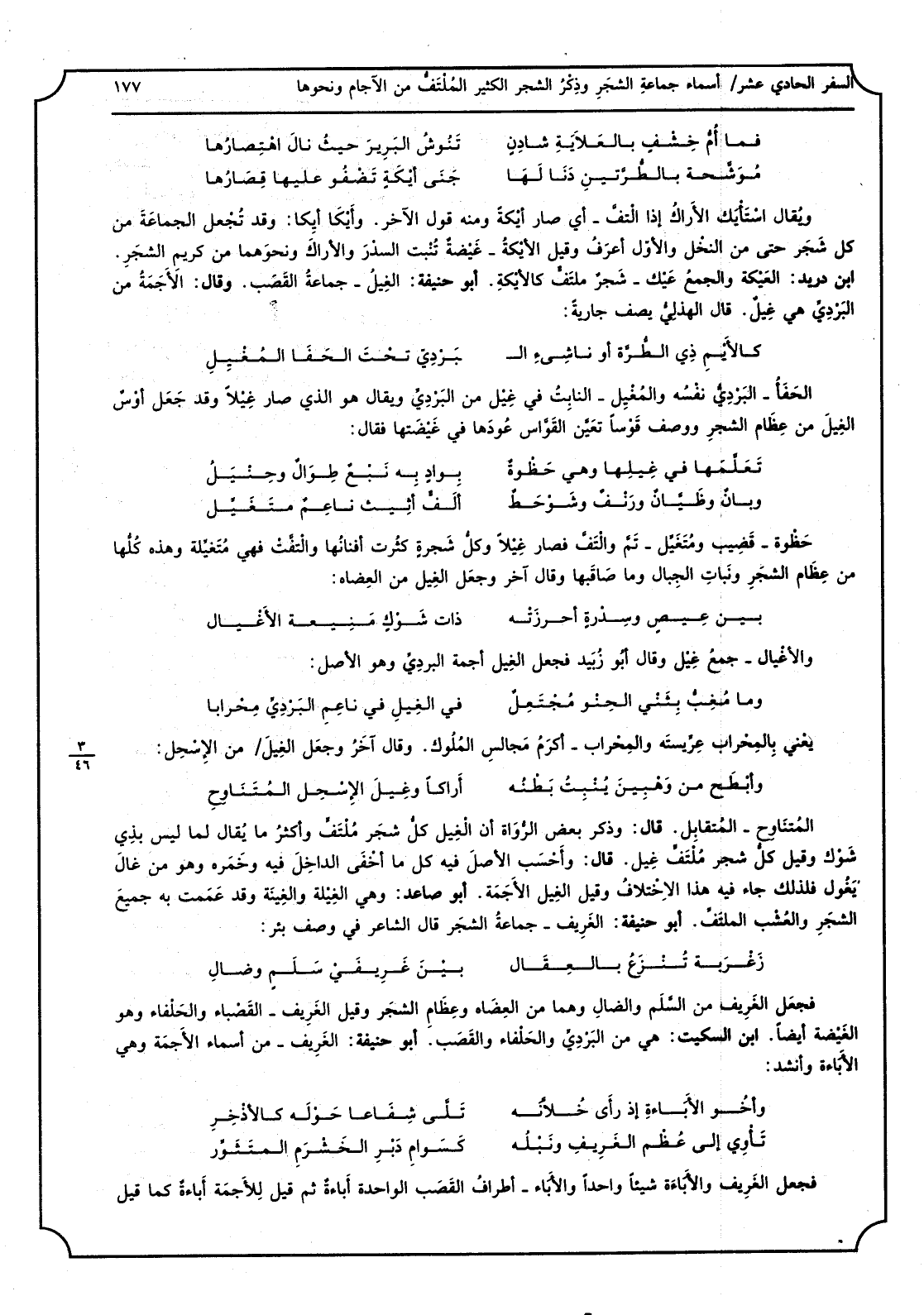 فَمَا أم خشفٍ بالعلاية شادنٍ تنوش البرير حَيْثُ نَالَ اهتصارها موشحة بالطرتين دنا لَهَا جنى أيكةٍ تضفو عَلَيْهَا قصارها وَيُقَال استأيك الأرك إِذا التف - أَي صَار ايكةً وَمِنْه قَول الآخر وأيكا أيكا وَقد تجْعَل الْجَمَاعَة من كل شجر حَتَّى من النّخل وَالْأول أعرف وَقيل الأيكة - غيضةٌ تنْبت السدر والأراك وَنَحْوهمَا من كريم الشّجر ابْن دُرَيْد العيكة وَالْجمع عيك - شجرٌ ملتفٌ كالأيكة أَبُو حنيفَة الغيل - جمَاعَة الْقصب وَقَالَ الأجمة من البردي هِيَ غيلٌ قَالَ الْهُذلِيّ يصف جَارِيَة: كالأيم ذِي الطرة أَو نَاشِئ ال بردي تَحت الحفا المغيل الحفأ - البردي نَفسه والمغيل - النَّابِت فِي غيل من البردي وَيُقَال هوالذي صَار غيلا وَقد جعل أوسٌ الغيل من عِظَام الشّجر وَوصف قوساً تعين القواس عودهَا فِي غيضها فَقَالَ: تعلمهَا فِي غيلها وَهِي خطوةٌ بوادبه نبعٌ طوالٌ وحثيل وبانٌ وظيانٌ ورنفٌ وشوحطٌ ألفٌ أثيثٌ ناعمٌ متغيل حظوة - قضيب ومتغيل - ثمَّ والتف فَصَارَ غيلا وكل شجرةٍ كثرت أفنانها والتفت فَهِيَ متغيلة وَهَذِه كلهَا من عِظَام الشّجر ونبات الْجبَال وَمَا صاقبها وَقَالَ: بَين عيص وسدرةٍ أحرزته ذَات شوكٍ منيعة الأغيال والأغيال - مَعَ غيل وَقَالَ أَبُو زبيد فَجعل الغيل أجمة البردي وَهُوَ الأَصْل: وَمَا مغب بثني الحنو مجتعلٌ فِي الغيل فِي ناعم البردي محرابا يَعْنِي بالمحراب عريسته والمحراب - أكْرم مجَالِس الْمُلُوك وَقَالَ آخر وَجعل الغيل من الأسخل: وأبطح من وهبين ينْبت بَطْنه أراكا وغيل الأسحل المتناوح المتناوح - المتقابل قَالَ وَذكر بعض الروَاة أَن الغيل كل شجر ملتف وَأكْثر مَا يُقَال لَيْسَ بِذِي شوك وَقيل كل شجر ملتف غيل قَالَ وأحسب الأَصْل فِيهِ كل مَا أخْفى الدَّاخِل فِيهِ وخمره وَهُوَ من غال يغول فَلذَلِك جَاءَ فِيهِ هَذَا الِاخْتِلَاف وَقيل الغيل الأجمة أَبُو صاعد وَهِي الغيلة والغينة وَقد عممت بِهِ جَمِيع الشّجر والعشب الملتف أَبُو حنيفَة الغريف - جمَاعَة الشّجر قَالَ الشَّاعِر فِي وصف بِئْر: زغربة تنْزع بالعقال بَين غريفي سلمٍ وضال فَجعل الغريف من السّلم والضال وهما من العضاه وَعِظَام الشّجر وَقيل الغريف - القصباء والحلفاء وَهُوَ الغيضة أَيْضا ابْن السّكيت هِيَ من البردي والحلفاء والقصب أَبُو حنيفَة الغريف - من أَسمَاء الأجمة وَهِي الاباءة وَأنْشد: وأخو الأبياءة إِذْ رأى خلانه تلى شفاعاً حوله كالأذخر تأوى إِلَى عظم الغريف ونبله كسوام دبر الخشرم المتؤر فَجعل الغريف والأباءة شيأ وَاحِدًا والأباء - أَطْرَاف الْقصب الْوَاحِدَة أباءةٌثم قيل للأجمة أباءةٌ كَمَا قيل