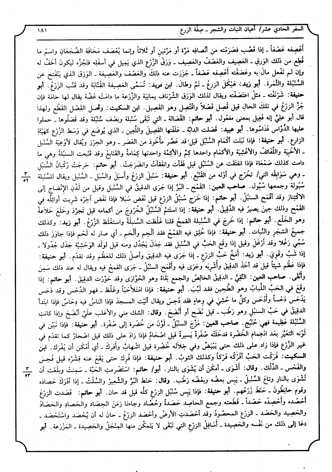 أعصفه عصفاً - إِذا قصب فصرمته من أنصافه مرّة أَو مرَّتَيْنِ أَو ثَلَاثًا وَإِنَّمَا يعصف مَخَافَة الضجعان وَاسم مَا قطع من ذَلِك الْوَرق - العصيف والعصف والعصيف - ورق الزَّرْع الَّذِي يمِيل فِي أَسْفَله فتجزه ليَكُون أخف لَهُ وَإِن لم تفعل مَال بِهِ وعصفته أعصفه عصفا - جززت عَنهُ ذَلِك والعصف والعصيفة - الْوَرق الَّذِي ينفتح عَن السنبلة والثملرة أَبُو زيد هيكل الزَّرْع - ثمَّ وَطَالَ ابْن دُرَيْد تسمى العصيفة القنابة وَقد قنب الزَّرْع أَبُو حنيفَة شرنفته - مثل اعتصفته وَيُقَال لذَلِك الْوَرق الشرناف يَمَانِية والزرعة مَا دَامَت غضة يُقَال لَهَا خامة فَإِن جز الزَّرْع فِي تِلْكَ الْحَال قيل قصل قصلا واقتصل وَهُوَ القصيل ابْن السّكيت وأصل القصل الْقطع وَلِهَذَا قَالَ أَبُو عَليّ إِنَّه فعيل بِمَعْنى مفعول أَبُو حَاتِم القصالة - الَّتِي تبقى سنبلة وَنصف سنبلة وَقد فصلوها - حملُوا عَلَيْهَا الدواس فداسوها أَبُو عبيد قصلت الدَّابَّة - علفتها القصيل واللعين - الَّذِي يوضع فِي وسط الزَّرْع كَهَيئَةِ الزَّارِع أَبُو حنيفَة فَإِذا نَبتَت أكمام السنبل قيل قد عصر مَأْخُوذ من الْعَصْر - وهوالحرز وَيُقَال لأوعية السنبل - الأخبية واللفائف والأغشية والأكمام وَاحِدهَا كمٌ والأكمة واحدتها كمامةٌ والقنابع وَقد قبعت السنبلة وَهِي مَا دَامَت كَذَلِك صمعاء فَإِذا انفتقت عَن السنبل قيل فقأت وانفقأت وانضرجت أَبُو حَاتِم خرجت ركبان السنبل - وَهِي سوابقه الَّتِي تخرج فِي أَوله من القنبع أَبُو حنيفَة سنبل الزَّرْع وأسبل والسبل - السنبل وَيُقَال للسنبلة سبولة وَجَمعهَا سبول صَاحب الْعين الْقَمْح - الْبر إِذا جرى الدَّقِيق فِي السنبل وَقيل من لدن الانضاج إِلَى الاكتناز وَقد أقمح السنبل أَبُو حَاتِم إِذا خرج سنبل الزَّرْع قيل نفض سبلا فَإِذا نفض آخِره شربت أَوَائِله فِي الْقَمْح وَذَلِكَ حِين يصير فِيهِ الدَّقِيق أبوحنيفة إِذا استتم السنبل الْخُرُوج من أكمامه قيل تجرد وخلع خلاعةً وَهُوَ الْخلْع أَبُو حَاتِم إِذا خرج فِي السنبلة الْقَمْح قُلْنَا غَلطت السنبلة واستغلظ الزَّرْع أَبُو زيد وَكَذَلِكَ جَمِيع الشّجر والنبات أبوحنيفة فَإِذا خلق فِيهِ الْقَمْح فقد ألحم وألحم - أَي صَار لَهُ لحم فَإِذا جَاوز ذَلِك سمي رغلاً وَقد أرغل وَقيل إِذا وَقع الْحبّ فِي السنبل فقد جدل يجدل وَمِنْه قيل لولد الوحشية جدل جدولا - إِذا شب وقوى أَبُو زيد أمخ الْحبّ الزَّرْع - إِذا جرى فِيهِ الدَّقِيق وأصل ذَلِك للعظم وَقد تقدم أَبُو حنيفَة فَإِذا عظم شيأ قيل قد أَخذ الدَّقِيق وأشربه وَجرى فِيهِ واقمح السنبل - جرى الْقَمْح فِيهِ وَيُقَال لَهُ عِنْد ذَلِك سمن وأنقى صَاحب الْعين النقي - الدَّقِيق الْخَالِص وَالْجمع نقاءٌ وَهُوَ الْحوَاري وَقد حورت الدَّقِيق أبوحاتم إِذا وَقع فِي الْحبّ اللّبَاب وَهُوَ الطحين فقد لبب أَبُو حنيفَة فَإِذا امْتَلَأَ حبا وَغلظ - فَهُوَ الدحس وَقد دحس يدحس دحساً وأدحس وكل مَا حشي فِي وعَاء فقد دحس وَيُقَال أتيت الْمَسْجِد فَإِذا النَّاس فِيهِ دحاسٌ فَإِذا ابْتَدَأَ الدَّقِيق فِي حب السنبل وَهُوَ رطب - قيل نضح وأنضح وَقَالَ الشَّك مني والأغلب على أنضج واذا كَانَت السنبلة عَظِيمَة فَهِيَ حنج صَاحب الْعين مزج السنبل - لون من خضرَة إِلَى صفرَة أبوحنيفة فاذا تين فِي لَونه التَّغَيُّر بعد ادهمام الخضرة فدخلته صفرَة يسيره قيل اصحام فاذا زَاد على ذَلِك قيل اصحار كَمَا تقدم فِي غير الزَّرْع فاذا زَاد على ذَلِك حَتَّى يبيض وَفِي خلاله خضرَة قيل اشهاب وأفرك - أى أمكن أَن يفرك ابْن السّكيت فركت الْحبّ أفركه فركا وَكَذَلِكَ الثَّوْب أبوحنيفة فاذا فرك حَتَّى يَقع عَنهُ قشرة قيل فحس والقحس - الدَّلْك وَقَالَ أشوى - أمكن أَن يشوىبالنار أبوحاتم استتضرمت الْحبَّة - سمنت وَبَلغت أَن تشوى بالنَّار وتاع السنبل - يبس بعضه وَبَعضه رطب وَقَالَ حنط الْبر وَالشعِير والسلت - اذا أدْر