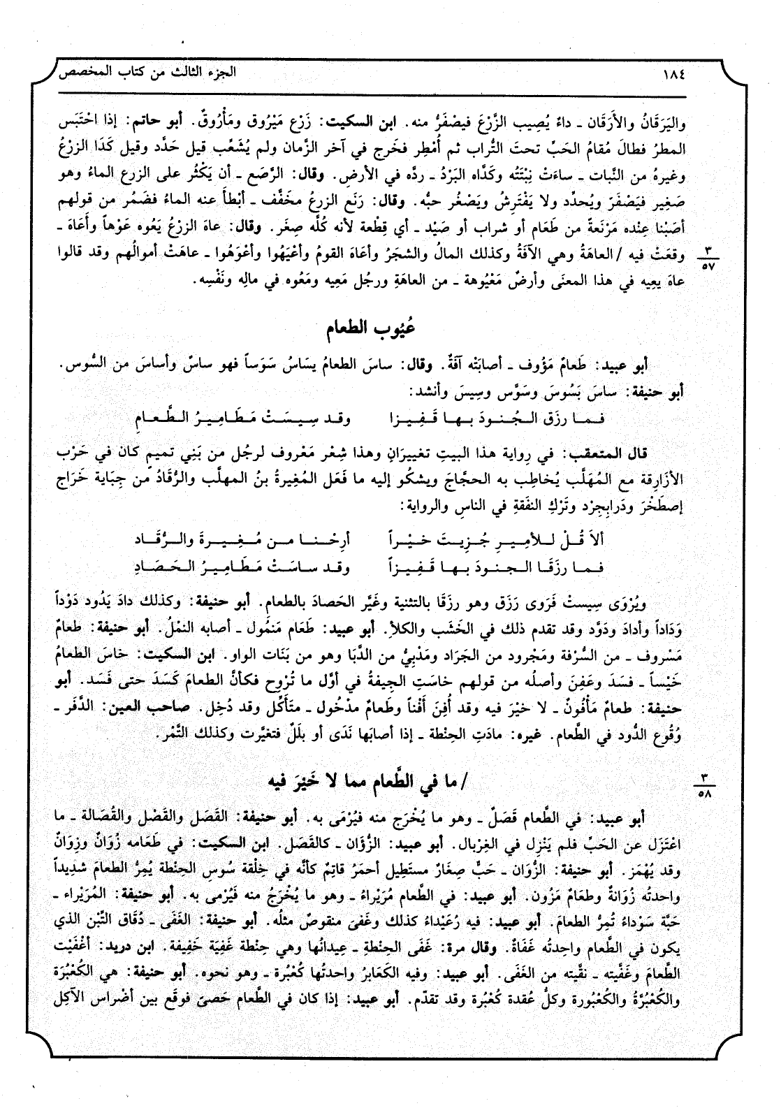 أبوعبيد فِي الطَّعَام قصل - وَهُوَ مَا يخرج مِنْهُ فَيَرْمِي بِهِ أبوحنيفة القصل والقصل والقصالة - مَا اعتزل عَن الْحبّ فَلم ينزل فِي الغربال أبوعبيد الزؤان - كالقصل ابْن السّكيت فِي طَعَامه زوان وزوان وَقد يهمز أبوحنيفة الزوان - حب صغَار مستطيل أَحْمَر قاتم كَأَنَّهُ فِي خلقَة سوس الْحِنْطَة يمر الطَّعَام شَدِيدا واحدته زوانة وَطَعَام مزون أبوعبيد فِي الطَّعَام مريراء - وَهُوَ مَا يخرج مِنْهُ فَيَرْمِي بِهِ أبوحنيفة المريراء - حَبَّة سَوْدَاء تمر الطَّعَام أبوعبيد فِيهِ رعيداء كَذَلِك وغفى مَنْقُوص مثله أبوحنيفة الغفى - دقاق التِّبْن الَّذِي يكون فِي الطَّعَام واحدته غفاء وَقَالَ مرّة غفى الْحِنْطَة - عيدانها وَهِي حِنْطَة غفية خَفِيفَة ابْن دُرَيْد أغفيت الطَّعَام وغفيته - نقيته من الغفى أبوعبيد وَفِيه الكعابر واحدتها كعبرة - وَهُوَ نَحوه أبوحنيفة هِيَ الكعبرة والكعبرة والكعبورة وكل عقدىة كعبرة وَقد تقدم أبوعبيد اذا كَانَ فِي الطَّعَام حَصى فَوَقع بَين أضراس الْآكِل
