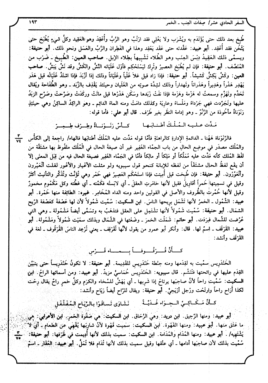طبخ بعد ذَلِك حَتَّى يؤتدم بِهِ وَيشْرب ولالا يغلى فقد ارتب وَهُوَ الرب وأعقد وَهُوَ العقيد وكل شيءٍ يطْبخ حَتَّى يثخن فقد أعقد أَبُو عبيد عقدته حَتَّى عقد يعْقد وَهَذَا فِي الفطران والرب وَالْعَسَل وَنَحْو ذَلِك أَبُو حنيفَة وَيُسمى ذَلِك العقيد دبس الْعِنَب وَهُوَ الطلاء تَشْبِيها بطلاء الابل صَاحب الْعين الطبيخ - ضرب من الْمنصف أَبُو حنيفَة فان لم يطْبخ الْعصير وَترك ليستحكم فَأول غليانه النش والكش وَقد نش ينش صَاحب الْعين وكش يكش كشيشاً أَبُو حنيفَة فَإِذا زَاد قيل غلا غلياً وغلياناً وَذَلِكَ إِذا أزبد فَإِذا اشْتَدَّ غليانه قيل هدر يهدر وهديراً وهدراناً وتهداراً وَذَلِكَ لشدَّة صَوته من الغليان وَحِينَئِذٍ يقذف بالزبد - وَهُوَ الطفاحة وَيُقَال تحدم وتهزم وَسمعت لَهُ هزمة وهزمة فَإِذا نفت زبدها وَسكن هدرها قيل مَاتَت وركدت وصرخت وَصرح الزّبد عَلَيْهَا وتجردت فَهِيَ جرداء وملساء وعارية وَكَذَلِكَ دَامَت وَمِنْه المَاء الدَّائِم - وَهُوَ الراكد السَّاكِن وَهِي حِينَئِذٍ رنوناةٌ مَأْخُوذَة من الرنو - وَهُوَ إدامة النّظر بِغَيْر طرف قَالَ أَبُو عَليّ فَأَما قَوْله: مدت عَلَيْهِ الْملك أطنابها كأسٌ رنوناةٌ وطرف طمز فالنرنوناة هَهُنَا - الدائمة الادارة كالراهنة فَأَما قَوْله مدت عَلَيْهِ الْملك أطنابها فالهاء رَاجِعَة إِلَى الكأس وَالْملك مصدر فِي مَوضِع الْحَال من بَاب الْجَمَّاء الْغَفِير غير أَن صِيغَة الْحَال فِي الْملك ملفوظ بهَا مُشْتَقَّة من لفظ الْملك كَأَنَّهُ مدت عَلَيْهِ مملكاً أَو ملكا أَو مَالِكًا فَأَما فِي الْجَمَّاء الْغَفِير فصيغة الْحَال فِيهِ من قبل الْمَعْنى إِلَّا أَن يَقع لفظ الْحَال مشتقاً من لَفظه للابانة كنحو قَول سِيبَوَيْهٍ وَلَو مثلت الأعيار والأعور لَقلت أتعيرون وأتعورون أَبُو حنيفَة فَإِن طبخت قيل أمينت فَإِذا استحكم الْعصير فَهِيَ خمر وَهِي تؤنث وتذكر والتأنيث أَكثر وَقيل فِي تَسْمِيَتهَا خمرًا أقاويل فَقيل لِأَنَّهَا خامرت الْعقل - أَي لابسته فكمته - أَي غطته وكل مكموم مخمورٌ وَقيل لِأَنَّهَا خمرت بالظروف وَالْأَصْل فِي الْقَوْلَيْنِ وَاحِد وَمِنْه الدَّاء المخامر غَيره الطَّائِفَة مِنْهَا خمرة أَبُو عبيد الشُّمُول - الْخمر لِأَنَّهَا تَشْمَل بريحها النَّاس ابْن السّكيت سميت شمولاً لِأَن لَهَا عصفة كعصفة الرّيح الشمَال أَبُو حنيفَة سميت شمولاً لِأَنَّهَا تشْتَمل على الْعقل فتذهب بِهِ وتشمى أَيْضا مشمولة - وَهِي الَّتِي عرضت للشمال فبردت أَبُو حَاتِم شملت الْخمر - وَضَعتهَا فِي الشمَال وَبِذَلِك سميت شمولاً ومشمولة أَبُو عبيد القرقف - اسمٌ لَهَا قَالَ وَأنكر أَبُو عَمْرو من يَقُول لِأَنَّهَا تقرقف - يَعْنِي ترْعد النَّاس القرقوف - لُغَة فِي القرقف وَأنْشد: كَأَن قرقوفاً بِمَاء قرس الخندريس سميت بِهِ لقدمها وَمِنْه حِنْطَة خندريس للقديمة أَبُو حنيفَة لَا تكون خندريساً حَتَّى يتَبَيَّن الْقدَم عَلَيْهَا فِي رائحتها فتنشم قَالَ سِيبَوَيْهٍ الخندريس خماسيٌ مزيدٌ أَبُو عبيد وَمن أسمائها الراح ابْن السّكيت سميت رَاحا لِأَن صَاحبهَا يرتاح إِذا شربهَا - أَي يهش للسخاء وَالْكَرم وكل خمر راحٌ يُقَال رحت لكذا أراح رَاحا وارتحت وَرجل أريحي أَبُو حنيفَة وَيُقَال للراح أَيْضا ريَاح وَأنْشد: كَأَن مكاكي الجواء غديةً نشاوى تساقوا بالرياح المفلفل أَبُو عبيد وَمِنْه الرَّحِيق ابْن دُرَيْد وَهِي الرحاق ابْن السّكيت هِيَ صفوة الْخمر ابْن الْأَعرَابِي هِيَ مَا عتق مِنْهَا أَبُو عبيد وَمِنْهَا القهوة ابْن السّكيت سميت قهوة لِأَن شاربها يقهى عَن الطَّعَام - أَي لَا يشتهيه أَبُو عبيد وَمِنْهَا المدام والمدامة ابْن السّكيت سميت بذلك لِأَنَّهَا أديمت فِي ظرفها أَبُو حنيفَة سميت بذلك لِأَن صَاحبهَا أدامها - أَي عتقهَا وَقيل سميت بذلك لِأَنَّهَا تدام فَلَا تمل أَبُو عبيد الْعقار - اسمٌ