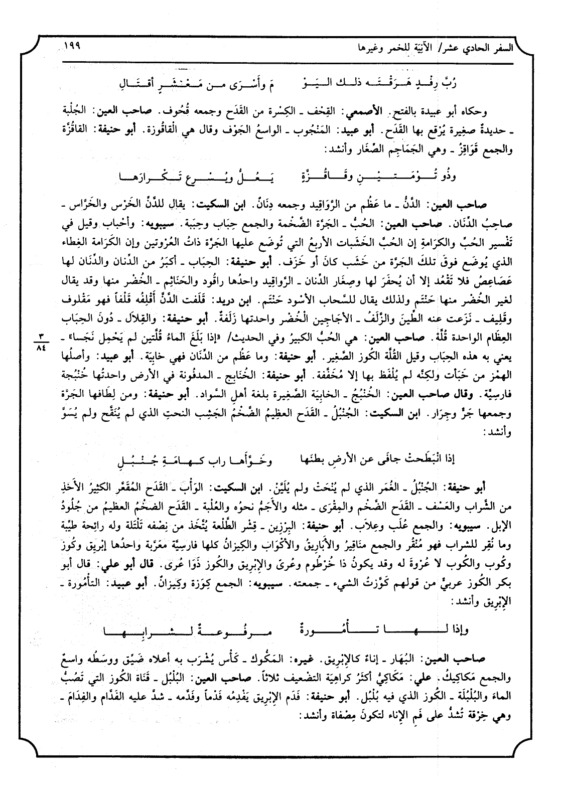 رب رفدٍ هرقته ذَلِك اليو م وَأسرى من معشرٍ أقتال وَحَكَاهُ أَبُو عُبَيْدَة بِالْفَتْح الْأَصْمَعِي القحف - الكسرة من الْقدح وَجمعه قحوف صَاحب الْعين الجلبة - حديدةٌ صَغِيرَة يرقع بهَا الْقدح أَبُو عبيد المنجوب - الْوَاسِع الْجوف وَقَالَ هِيَ القاقوزة أَبُو حنيفَة القاقزة وَالْجمع قواقز - وَهِي الجماجم الصغار وَأنْشد: وَذُو تومتين وقاقزةٍ يعل ويسرع تكرارها صَاحب الْعين الدن - مَا عظم من الرواقيد وَجمعه دنانٌ ابْن السّكيت يُقَال للدن الخرس والخراس - صَاحب الدنان صَاحب الْعين الْحبّ - الجرة الضخمة والجمه حباب وحببة سِيبَوَيْهٍ وأحباب وَقيل فِي تَفْسِير الْحبّ والكرامة إِن الْحبّ الخشبات الْأَرْبَع الَّتِي تُوضَع عَلَيْهَا الجرة ذَات العروتين وَإِن الْكَرَامَة الغطاء الَّذِي يوضع فَوق تِلْكَ الجرة من خشب كَانَ أَو خزف أَبُو حنيفَة الْحباب - أكبر من الدنان والدنان لَهَا عصاعص فَلَا تقعد إِلَّا أَن يحْفر لَهَا وصغار الدنان - الرواقيد وَاحِدهَا راقود والحنائم - الْخضر مِنْهَا وَقد يُقَال لغير الْخضر مِنْهَا حنتم وَلذَلِك يُقَال للسحاب الْأسود حنتم ابْن دُرَيْد قلفت الدن أقلفه قلفاً فَهُوَ مقلوف وقليف - نزعت عَنهُ الطين والزلف - الأجاجين الْخضر واحدتها زلفةٌ أَبُو حنيفَة والقلال دون الْحباب الْعِظَام الْوَاحِدَة قلَّة صَاحب الْعين هِيَ الْحبّ الْكَبِير وَفِي الحَدِيث (إِذا بلغ المَاء قُلَّتَيْنِ لم يحمل نجسا) - يَعْنِي بِهِ هَذِه الْحباب وَقيل الْقلَّة الْكوز الصَّغِير أَبُو حنيفَة وَمَا عظم من الدنان فَهِيَ خابية أَبُو عبيد وَأَصلهَا الْهَمْز من خبأت وَلكنه لم يلفظ بهَا إِلَّا مُخَفّفَة أَبُو حنيفَة الخنايج - المدفونة فِي الأَرْض واحدتها خنبجة فارسية وَقَالَ صَاحب الْعين الخضج - الخابية الصَّغِيرَة بلغَة أهل السوَاد أَبُو حنيفَة وَمن لطافها الجرة وَجَمعهَا جر وجرار ابْن السّكيت الجنبل - الْقدح الْعَظِيم الضخم الجشب النحت الَّذِي لم ينقح وَلم يسو وَأنْشد: إِذا انبطحت جافي عَن الأَرْض بَطنهَا وخوأها راب كهامة جنبل أَبُو حنيفَة الجنبل - الْغمر الَّذِي لم ينحت وَلم يلين ابْن السّكيت الوأب - الْقدح المقعر الْكثير الْأَخْذ من الشَّرَاب والعسف - الْقدح الضخم والمقرى - مثله والأجم نَحوه والعلبة - الْقدح الضخم الْعَظِيم من جُلُود الابل سِيبَوَيْهٍ وَالْجمع علب وعلاب أَبُو حنيفَة البرزين - قشر الطلعة يتَّخذ من نصفه تلتلة وَله رَائِحَة طيبَة وَمَا نقر للشراب فَهُوَ منقر وَالْجمع مناقير والأباريق والأكواب والكيزان كلهَا فارسية معربة وَاحِدهَا إبريق وكوز وكوب والكوب لَا عُرْوَة لَهُ وَقد يكون ذَا خرطوم وعرى والأبريق والكوز ذَوا عرى قَالَ أَبُو عَليّ قَالَ أَبُو بكر الْكوز عربيٌ من قَوْلهم كوزت الشَّيْء - جمعته سِيبَوَيْهٍ الْجمع كوزة وكيزان أَبُو عبيد التأمورة - الابريق وَأنْشد: وَإِذا لَهَا تأمورةٌ مرفوعةٌ لشرابها صَاحب الْعين البهار - إناءٌ كالابريق غَيره المكوك - كأس يشرب بِهِ أَعْلَاهُ ضيق ووسطه واسعٌ وَالْجمع مكاكيك عَليّ مكاكي أَكثر كَرَاهِيَة التَّضْعِيف ثَلَاثًا صَاحب الْعين البلبل - قناة الْكوز الَّتِي تصب المَاء والبلبلة - الْكوز الَّذِي فِيهِ بلبل أَبُو حنيفَة فدم الابريق يفدمه فدماً وفدمه - شدّ عَلَيْهِ الْفِدَام والفدام - وَهِي خرقَة تشد على فَم الاناء لتَكون مصفاة وَأنْشد: