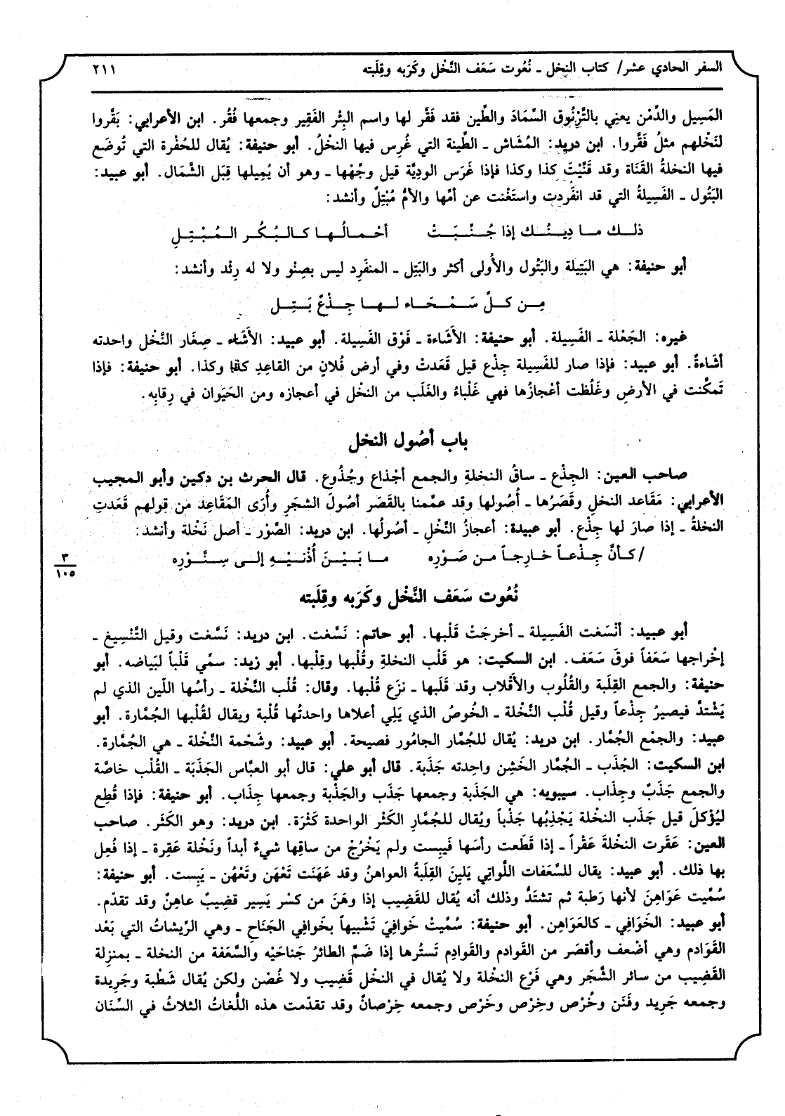 المسيل والدمن يَعْنِي بالترنوق السماد والطين فقد فقر لَهَا وَاسم الْبِئْر الْفَقِير وَجَمعهَا فقر ابْن الْأَعرَابِي بَقَرُوا لنخلهم مثل فقروا ابْن دُرَيْد المشاش - الطينة الَّتِي غرس فِيهَا النّخل أبوحنيفة يُقَال للحفرة الَّتِي تُوضَع فِيهَا النَّخْلَة الْقَنَاة وَقد قنيت كَذَا وَكَذَا فَإِذا غرس الودية قيل وَجههَا - وَهُوَ أَن يميلها قل الشمَال أَبُو عبيد البتول - الفسيلة الَّتِي قد انْفَرَدت واستغنت عَن أمهَا وَالأُم مبتلٌ وَأنْشد: ذَلِك مَا دينك إِذْ جنبت أحمالها كالبكر المبتل أَبُو حنيفَة هِيَ البتلة والبتول وَالْأولَى أَكثر والبتل - الْمُنْفَرد لَيْسَ بصنو وَلَا لَهُ رئد وَأنْشد: من كل سمحاء لَهَا جذع بتل غَيره الجعلة - الفسيلة أَبُو حنيفَة الأشاءة - فَوق الفسيلة أَبُو عبيد الأشاء - صغَار النّخل واحدته أشاءةٌ أَبُو عبيد فَإِذا صَار للفسيلة جذع قيل قعدت وَفِي أَرض فلانٍ من الْقَاعِد كَذَا وَكَذَا أَبُو حنيفَة فَإِذا تمكنت فِي الأَرْض وغلظت أعجازها فَهِيَ غلباء والغلب من النّخل فِي أعجازه وَمن الْحَيَوَان فِي رقابه