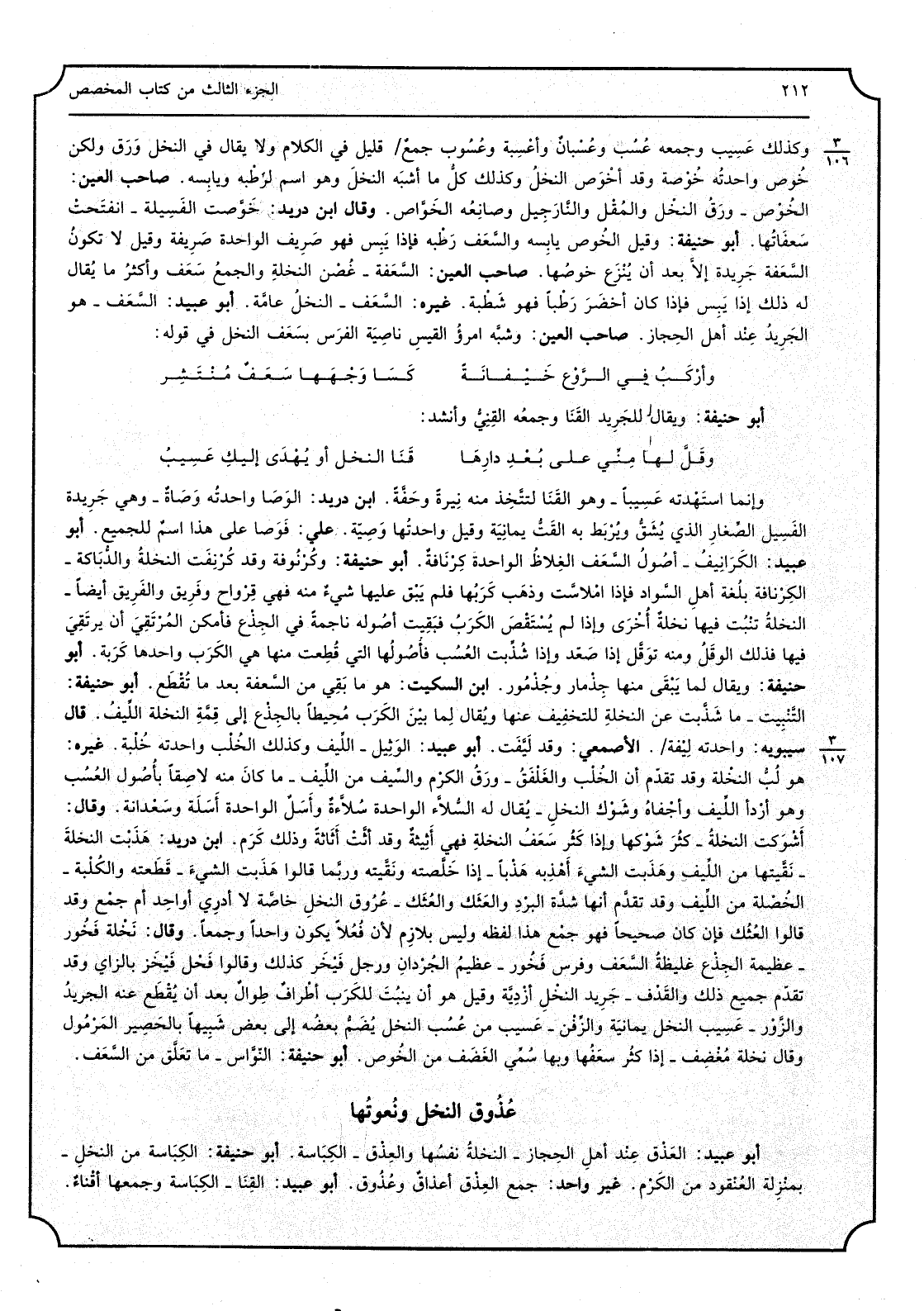 وَكَذَلِكَ عسيب وَجمعه عسب وعسبان وأعسبة وعسوب جمع قَلِيل فِي الْكَلَام ولايقال فِي النّخل ورق وَلَكِن خوص واحدته خوصَة وَقد أخوص النّخل وَكَذَلِكَ كل مَا أشبه النّخل وَهُوَ اسْم لرطبه ويابسه صَاحب الْعين الخوص - ورق النّخل والمقل وَالنَّار وصانعه الْخَواص وَقَالَ ابْن دُرَيْد خوصت الفسيلة - انفتحت سعفاتها أبوحنيفة وَقيل الخوص يابسه وَالسَّعَف رطبه فاذا يبس فَهُوَ صريف الْوَاحِدَة صريفة وَقيل لاتكون السعفة جَرِيدَة الا بعد أَن ينْزع خوصها صَاحب الْعين السعفة - غُصْن النَّخْلَة وَالْجمع سعف وَأكْثر مَا يُقَال لَهُ ذَلِك اذا يبس فاذا كَانَ أَخْضَر رطبا فَهُوَ شطبة غَيره السعف - النّخل عَامَّة أبوعبيد السعف - هُوَ الجريد عِنْد أهل الْحجاز صَاحب الْعين وَشبه امْرُؤ الْقَيْس نَاصِيَة الْفرس بسعف النّخل فِي قَوْله: واركب فِي الروع خيفانة كسا وَجههَا سعف منتشر أبوحنيفة وَيُقَال للجريد القنا وَجمعه القنى أنْشد: وَقل لَهَا منى على بعد دارها قِنَا النّخل أَو يهدي اليك عسيب وانما استهدته عسيبا - وَهُوَ القنا لتتخذ مِنْهُ نيرة وحفة ابْن دُرَيْد الوصا واحدته وصاة - وَهِي جَرِيدَة الفسيل الصغار الَّذِي يشق ويربط بِهِ القت يَمَانِية وَقيل واحدتها وَصِيَّة عَليّ فوصا على هَذَا اسْم للْجَمِيع أبوعبيد الكرانيف - أصُول السعف الْغِلَاظ الْوَاحِدَة كرنافة أبوحنيفة وكرنوفة وَقد كرنفت النَّخْلَة والدباكة - الكرنافة بلغَة أهل السوَاد فاذا املاست وَذهب كربها فَلم يبْق عَلَيْهَا شئ مِنْهُ فَهِيَ قرواح وفريق والفريق أَيْضا - النَّخْلَة تنيت فِيهَا نَخْلَة أُخْرَى واذا لم يستقص الكرب فَبَقيت أُصُوله ناجمة فِي الْجذع فَأمكن المرتقى أَن يرتقي فِيهَا فَذَلِك الوقل وَمِنْه توقل اذا صعد واذا شذبت العسب فأصولها الَّتِي قطعت مِنْهَا هِيَ الكرب وَاحِدهَا كربَة أبوحنيفة وَيُقَال لما يبْقى مِنْهَا جذمار وجذمور ابْن السّكيت هُوَ مَا بَقِي من السعفة بعد مانقطع أبوحنيفة التنبيت - مَا شذبت عَن النَّخْلَة للتَّخْفِيف عَنْهَا وَيُقَال لما بَين الكرب محيطا بالجذع إِلَى قمة النَّخْلَة الليف قَالَ سيبوبه واحدته ليفة الاصمعي وَقد ليفت أبوعبيد الوثيل - الليف وَكَذَلِكَ الخلب واحدته خلبة غَيره هُوَ لب النَّخْلَة وَقد تقدم أَن الخلب والغلفق - ورق الْكَرم وَالسيف من الليف - مَا كَانَ لاصقاً باصول العسب وَهُوَ أردأ الليف وأجفاه وَشَوْك النّخل - يُقَال لَهُ السلاء الْوَاحِدَة سلاءة وأسل الْوَاحِدَة أسلة وسعدانة وَقَالَ أشوكت النَّخْلَة - كثر شَوْكهَا واذا كثر سعف النَّخْلَة فَهِيَ أثيثة وَقد أثت أَثَاثَة وذلككرم ابْن دُرَيْد هذبت النَّخْلَة - نقيتها من الليف وهذبت الشئ أهذبه هذبا - اذا خلصته ونقيته وَرُبمَا قَالُوا هذبت الشئ - قطعته والكلبة - الْخصْلَة من الليف وَقد تقدم أَنَّهَا شدَّة الْبرد والثك والعثك - عروق النّخل خَاصَّة لاأدري أَو وَاحِد أم جمع وَقد قَالُوا العثك فان كَانَ صَحِيحا فَهُوَ جمع هَذَا لَفظه وَلَيْسَ بِلَازِم لِأَن فعلا يكون وَاحِدًا وجمعا وَقَالَ نَخْلَة فخور - عَظِيمَة الْجذع غَلِيظَة السعف وَفرس فخور - عَظِيم الجردان وَرجل فيخر كَذَلِك وَقَالُوا فَحل فيخر بالزاي وَقد تقدم جَمِيع ذَلِك والقدف - جريد النّخل أزدية وَقيل هُوَ أَن ينْبت للكرب أَطْرَاف طوال بعد أَن يقطع عَنهُ الجريد والزور - عسيب النّخل يَمَانِية والزفن - عسيب من عسب النّخل يضم بعضه إِلَى بعض شَبِيها بالحصير المرمول وَقَالَ نَخْلَة مغضف - اذا كثر سعفها وَبهَا سمى الغضف من الخوص أبوحنيفة النواس - مَا تعلق من السعف