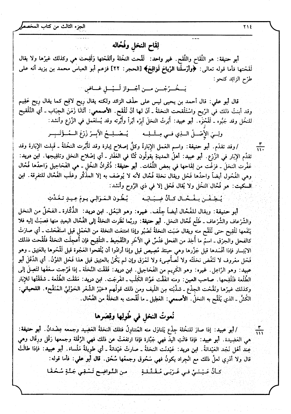 أبوحنيفة هُوَ اللقَاح واللقح غير وَاحِد لقحت النَّخْلَة وألقحتها ولقحت هِيَ وَكَذَلِكَ غَيرهَا ولايقال لقحتها فَأَما قَوْله تَعَالَى (وَأَرْسَلْنَا الرِّيَاح لَوَاقِح) فَزعم أَبُو الْعَبَّاس مُحَمَّد بن يزِيد أَنه على طرح الزَّائِد كنحو يخْرجن من أجواز ليل غاض قَالَ أَبُو عَليّ قَالَ أَحْمد بن يحيى لَيْسَ على حذف الزَّائِد وَلكنه يُقَال ريح لاقح كَمَا يُقَال ريح عقيم وَقد أبنت ذَلِك فِي الرّيح واستلقحت النَّخْلَة - آن لَهَا أَن تلقح الْأَصْمَعِي أَتَانَا زمن الْجبَاب - أَي التلقيح للنخل وَقد جبوه - لقحوه أَبُو عبيد أبرت النّخل آبره أبرا وأبرته وَقد يسْتَعْمل فِي الزَّرْع وَأنْشد: ولي الأَصْل الَّذِي فِي مثله يصلح الآبر زرع المؤتبر وَقد تقدم أبوحنيفة وَاسم الْعَمَل الابارة وكل إصْلَاح إبارة وَقد تأبرت النَّخْلَة - قبلت الابارة وَقد تقدم الْآبَار فِي الزَّرْع أبوعبيد أهل الْمَدِينَة يَقُولُونَ كُنَّا فِي العفار - أَي إصْلَاح النّخل وتلقيحها ابْن دُرَيْد عفرت النّخل - فرغت من لفاحها فِي بعض اللُّغَات أبوحنيفة ذكران النّخل - هِيَ الفحاحيل وَاحِدهَا فحال وَهِي الفحول أَيْضا وَاحِدهَا فَحل وَيُقَال نَخْلَة فحال لِأَنَّهُ لايوصف بِهِ الا الْمُذكر وَغلب الفحال للتفرقة ابْن السّكيت هُوَ فحال النّخل ولايقال فَحل الا فِي ذِي الرّوح وَأنْشد: يطفن بفحال كَأَن ضبابه بطُون الموَالِي يَوْم عيد تغدت أبوحنيفة وَيُقَال للفحال أَيْضا جلف غَيره وَهُوَ البعل ابْن دُرَيْد الذكارة - الْفَحْل من النّخل والشرعاف والشرعاف - طلع فحال النّخل أبوحنيفة وَرُبمَا نظرت النَّخْلَة إِلَى الفحال الْبعيد مِنْهَا فصبت اليه فَلَا ينفعها تلقيح حَتَّى تلقح مِنْهُ وَيُقَال صبَّتْ النَّخْلَة تصبو واذا امْتنعت النَّخْلَة من الْحمل قيل استفحلت - أَي صَارَت كالفحل والحرق - اسْم ماأخذ من الْفَحْل فَدس فِي الآخر والتقحيط - التلقيح فان أعجلت النَّخْلَة فلقحت فَذَلِك الابتسار فاذا أفسدها قيل جزرها وَهِي حِينَئِذٍ مصيص قيل واذا أَرَادوا أَن يلقحوا الْعَجْوَة قيل لفحوها بالعتيق - وَهُوَ فَحل مَعْرُوف لاتنفض نخلته ولاتصأصئ ولاتمرق وان لم يكن بالعتيق قيل هَذَا فَحل اللَّوْن أَي الدقل أبوعبيد وَهُوَ الراعل غَيره وَهُوَ الْكَرِيم من الفحاحيل ابْن دُرَيْد فققت النَّخْلَة - اذا فرجت سعفها لتصل إِلَى الطلعة فتلقحها صَاحب الْعين وَمِنْه انفقت عواء الْكَلْب - انفرجت ابْن دُرَيْد مققت الطلعة - شققتها للآبار وَكَذَلِكَ غَيرهَا ونقحت الْجذع - شذبته من الليف وَمن قَوْلهم (خير الشّعْر الحولي المنفتح) اللحياني الكش - الَّذِي يلقح بِهِ النّخل الاصمعي العطيل - مَا لقحت بِهِ النَّخْلَة من الفحال