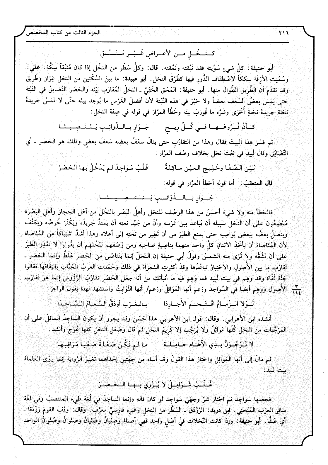 كنخلٍ من الْأَعْرَاض غير منبثق أَبُو حنيفَة كل شيءٍ سويته فقد نبقته ونمقته قَالَ وكل سطر من النّخل إِذا كَانَ منبقاً سكَّة عَليّ وَسميت الْأَزِقَّة سككا لاصطفاف الدّور فِيهَا كطرق النّخل أَبُو عُبَيْدَة مَا بَين السكتين من النّخل غرار وَطَرِيق وَقد تقدم أَن الطَّرِيق الطوَال مِنْهَا أَبُو حنيفَة المحق الْخَفي - النّخل المقارب بَينه والحصر - التضايق فِي النبتة حَتَّى يمس بعض السعف بَعْضًا وَلَا خير فِي هَذِه النبتة لِأَن أفضل الْغَرْس مَا بوعد مِنْهُ حَتَّى لَا تمس جَرِيدَة نَخْلَة جَرِيدَة نخلةٍ أُخْرَى وشره مَا قورب بَينه وَخطأ المرار فِي قَوْله فِي صفة النّخل: كَأَن فروعها فِي كل ريحٍ جوارٍ بالذوائب ينتصبنا ثمَّ فسر هَذَا الْبَيْت فَقَالَ وَهَذَا من التقارب حَتَّى ينَال سعف بعضه سعف بعضٍ وَذَلِكَ هُوَ الْحصْر - أَي التضايق وَقَالَ لبيد فِي نعت نخل بِخِلَاف وصف المرار: بَين الصَّفَا وخليج الْعين ساكنةٌ غلبٌ سواجد لم يدْخل بهَا الْحصْر قَالَ المتعقب أما قَوْله أَخطَأ المرار فِي قَوْله: جوَار بالذوائب ينتصينا فالخطأ مِنْهُ وَلَا شَيْء أحسن من هَذَا الْوَصْف للنخل وَأهل الْبَصَر بِالنَّخْلِ من أهل الْحجاز وَأهل الْبَصْرَة مجمعون على أَن النّخل سَبيله أَن يباعد بَين غرسه وَأَن من جيد نَعته أَن يَمْتَد جريده وَيكثر خوصه ويكثف ويتصل بعضه بِبَعْض يواصيه حَتَّى يمْنَع الطير من أَن تطير من تَحْتَهُ إِلَى أَعْلَاهُ وَهَذَا أَشد اشتباكاً من المناصاة لِأَن المناصاة أَن يَأْخُذ الِاثْنَان كل وَاحِد مِنْهُمَا بناصية صَاحبه وَمن وَصفهم لنخلهم أَن يَقُولُوا لَا تقدر الطير على أَن تشقه وَلَا ترى مِنْهُ الشَّمْس وَقَول أبي حنيفَة إِن النّخل إِنَّمَا يتناصى من الْحصْر غلطٌ وَإِنَّمَا الْحصْر - تقَارب مَا بَين الْأُصُول وَالِاخْتِيَار تباعدها وَقد أكثرت الشُّعَرَاء فِي ذَلِك وحمدت الْعَرَب الجنات بالتفافها فَقَالُوا جنَّة لفاء وَقد وهم فِي بَيت لبيد فَمَا وهم فِيهِ مَا أَنْبَأتك من أَنه جعل الْحصْر تقَارب الرؤس وَإِنَّمَا هُوَ تقَارب الْأُصُول وَوهم أَيْضا فِي السواجد وَزعم أَنَّهَا الموائل وَزعم أَنَّهَا الثوابت وَاسْتشْهدَ لهَذَا بقول الراجز: لَوْلَا الزِّمَام اقتحم الأجاردا بالغرب أَو دق النعام الساجدا أنْشدهُ ابْن الْأَعرَابِي وَقَالَ قَول ابْن الْأَعرَابِي هَذَا حسن وَقد يجوز أَن يكون الساجد المائل على أَن المرجبات من النّخل كلهَا موائل وَلَا يرجب إِلَّا كريم النّخل ثمَّ قَالَ وصعل النّخل كلهَا عوج وَأنْشد: لَا ترجون بِذِي الأظام حاملةً مَا لم تكن صعلة صعباً مراقيها ثمَّ مَال إِلَى أَنَّهَا الموائل وَاخْتَارَ هَذَا القَوْل وَقد أَسَاءَ من جِهَتَيْنِ إِحْدَاهمَا تَغْيِير الرِّوَايَة إِنَّمَا روى الْعلمَاء بَيت لبيد: غلبٌ شوامل لَا يزرى بهَا الْحصْر فَجَعلهَا سواجد ثمَّ اخْتَار شَرّ وَجْهي سواجد لَو كَانَ قَالَه وانما الساجد فِي لُغَة طئ المنتصب وَفِي لُغَة سَائِر الْعَرَب المنحني ابْن دُرَيْد الرزدق - السطر من النّخل وَغَيره فَارسي مُعرب وَقَالَ وقف الْقَوْم رزدقا - أَي صفا أبوحنيفة واذا كَانَت النخلات فِي أصل وَاحِد فَهِيَ أصناء وصنيان وصنيان وصنوان وصنوان الْوَاحِد