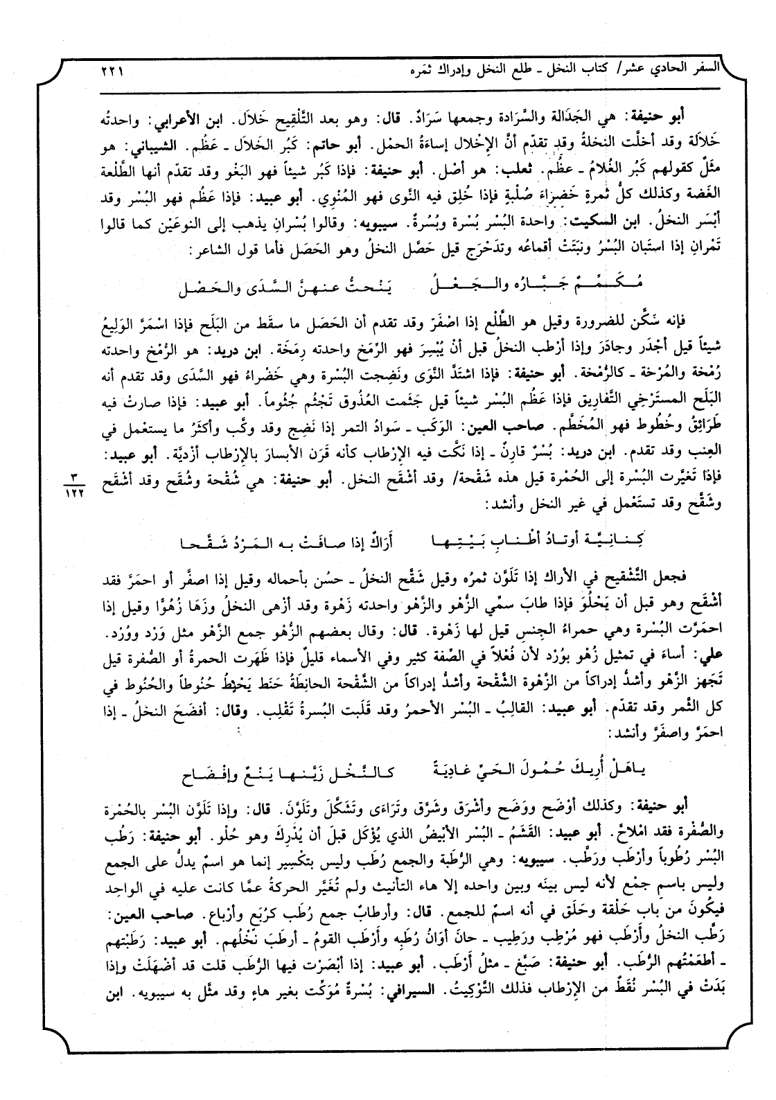 أبوحنيفة هِيَ الجدالة والسرداة وَجَمعهَا سراد قَالَ وَهُوَ بعد التلقيح خلال ابْن الاعرابي واحدته خلالة وَقد أخلت النَّخْلَة وَقد تقدم أَن الاخلال إساءة الْحمل أبوحاتم كبر الخهلال - عظم الشَّيْبَانِيّ هُوَ مثل كَقَوْلِهِم كبر الْغُلَام - عظم ثَعْلَب هُوَ أصل أبوحنيفة فاذا كبر شيأ فَهُوَ البغو وَقد تقدم أَنَّهَا الطلعة الغضة وَكَذَلِكَ كل ثَمَرَة خضراء صلبة فاذا خلق فِيهِ النَّوَى فَهُوَ المنوى أَبُو عبيد فاذا عظم فَهُوَ الْبُسْر وَقد أبسر النّخل ابْن السّكيت وَاحِدَة الْبُسْر بسرة وبسرة سيبوبه وَقَالُوا بسران يذهب إِلَى النَّوْعَيْنِ كَمَا قَالُوا تمران اذا استبان الْبُسْر ونبتت أقماعه وتدحرج قيل حصل النّخل وَهُوَ الحصل فَأَما قَول الشَّاعِر: مكمم جباره والجعل ينحت عَنْهُن السدى والحصل فانه سكن للضَّرُورَة وَقيل هُوَ الطّلع اذا اصفر وَقد تقدم أَن الحصل مَا سقط من البلح فانه اسمر الوليع شيأ قيل أَجْدَر وجادر واذا أرطب النّخل قبل أَن يبسر فَهُوَ الرمخ واحدته رمخة ابْن دُرَيْد هُوَ الرمخ واحدته رمخة والمرخة - كالرمخة أبوحنيفة فاذا اشْتَدَّ النَّوَى ونضجت البسرة وَهِي خضراء فَهُوَ السدى وَقد تقدم أَنه البلح المسترخي التفاريق فاذا عظم البير شيأ قيل جثمت العذوق تجثم جثوما أبوعبيد فاذا صَارَت فِيهِ طرائق وخطوط فَهُوَ المخطم صَاحب الْعين الوكب - سَواد التَّمْر اذا نضج وَقد وكب وَأكْثر مايستعمل فِي الْعِنَب وَقد تقدم ابْن دُرَيْد بسر قَارن - اذا نكت فِيهِ الارطاب كَأَنَّهُ قرن الابار بالارطاب أزدية أبوعبيد فاذا تَغَيَّرت البسرة قيل هَذِه شقحة وَقد أشقح النّخل أبوحنيفة هِيَ شقحة وشقح وَقد أشقح وشقح وَقد تسْتَعْمل فِي غير النّخل وَأنْشد: كنانية أوتاد أطناب بَيتهَا أَرَاك اذا صافت بِهِ المرد شقحا فَجعل التشقيح فِي الْأَرَاك تلون ثمره وَقيل شقح النّخل - حسن بأحماله وَقيل اذا اصفر أَو احمر فقد أشقح وَهُوَ قبل أَن يحلو فاذا طَابَ سمى الزهو والزهو واحدته زهوة وَقد أزهى النّخل وزها زهوا وَقيل اذا احْمَرَّتْ البسرة وَهِي حَمْرَاء الْجِنْس قيل لَهَا زهوة قَالَ وَقَالَ بَعضهم الزهو جمع الزهو مثل ورد وَورد عَليّ أَسَاءَ فِي تَمْثِيل زهو بورد لِأَن فعلا فِي الصّفة كثير وَفِي الْأَسْمَاء قَلِيل فاذا ظَهرت الْحمرَة أَو الصُّفْرَة قيل تجْهر الزهو وَأَشد إدراكا من الزهوة الشقحة وَأَشد إدراكا من الشقحة الحانطة حنط يحنط حنوطا والحنوط فِي كل الثَّمر وَقد تقدم أبوعبيد القالب - الْبُسْر الْأَحْمَر وَقد قلبت البسرة تقلب وَقَالَ أفضح النّخل - اذا احمر واصفر وَأنْشد: ياهل أريك حمول الْحَيّ غادية كالنخل زينها ينع وإفضاح أبوحنيفة وَكَذَلِكَ أوضح ووضح وأشرق وشرق وتلون قالواذا تلون الْبُسْر بالحمرة والصفرة فقد املاح أبوعبيد القشم - الْبُسْر الْأَبْيَض الَّذِي يُؤْكَل قبل أَن يدْرك وَهُوَ حُلْو أبوحنيفة رطب الْبُسْر رطوبا وأرطب وَرطب سيبوبه وَهِي الرّطبَة وَالْجمع رطب وَلَيْسَ بتكسير انما هُوَ اسْم يدل على الْجمع وَلَيْسَ باسم جمع لِأَنَّهُ لَيْسَ بَينه وَبَين واحده الاهاء التَّأْنِيث وَلم تغير الْحَرَكَة عَمَّا كَانَت عَلَيْهِ فِي الْوَاحِدَة فَيكون من بَاب حَلقَة وَحلق فِي أَنه اسْم للْجمع قَالَ وأرطاب جمع رطب كربع وأرباع صَاحب الْعين رطب النّخل وأرطب فَهُوَ مرطب ورطيب - حَان أَوَان رطبه وأرطب الْقَوْم - أرطب نَخْلهمْ أبوعبيد رطبتهم - أطْعمهُم الرطب أبوحنيفة صبغ - مثل أرطب أبوعبيد اذا أَبْصرت فِيهَا الرطب قلت قد أضهلت واذا بَدَت فِي الْبُسْر نقط من الارطاب فَذَلِك التوكيت السيرافي بسرة موكت بِغَيْر هَاء وَقد مثل بِهِ سيبوبه ابْن