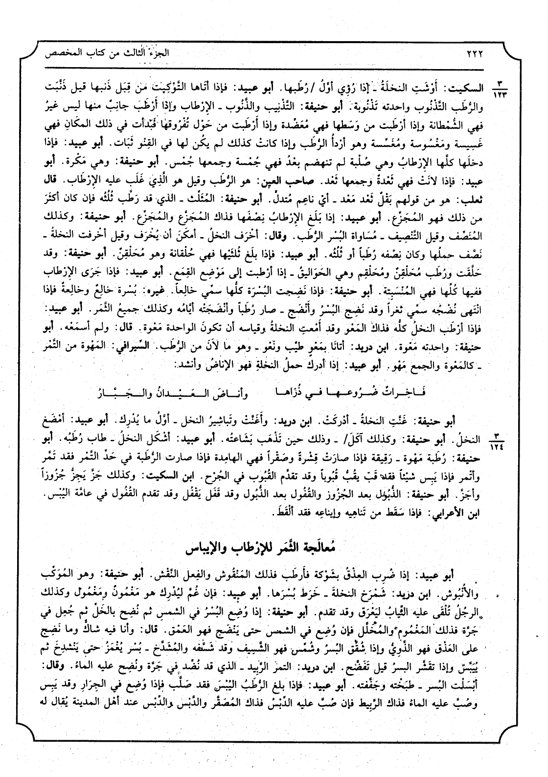 السّكيت أوشت النَّخْلَة - اذا رؤى أول رطبها أبوعبيد فاذا أَتَاهَا التوكيت من قبل ذنبها قيل ذنبت وَالرّطب التذنوب واحدته تذنوبة أبوحنيفة التذنيب والذنُوب - الارطاب واذا أرطب جَانب مِنْهَا لَيْسَ غير فَهِيَ الشمطانة واذا أرطبت من وَسطهَا فَهِيَ معضدة واذا أرطبت من حول تفروقها فَبَدَأت فِي ذَلِك الْمَكَان فَهِيَ غسيسة ومغسوسة ومغسة وَهُوَ أردأ الرطب واذا كَانَت كَذَلِك لم يكن لَهَا فِي القنوثبات أَبُو عبيد فاذا دَخلهَا كلهَا الارطاب وَهِي صلبة لم تنهضهم بعد فَهِيَ جمسة وَجَمعهَا جمس أبوحنيفة وَهِي مكرة أبوعبيد فاذا لانت فَهِيَ ثعدة وَجَمعهَا ثعد صَاحب الْعين هُوَ الرطب وَقيل هُوَ الَّذِي غلب عَلَيْهِ الارطاب قَالَ ثَعْلَب هُوَ من قَوْلهم بقل ثعد معد - أى ناعم متدل أبوحنيفة المثلث - الَّذِي قد رطب ثلثه فان كَانَ أَكثر من ذَلِك فَهُوَ المجزع أبوعبيداذا بلغ الارطاب نصفهَا فَذَاك المجزع والمجزع أبوحنيفة وَكَذَلِكَ الْمنصف وَقيل التنصيف - مُسَاوَاة الْبُسْر الرطب وَقَالَ أخرف النّخل - أمكن أَن يخرف وَقيل أخرفت النَّخْلَة - نصف حملهَا وَكَانَ نصفه رطبا أوثلثه أَبُو عبيد فاذا جرى الارطاب فِيهَا كلهَا فَهِيَ المنسبتة أبوحنيفة فاذا نَضِجَتْ البسرة كلهَا سمى خالعا غَيره بسرة خَالع وخالعة فاذا انْتهى نضجه سمى ثغرا وَقد نضج الْبُسْر وأنضج - صَار رطبا وأنضجته أَيَّامه وَكَذَلِكَ جَمِيع الثَّمر أبوعبيد فاذا أرطب النّخل كُله فَذَاك المعو وَقد أمعت النَّخْلَة وَقِيَاسه أَن تكون الْوَاحِدَة معوة قَالَ وَلم أسمعهُ أبوحنيفة واحدته معوة ابْن دُرَيْد أَتَانَا بمعو طيب ونعو - وَهُوَ مالان من الرطب السيرافي المهوة من الثَّمر - كالمعوة وَالْجمع مهو أبوعبيد اذا أدْرك حمل النَّخْلَة فَهُوَ الاناض وَأنْشد: فاخراتضروعها فِي ذراها وأناض العيدان والجبار أبوحنيفة غنت النَّخْلَة - أدْركْت ابْن دُرَيْد وأغنت وتباشير النّخل - أول مايدرك أبوعبيد أمضغ النّخل أبوحنيفة وَكَذَلِكَ آكل - وَذَلِكَ حِين تذْهب بشاعته أبوعبيد أشكل النّخل - طَابَ رطبه أبوحنيفة رطبَة مهوة - رقيقَة فاذا صَارَت قشرة وصقرا فَهِيَ الهامدة فاذا صَارَت الرّطبَة فِي حد التَّمْر فقد تمر وأتمر فاذا يبس شيأ فقد قب يقب قبوبا وَقد تقدم القبوب فِي الْجرْح ابْن السّكيت وَكَذَلِكَ جز يجز جزوزا وأجز أَبُو حنيفَة الذبول بعد الجزوز والقفول بعد الذبول وَقد قفل يقفل وَقد تقدم القفول فِي عَامَّة اليبس ابْن الْأَعرَابِي فاذا سقط من تناهيه فقد ألقط