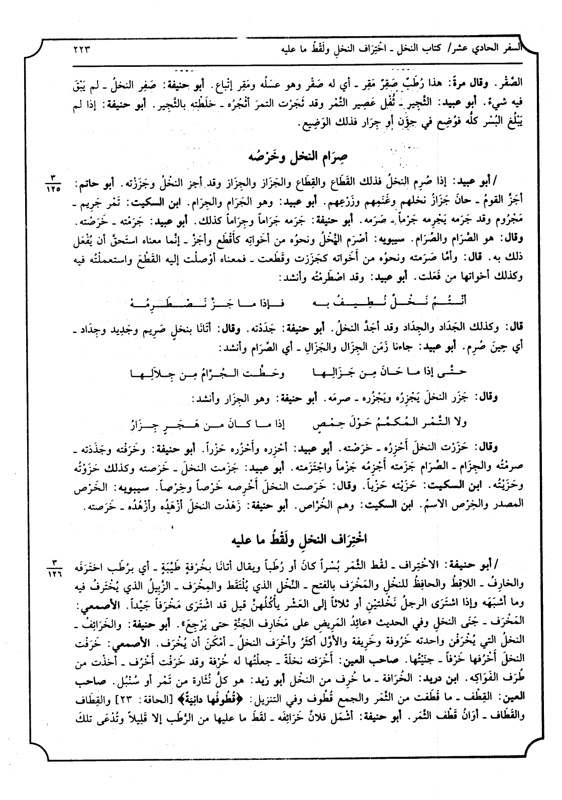 أَبُو عبيد اذا صرم النّخل فَذَلِك القطاع والقطاع والجزاز والجزاز وَقد أجز النّخل وجززته أَبُو حَاتِم أجز الْقَوْم - حَان جزاز نخلهموغنمهم وزرعهم أبوعبيد وَهُوَ الجرام والجرام ابْن السّكيت تمر جريم - مجروم وَقد جرمه يجرمه جرما - صرمه أبوحنيفة جرمه جراما وجراما كَذَلِك أبوعبيد جرمته - خرصته وَقَالَ هُوَ الصرام والصرام سيبوبه أَصْرَم النّخل وَنَحْوه من أخواته كأقطع وأجز - انما مَعْنَاهُ اسْتحق أَن يفعل ذَلِك بِهِ قَالَ وَأما صرمته وَنَحْوه من أخواته كجززت وَقطعت - فَمَعْنَاه أوصلت اليه الْقطع واستعملته فِيهِ وَكَذَلِكَ أخواتها مكن فعلت أبوعبيد وَقد اصطرمته وَأنْشد: أَنْتُم نخل نطيف بِهِ فاذا ماجز نصطرمه قَالَ وَكَذَلِكَ الجداد والجداد وَقد أجد النّخل أبوحنيفة جددته وَقَالَ أَتَانَا بِنَخْل صريم وجديد وجداد - أى حِين صرم أبوعبيد جَاءَنَا زمن الجزال والجزال - أى الصرام وَأنْشد: حَتَّى اذا ماحان من جزالها وحطت الجرام من جلالها وقالجزر النّخل يجزره ويجزره - صرمه أبوحنيفة وَهُوَ الجزار وَأنْشد: وَلَا التَّمْر المكمم حول حمص اذا ماكان من هجر جزار وَقَالَ حزرت النّخل أحزره - خرصته أبوعبيد أحزره وأحزره حزرا أبوحنيفة وخرفته وجذذته - صرمته والجزام - الصرام جزمته أجزمه جزما واجتزمته أبوعبيد جزمت النّخل - خرصته وَكَذَلِكَ حزوته وحزيته ابْن السّكيت حزيت حزيا وَقَالَ خرصت النّخل أخرصه خرصا وخرصا سيبوبه الْخرص الْمصدر والخرص الِاسْم ابْن السّكيت وهم الخراص أبوحنيفة زهدت النّخل أزهده وأزهده - خرصته