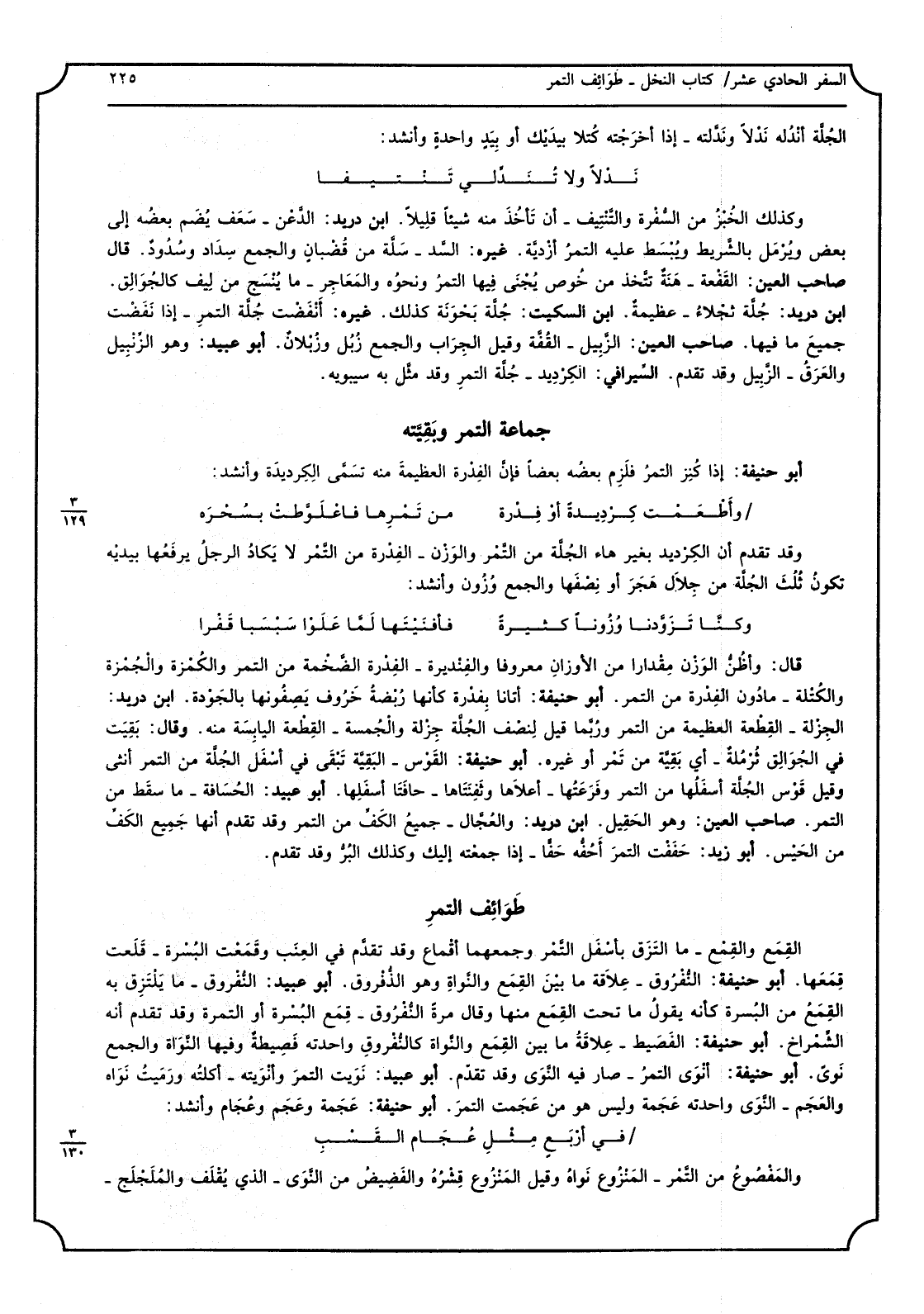أبوحنيفة اذا كنز التَّمْر فازم بعضه بَعْضًا فان الفدرة الْعَظِيمَة مِنْهُ تسمى الكرديدة وَأنْشد: وأطعمت كرديدة أَو فدره من تمرها فاعلوطت بسحره وَقد تقدم الكرديد بِغَيْر هَاء الجلة من التَّمْر وَالْوَزْن - الفدرة من التَّمْر لايكاد الرجل يرفعها بيدَيْهِ تكون ثلث الجلة من جلال هجر أَو نصفهَا وَالْجمع وزون وَأنْشد: وَكُنَّا تزودنا وزونا كَثِيرَة فأفنيتها لما علوا سبسبا قفزا قَالَ وأظن الْوَزْن مِقْدَار من الأوزان مَعْرُوفا والفنديرة - الفدرة الضخمة من التَّمْر والكمزة والجمزة والكتلة - مادون الفدرة من التَّمْر أبوحنيفةأتانا بقدرة كَأَنَّهَا ربضة خروف يصفونها بالجودة ابْن دُرَيْد الجزلة - الْقطعَة الْعَظِيمَة من التَّمْر وَرُبمَا قيل لنصف الجلة جزلة والخمسة - الْقطعَة الْيَابِسَة مِنْهُ وَقَالَ بقيت فِي الجوالق ثرملة - أى بَقِيَّة من تمر أوغيره أبوحنيفةالقوس - الْبَقِيَّة تبقى فِي أَسْفَل الجلة من التَّمْر أُنْثَى وَقيل قَوس الجلة أَسْفَلهَا من التَّمْر وفرعتها - أَعْلَاهَا وثفنتاها - حافتا أَسْفَلهَا أبوعبيد الحافة - ماسقط من التَّمْر صَاحب الْعين وَهُوَ الحقيل ابْن دُرَيْد والعجال - جَمِيع الْكَفّ من التَّمْر وَقد تقدم أَنَّهَا أَنَّهَا جَمِيع الْكَفّ من الحيس أبوزيد حففت التَّمْر أحفه حفا - اذا جمعته اليك وَكَذَلِكَ البروقد تقدم