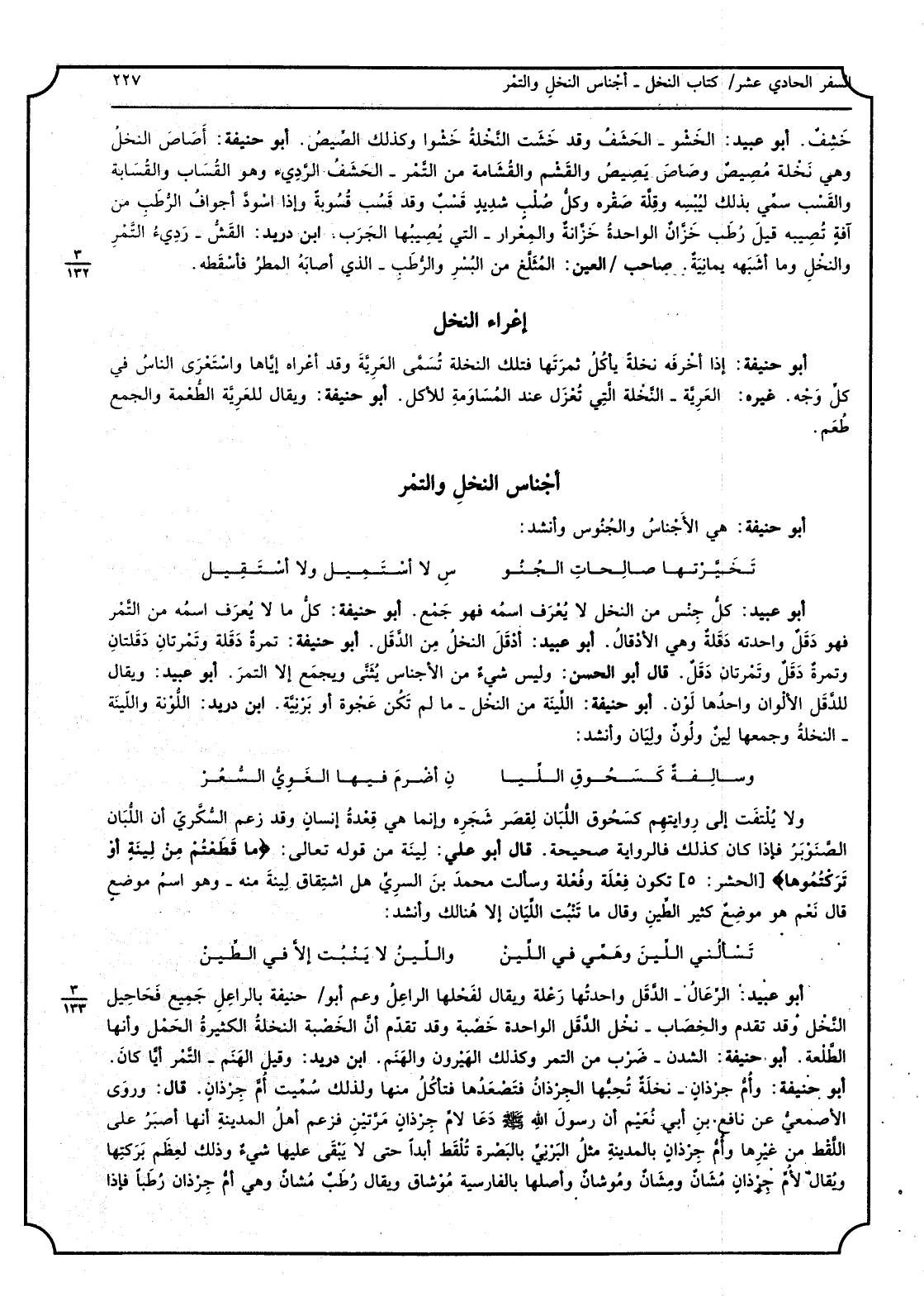 أبوحنيفة هِيَ الْأَجْنَاس والجنوس وَأنْشد: تخيرتها صالحات الجنو س لاأستميل ولاأستقيل أبوعبيد كل جنس من النّخل لايعرف اسْمه فَهُوَ جمع أبوحنيفة كل مَالا يعرف اسْمه من التَّمْر فَهُوَ دقل واحدته دقلة وَهِي الأدقال أبوعبيد أدقل النّخل من الدقل أبوحنيفة تَمْرَة دقلة وتمرتان دقلتان وَتَمْرَة دقل وتمرتان دقل قَالَ أَبُو الْحسن وَلَيْسَ شئ من الْأَجْنَاس يثنى وَيجمع إِلَّا التَّمْر أبوعبيد وَيُقَال للدقل الألوان وَاحِدهَا لون أبوحنيفة اللينة من النّخل - مالم تكن عَجْوَة أَو برفية ابْن دُرَيْد اللونة واللينة - النَّخْلَة وَجَمعهَا لين ولون وليان وَأنْشد: وسالفة كسحوق الليا ن أضرم فِيهَا الغوى السّعر ولايلتفت إِلَى روايتهم كسحوق اللبان لقصر شَجَره وانما هِيَ قعدة إِنْسَان وَقد زعم السكرِي أَن اللبان الصنوبر فاذا كَانَ كَذَلِك فَالرِّوَايَة صَحِيحَة قَالَ أَبُو عَليّ لينَة من قَوْله تَعَالَى (ماقطعتم من لينَة أوتركتموها) تكون فعلة وفعلة وَسَأَلت مُحَمَّد بن السرى هَل اشتقاق لينَة مِنْهُ - وَهُوَ اسْم مَوضِع قَالَ نعم هُوَ مَوضِع كثير الطين وَقَالَ ماتنبت الليان الاهناك وَأنْشد: تَسْأَلنِي اللين وهمي فِي اللَّبن واللين لاينبت إلافي الطين أبوعبيد الرعال - الدقل واحدتها رعلة وَيُقَال لفحلها الراعل وَعم أبوحنيفة بالراعل جَمِيع فحاحيل النّخل وَقد تقدم والخصاب - نخل الدقل الْوَاحِدَة خصبة وَقد تقدم أَن الخصبة النَّخْلَة الْكَثِيرَة الْحمل وَأَنَّهَا الطلعة أبوحنيفة الشدن - ضرب من التَّمْر وَكَذَلِكَ الهيرون والهنم ابْن دُرَيْد وَقيل الهنم - التَّمْر أيا كَانَ أبوحنيفة وَأم جرذان - نَخْلَة تحبها الجرذان فتصعدها فتأكل مِنْهَا وَلذَلِك سميت أم جرذان قَالَ وروى الاصمعي عَن نابغ بن أبي نعيم أَن رَسُول الله صلى الله عَلَيْهِ وَسلم دَعَا لأم جرذان مرَّتَيْنِ فَزعم أهل الْمَدِينَة أَنَّهَا أَصْبِر على اللقط من غَيرهَا وَأم جرذان بِالْمَدِينَةِ مثل البرني بِالْبَصْرَةِ تلقط أبدا حَتَّى لايبقى عَلَيْهَا شئ وَذَلِكَ لعظم بركتها وَيُقَال لأم جرذان مشان ومشان وموشان وَأَصلهَا بِالْفَارِسِيَّةِ موشاق وَيُقَال رطب مشان وَهِي أم جرذان رطبا فاذا
