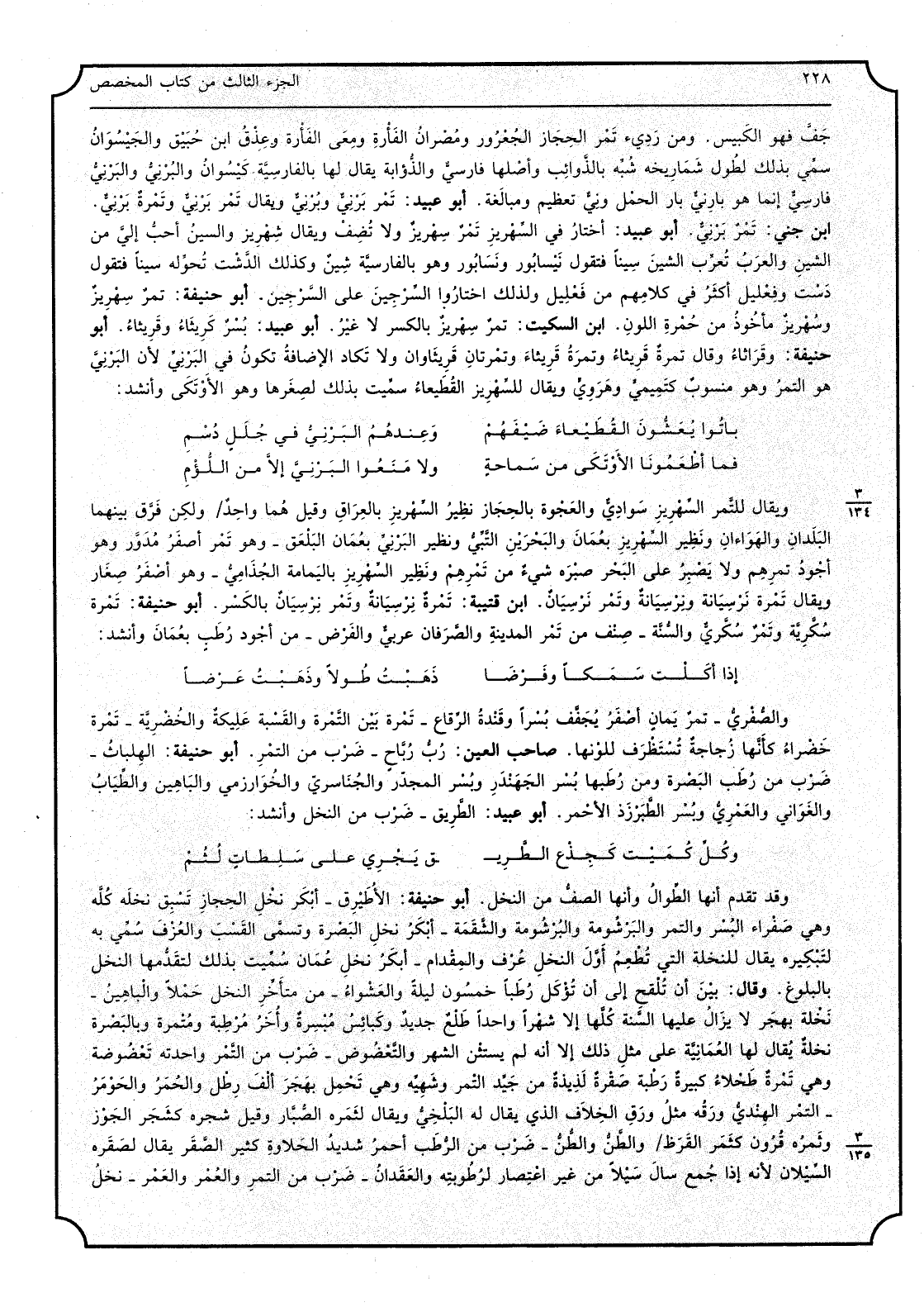 جف فَهُوَ الكبيس وَمن ردئ تمر الْحجاز الجعرور ومصران الْفَأْرَة وَمَعِي الْفَأْرَة وعذق ابْن حبيق والجيسوان سمي بذلك لطول شماريخه شبه بالذوائب وَأَصلهَا فَارسي والذؤابة يُقَال لَهَا بِالْفَارِسِيَّةِ كيسوان والبرني والبرني فَارسي انما هُوَ بارني بار الْحمل وني تَعْظِيم ومبالغة أبوعبيد أخْتَار فِي السهر يزتمر سهريز وَلَا تضف وَيُقَال شهريز وَالسِّين أحب الي من الشين وَالْعرب تعرب الشين سينا فَتَقول نيسابور ونسابور وَهُوَ بِالْفَارِسِيَّةِ شين وَكَذَلِكَ الدشت تحوله سينا فَتَقول دست وفعليل أَكثر فِي كَلَامهم من فعليل وَلذَلِك اخْتَارُوا السرجين على السرجين أبوحنيفة تمر سهريز وسهريز مَأْخُوذ من حمرَة اللَّوْن ابْن السّكيت تمر سهريز بِالْكَسْرِ لاغير أبوعبيد بسر كريثاء وقريثاء أبوحنيفة وقراثاه وَقَالَ تَمْرَة قريثاء وَتَمْرَة قريثاء وتمرتان قريثاوان ولاتكاد الاضافة تكون فِي البرني لِأَن البرني هُوَ التَّمْر وَهُوَ مَنْسُوب كتميمي وهروي وَيُقَال للسهريز القطيعاء سميت بذلك لصغرها وَهُوَ الأوتكي وَأنْشد: والصفرى - تمر يمَان أصفر يجفف بسرا وقندة الرّقاع - تَمْرَة بَين التمرة والقسبة علعلبكة والخضرية - تَمْرَة خضراء كَأَنَّهَا زجاجة تستظرف للونها صَاحب الْعين رب رَبَاح - ضرب من التَّمْر أبوحنيفة الهلبات - ضرب من رطب الْبَصْرَة وَمن رطبها بسر الجهندر وَبسر المجدر والجناسري والخوارزمي والباهين والطياب والغواني والعمري وَبسر الطبر الْأَحْمَر أبوعبيد الطَّرِيق - ضرب من النّخل وَأنْشد: وكل كميت كجذع الطَّرِيق يجْرِي على سلطات لثم وَقد تقدم أَنَّهَا الطوَال وَأَنَّهَا الصَّفّ من النّخل أبوحنيفة الأطبرق - أبكر نخل الْحجاز نخله كُله وَهِي صفراء الْبُسْر وَالتَّمْر والبرشومة والبرشومة والشقمة - أبكر نخل الْبَصْرَة وَتسَمى القسب والعزف سمى بِهِ لتبكيره يُقَال للنخلة الَّتِي تطعم أول النّخل عرف والمقدام - أبكر نخل عمان سميت بذلك لتقدمها النّخل بِالْبُلُوغِ وَقَالَ بَين أَن تلقح إِلَى أَن تُؤْكَل رطبا خَمْسُونَ لَيْلَة واعشواء - من مُتَأَخّر النّخل حملا والباهين - نَخْلَة بهجر لايزال علها السّنة كلهَا الاشهر وَاحِدًا طلع جَدِيد وكبائس مبسرة وَأخر مرطبة ومتمرة وبالبصرة نَخْلَة يُقَال لَهَا العمانية على مثل ذَلِك الاأنه لم يستن الشَّهْر والتعضوض - ضرب من التَّمْر واحدته تعضوضة وَهِي تَمْرَة طحلاء كَبِيرَة رطبَة صقرة لذيذة من جيد التَّمْر وشهيه وَهِي تحمل بهجر ألف رَطْل والحمر والحومر - التَّمْر الْهِنْدِيّ ورقه مثل ورق الجلاف الَّذِي يُقَال لَهُ الْبَلْخِي وَيُقَال لثمره الصبار وَقيل شَجَره كشجر الْجَوْز وثمره قُرُون كثمر القرط والطن والطن - ضرب من الرطب أَحْمَر شَدِيد الْحَلَاوَة كثير الصَّقْر يُقَال لصقره السيلان لِأَنَّهُ اذا جمع سَالَ سيلا من غير اعتصار لرطوبته والعقدان - ضرب من التَّمْر والعمر والعمر - نخل