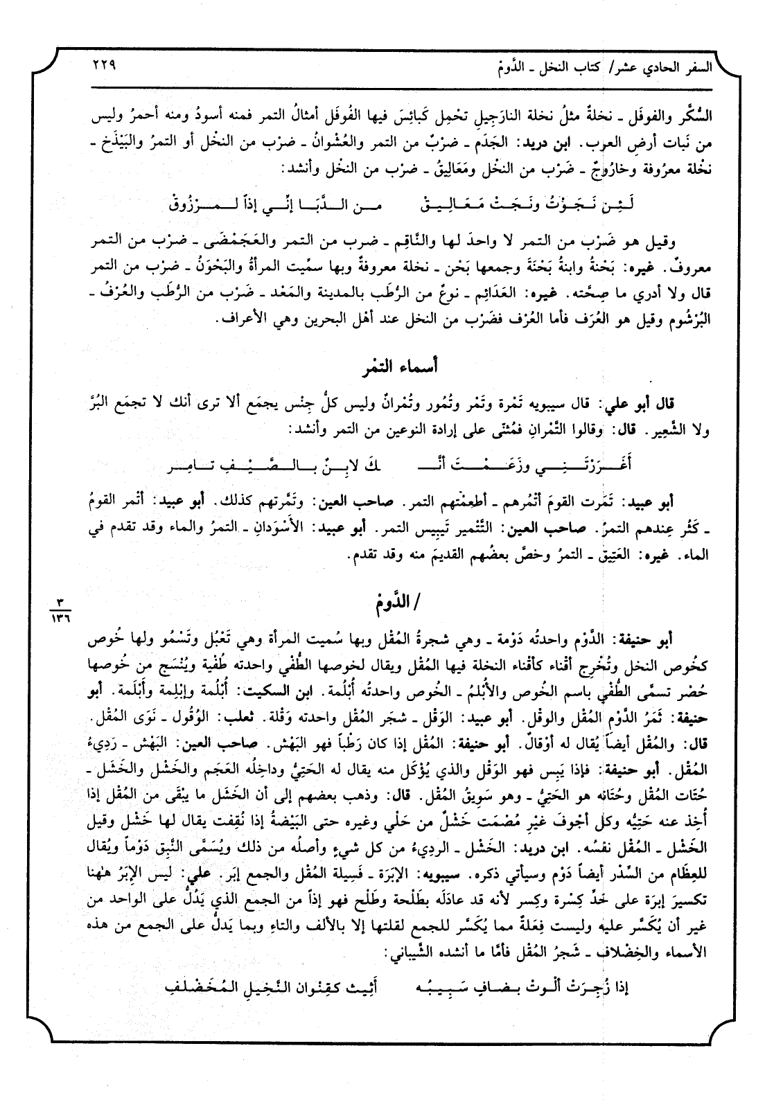 أبوحنيفة الدوم واحدته دومة - وَهِي شَجَرَة الْمقل وَبهَا سميت الْمَرْأَة وَهِي تعبل وتسمو وَلها خوص كخوص النّخل وَتخرج أقناء كأقناء النَّخْلَة فِيهَا المفل وَيُقَال لخوصها الطفي واحدته طفية وينسج من خوصها حصر تسمى الطفي باسم الخوص والأبلم - الخوص واحدته أبلمة ابْن السّكيت أبلمة وإبلمة وأبلمة أبوحنيفة ثَمَر الدوم الْمقل والوقل أبوعبيد الوقل - شجر الْمقل واحدته وَقلة ثَعْلَب الوقول - نوى الْمقل قَالَ والمقل أيصا يُقَال لَهُ أوقال أبوحنيفة الْمقل اذا كَانَ رطبا فَهُوَ البهش صَاحب الْعين البهش - ردئ الْمقل أَبُو حنيفَة فاذا يبس فَهُوَ الوقل وَالَّذِي يُؤْكَل مِنْهُ يُقَال لَهُ الحتي وداخله الْعَجم والخشل والخشل - حتات الْمقل وحتانه هُوَ الحتي - وَهُوَ سويق الْمقل قَالَ وَذهب بَعضهم إِلَى أَن الخشل مَا يبْقى من الْمقل اذا أَخذ عَنهُ حتيه وكل أجوف غير مصمت خشل من حلى وَغَيره حَتَّى الْبَيْضَة اذا انقفت يُقَال لَهَا خشل وَقيل الخشل - الْمقل نَفسه ابْن دُرَيْد الخشل - الردئ من كل شئ وَأَصله من ذَلِك وَيُسمى النبق دَوْمًا وَيُقَال للعظام من السدر أَيْضا دوم وَسَيَأْتِي ذكره سيبوبه الابرة - فسيلة الْمقل وَالْجمع إبر عَليّ لَيْسَ الابر هَهُنَا تكسير إبرة على حد كسرة وَكسر لانه قد عادله بطلحة وطلح فَهُوَ إِذا من الْجمع الَّذِي يدل على الْوَاحِد من غير أَن يكسر عَلَيْهِ وَلَيْسَت فعلة مِمَّا يكسر للْجمع لقلتهَا الا بِالْألف وَالتَّاء وَبِمَا يدل على الجدمع من هَذِه الْأَسْمَاء والخضلاف - شجر الْمقل فَأَما مَا أنْشدهُ الشَّيْبَانِيّ: اذا زجرت ألوت بضاف سبيبه أثيت كقنوان النخيل المخضلف