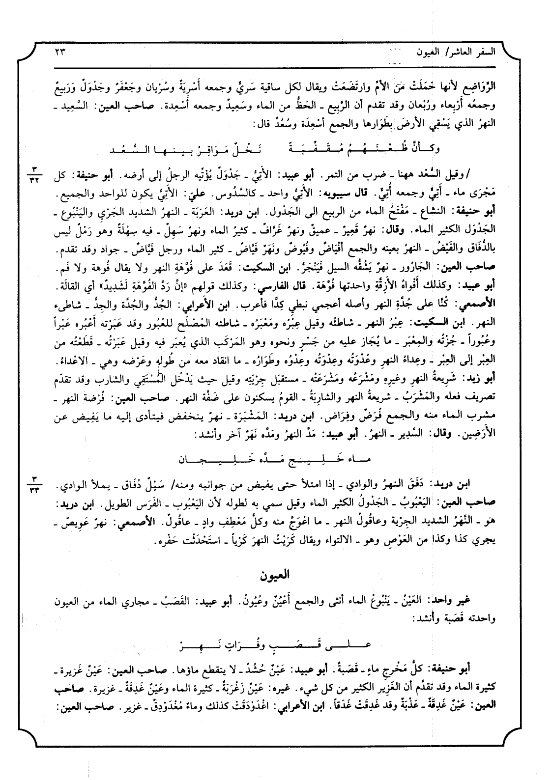 غير وَاحِد الْعين - ينبوع المَاء أُنْثَى وَالْجمع أعين وعيون أَبُو عبيد الْقصب - مجاري المَاء من الْعُيُون واحدته قَصَبَة وَأنْشد: على قصب وفرات نهر أَبُو حنيفَة كل مخرج مَاء - قَصَبَة أَبُو عبيد عين حشد - لَا يَنْقَطِع مَاؤُهَا صَاحب الْعين عين غزيرة - كثير المَاء وَقد تقدم أَن الغزير الْكثير من كل شَيْء غَيره عين زغربة - كَثِيرَة المَاء وَعين غدقة - غزيرة صَاحب الْعين عين غدقة - عذبة وَقد غدقت غدقاً ابْن الْأَعرَابِي اغدودقت كَذَلِك وَمَاء مغدودق - غزير صَاحب الْعين