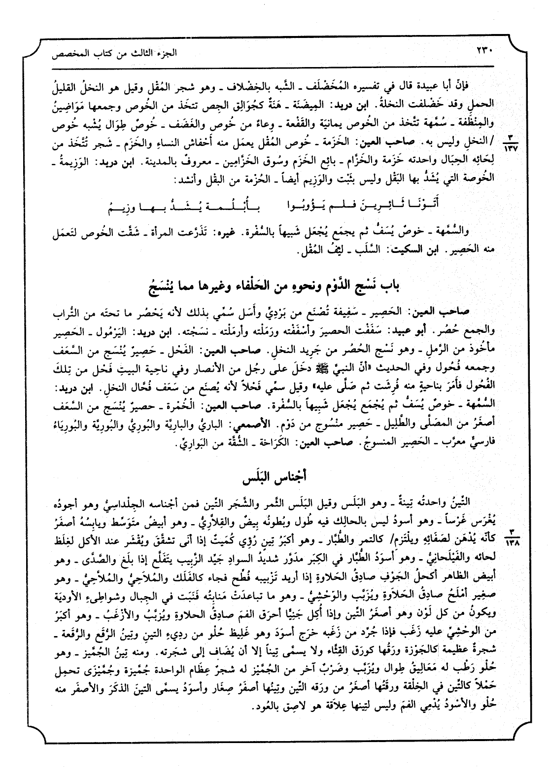 فان أَبَا عُبَيْدَة قَالَ فِي تَفْسِيره المخضلف - الشّبَه بالخضلاف - وَهُوَ شجر الْمقل وَقيل النّخل الْقَلِيل الْحمل وَقد خضلفت النَّخْلَة ابْن دُرَيْد الميضنة - هنة كجوالق الجص تتَّخذ من الخوص وَجَمعهَا مواضين والمنظفة - سمهة تتَّخذ من الخوص يمانيةوالقفعة - وعَاء من خوص والغضف - خوص طوال يشبه خوص النّخل وَلَيْسَ بِهِ صَاحب الْعين الخزمة - خوص الْمقل يعْمل مِنْهُ أحفاش النِّسَاء والخزم - شجر تتَّخذ من لحائه الحبال واحدته خزمة والخزام - بَائِع الخزم وسوق الخزامين - مَعْرُوف بِالْمَدِينَةِ ابْن دُرَيْد الوزيمة - الخوصة الَّتِي يشد بهَا البقل وَلَيْسَ بثبت والوزيم أَيْضا - الحزمة من البفل وَأنْشد: اتونا ثائرين فَلم يؤوبوا بابلمة يشد بهَا وزيم والسمهة - خوص يسف ثمَّ يجمع يَجْعَل شَبِيها بالسفرة غَيره تذرعت الْمَرْأَة - شفت الخوص لتعمل مِنْهُ الْحَصِير ابْن السّكيت السَّلب - لِيف الْمقل