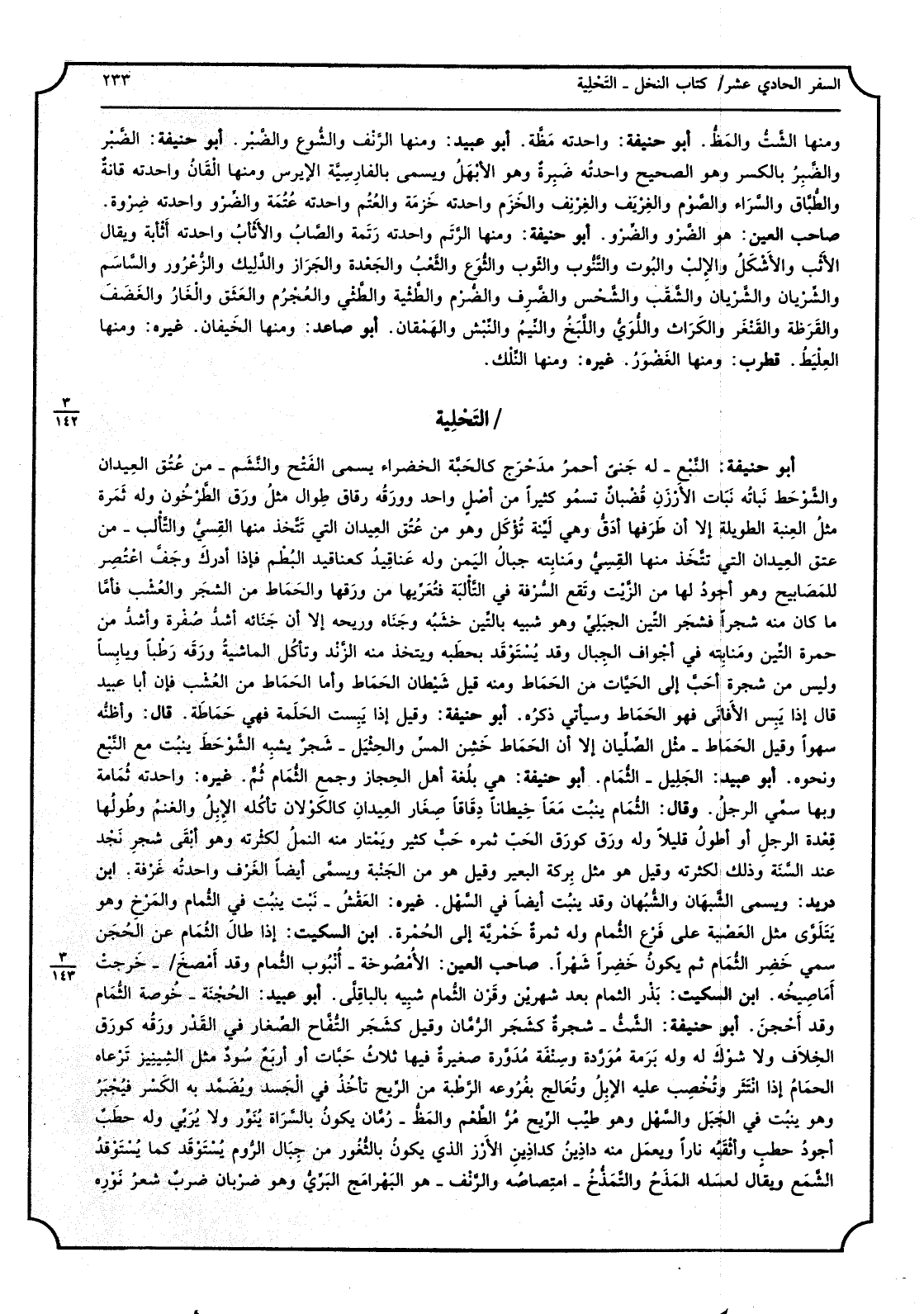 أَبُو حنيفَة: النّبْع - لَهُ جنى أَحْمَر مدحرَج كالحبّة الخضراء يُسمى الْفَتْح والنّشَم - من عُتُق العيدان والشّوحط - نباتُه نَبات الأرزَن قُضبان تسمو كثيرا من أصل وَاحِد وورقه رِقاق طوال مثل ورق الطّرخون وَله ثَمَرَة مثل العِنبة الطَّوِيلَة إِلَّا أَن طرفها أدقّ وَهِي ليّنة تؤكَل وَهُوَ من عُتُق العيدان الَّتِي تتَّخذ مِنْهَا القِسيّ والنّألب - من عتق العيدان الَّتِي تتَّخذ مِنْهَا القسيّ ومنابِته جبالُ الْيمن وَله عناقيد كعناقيد البُطم فَإِذا أدْرك وجفّ اعتُصر للمصابيح وَهُوَ أَجود لَهَا من الزَّيْت وَتَقَع السُّرْفة فِي التألبَة فتُعريها من وَرقهَا والحَماط من الشّجر والعُشب فَأَما مَا كَانَ مِنْهُ شَجرا فشجر التِّين الْجبلي وَهُوَ شَبيه بِالتِّينِ خشبُه وجَناه وريحه إِلَّا أَن جناته أَشد صُفرة وَأَشد من حمرَة التِّين ومنابته فِي أَجْوَاف الْجبَال وَقد يُستَوقد بحطبه ويتخذ مِنْهُ الزَّنْد وتأكل الْمَاشِيَة ورقه رطْباً ويابساً وَلَيْسَ من شَجَرَة أحب إِلَى الحيّات من الحاط وَمِنْه قيل شَيْطان الحاط وَأما الحاط من العُشْب فَإِن أَبَا عبيد قَالَ إِذا يبس الأفانَى فَهُوَ الحَماط وَسَيَأْتِي ذكرُه. أَبُو حنيفَة: وَقيل إِذا يبِست الحَلمة فَهِيَ حماطة. قَالَ: وَأَظنهُ سَهوا وَقيل الحَماط - مثل الصّلّيان إِلَّا أَن الحَماط خشِن المسّ والحثْيَل - شجر يشبه الشّوحط ينبُت مَعَ النّبع وَنَحْوه. أَبُو عبيد: الْجَلِيل - الثُمام. أَبُو حنيفَة: هِيَ بلغَة أهل الْحجاز وَجمع الثُّمام ثُمّ. غَيره: واحدته ثُمامة وَبهَا سمي الرجل. وَقَالَ: الثّمام ينْبت مَعًا خيطاناً دِقاقاً صغَار العيدان كالكَوْلان تَأْكُله الْإِبِل وَالْغنم وطولها قِعدة الرجل أَو أطول قَلِيلا وَله ورق كورق الحبّ ثمره حبّ كثير ويمتار مِنْهُ النَّمْل لكثرته وَهُوَ أبقى شجر نجْد عِنْد السّنة وَذَلِكَ لكثرته وَقيل هُوَ مثل بِركة الْبعيد وَقيل هُوَ من الجنبة وَيُسمى أَيْضا الغَرْف واحدتُه غَرْفة. ابْن دُرَيْد: وَيُسمى الشَّبَهان والشّبُهان وَقد ينْبت أَيْضا فِي السهل. غَيره: العَقْش - نبت ينْبت فِي الثُّمام والمرْخِ وَهُوَ يتلوّى مثل العصْبة على فرْع الثُّمام وَله ثَمَرَة خمرية إِلَى الحُمرة مَا هِيَ. ابْن السّكيت: إِذا طَال الثمام عَن الحُجَن سمي خضِر الثمام ثمَّ يكون خضِراً شهرا. صَاحب الْعين: الأُمصوخة - أنبوب الثمام وَقد أمصخ - خرجت أماصيخُه. ابْن السّكيت: بذر الثمام بعد شَهْرَيْن وَقرن الثُمام شَبيه بالباقلّى. أَبُو عبيد: الحجنة - خوصَة الثمام وَقد أحجن. أَبُو حنيفَة: الشّثُّ - شَجَرَة كشجر الرُّمَّان وَقيل كشجر التفاح الصغار فِي الْقدر ورقه كورق الْخلاف وَلَا شوك لَهُ وَله برَمة مورّدة وسِنفة مدوّرة صَغِيرَة فِيهَا ثَلَاث حبّات أَو أَربع سود مثل الشينيز ترعاه الحمامُ إِذا انتثر وتخصب عَلَيْهِ الْإِبِل وتعالج بفروعه الرّطبة من الرّيح تَأْخُذ فِي الْجَسَد ويضمَّد بِهِ الْكسر فيجبَر وَهُوَ ينْبت فِي الْجَبَل والسهل وَهُوَ طيب الرّيح مرّ الطّعْم والمظّ - رمان يكون بالسّراة ينور وَلَا يُربّى وَله حطب أَجود حطب وأثقبه نَارا وَيعْمل مِنْهُ داذين كداذين الأرْز الَّذِي يكون بالثّغور من جبال الرّوم يُستوقد كَمَا يستوقد الشمع وَيُقَال لعسله المذخ والتمذّخ - امتصاصه والرّنف - هُوَ البهْرامَج البرّي وَهُوَ ضَرْبَان ضرب شعر نوره