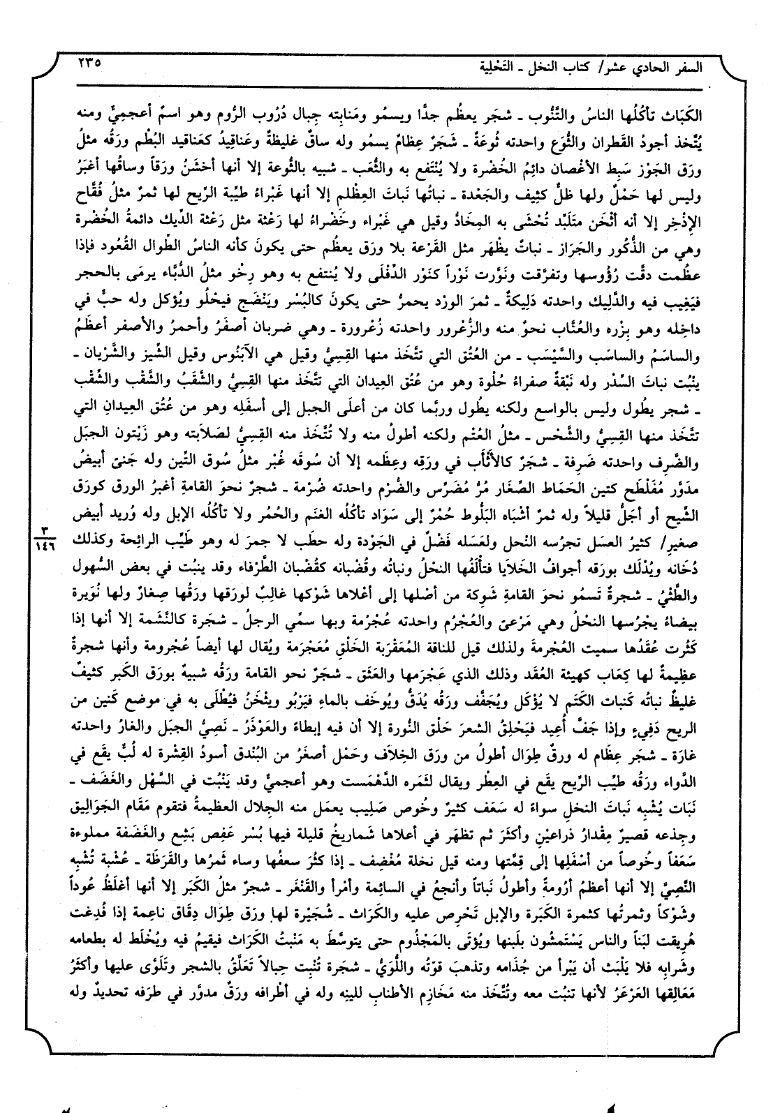 الكَباث تأكلها النَّاس والتّنوب - شجر يعظم جدا ويسمو ومنابِته جبال دروب الرّوم وَهُوَ اسْم أعجمي وَمِنْه يُتّخذ أَجود القطران والثّوع واحدته ثوعة - شجر عِظَام يسمو وَله سَاق غَلِيظَة وعناقيد كعناقيد البطم ورقه مثل ورق الْجَوْز سبط الأغصان دَائِم الخضرة وَلَا ينْتَفع بِهِ والثُّعَب - شَبيه بالثّوعة إِلَّا أَنَّهَا أخشن وَرقا وساقُها أغبر وَلَيْسَ لَهَا حمْلٌ وَلها ظلّ كثيف والجَعْدة - نباتُها نَبَات العِظلم إِلَّا أَنَّهَا غبراً طيبَة الرّيح لَهَا ثَمَر مثل فُقّاح الاذْخِر إِلَّا أَنه أثخن متلبّد تُحْشى بِهِ المخادّ وَقيل هِيَ غبراء وخضراء لَهَا رعثة مثل رعثة الديك دائمة الخُضرة وَهِي من الذّكور والجَراز - نَبَات يظْهر مثل الْقرعَة بِلَا ورق يعظم حَتَّى يكون كَأَنَّهُ النَّاس الطّوال القُعود فَإِذا عظمت دقّت رؤوسها وتفرّقت ونوّرت نورا كنوْر الدفلى وَلَا يُنتفع بِهِ وَهُوَ رخو مثل الدُّبّاء يرْمى بِالْحجرِ فيغيب فِيهِ والدّليك واحدته دليكة - ثَمَر الْورْد يحمرّ حَتَّى يكون كالبُسر وينضج فيحلو ويؤكل وَله حبّ فِي دَاخله وَهُوَ بزره والعُنّاب نَحْو مِنْهُ والزُّعْر وواحدته زعرورة - وَهِي ضَرْبَان أصفر وأحمر والأصفر أعظم والساسَم والساسَب والسّيْسَب - من العُتُق الَّتِي تتَّخذ مِنْهَا القسيّ وَقيل هِيَ الآبنوس وَقيل الشّيز والشّريان - ينْبت نَبَات السّدر وَله نبقة صفراء حلوة وَهُوَ من عتُق العيدان الَّتِي تتَّخذ مِنْهَا القسي والشّقَب والشّقْب والشِّقْب - شجر يطول وَلَيْسَ بالواسع وَلكنه يطول وَرُبمَا كَانَ من أَعلَى الْجَبَل إِلَى أَسْفَله وَهُوَ من عتُق العيدان الَّتِي تتَّخذ مِنْهَا القسي والشّحس - مثل العُتم وَلكنه أطول مِنْهُ وَلَا تُتخذ مِنْهُ القسيّ لصلابته وَهُوَ زيتون الْجَبَل والضّرِف واحدته ضرِفة - شجر كالأثأب فِي ورقه وعظَمه إِلَّا أَن سوقَه غُبْر مثل سوق التِّين وَله جنى أَبيض مدوّر مفلطح كتين الحَماط الصّغار مرّ مضرّس والضّرم واحدته ضُرمة - شجر نَحْو الْقَامَة أغبر الْوَرق كورق الشَّيْخ أَو أجلّ قَلِيلا وَله ثَمَر أشباه البلّوط حُمرٌ إِلَى سَواد تأكُلُه الْغنم والحمُر وَلَا تَأْكُله الْإِبِل وَله وريد أَبيض صَغِير كثير الْعَسَل تجرُسه النَّحْل ولعسله فضل فِي الْجَوْدَة وَله حطب لَا جمر لَهُ وَهُوَ طيّب الرَّائِحَة وَكَذَلِكَ دخانه ويدْلك بورقه أَجْوَاف الخَلايا فتألفها النَّحْل ونباتُه وقُضبانه كقضبان الطّرْفاء وَقد ينْبت فِي بعض السهول والطّثْيُ - شَجَرَة تسمو نَحْو الْقَامَة شَوْكَة من أَصْلهَا إِلَى أَعْلَاهَا شَوْكهَا غَالب لورقها وَرقهَا صغَار وَلها نُويرة بَيْضَاء يجرسها النَّحْل وَهِي مرعًى والعُجرُم واحدته عجرُمة وَبهَا سمي الرجل - شَجَرَة كالنّشمة إِلَّا أَنَّهَا إِذا كثُرت عُقَدُها سميت العُجرمة وَلذَلِك قيل للناقة المعقرَبة الخَلْق معجرَمة وَيُقَال لَهَا أَيْضا عجرومة وَإِنَّهَا شَجَرَة عَظِيمَة لَهَا كِعاب كَهَيئَةِ العُقَد وَذَلِكَ الَّذِي عجرمها والعثَق - شجر نَحْو الْقَامَة ورقه شَبيه بورق الكَبر كثيفٌ غليظٌ نباتُه كنبات الكتَم لَا يُؤْكَل ويجفَّف ورقه يُدَقُّ ويوخَف بِالْمَاءِ فيربو ويثخَن فيُطلى بِهِ فِي مَوضِع كنين من الرّيح دفئٍ وَإِذا جفّ أُعِيد فيخلق الشّعْر حلقَ النّورة إِلَّا أَن فِيهِ إبطاءً والعوذَر - نصيُّ الْجَبَل والغار واحدته غَارة - شجر عِظَام لَهُ ورق طوال أطولُ من ورق الخِلاف وحمْل أصغَر من البُندق أسودُ القِشرة لَهُ لبّ يَقع فِي الدّواء ورقه طيب الرّيح يَقع فِي الْعطر وَيُقَال لثمره الدّهمَست وَهُوَ أعجمي وَقد ينْبت فِي السهل والغضَف - نَبَات يُشبه نَبَات النّخل سَوَاء لَهُ سعف كثير وخوص صَلِيب يعْمل مِنْهُ الجِلال الْعَظِيمَة فتقوم مقَام الجواليق وجذعه قصير مِقْدَار ذراعين وَأكْثر ثمَّ تظهر فِي أَعْلَاهَا شماريخ قَليلَة فِيهَا بُسْر عفِص بشِع والغضَفة مَمْلُوءَ
