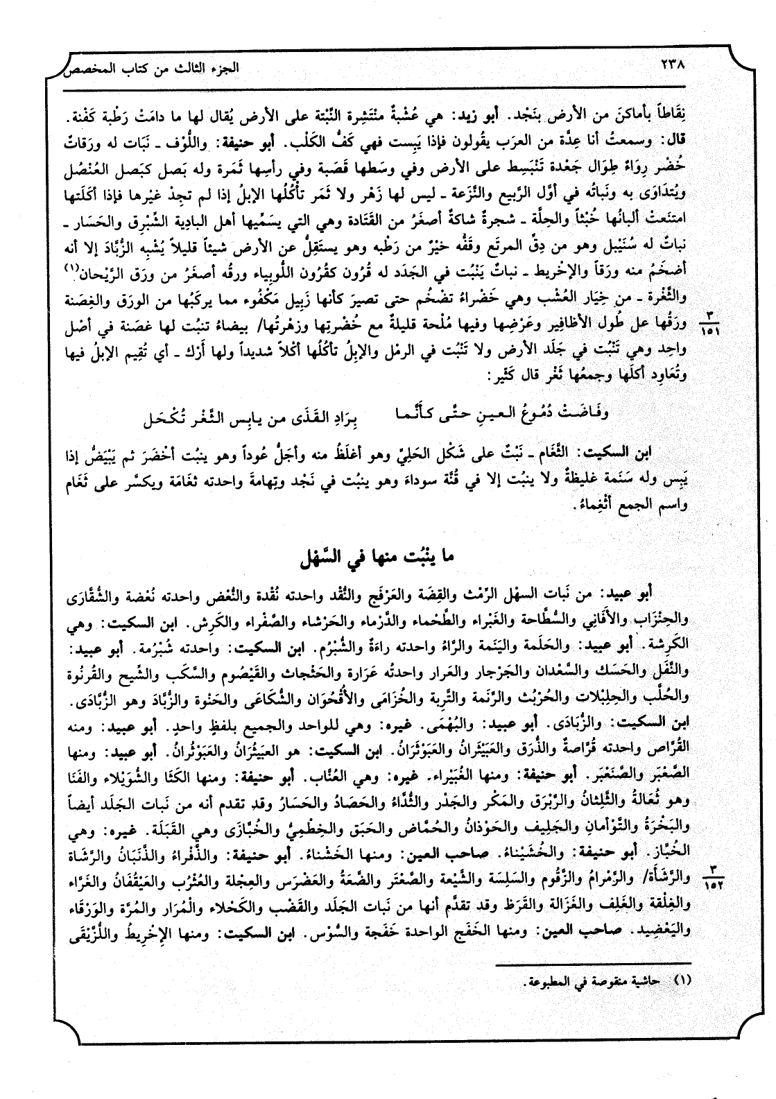 نقاطاً بأماكن من الأَرْض بِنَجْد. أَبُو زيد: هِيَ عشبة منتشرة النبتة على الأَرْض يُقَال لَهَا مادامت رطبَة كفْنة. قَالَ: وسمعتُ أَنا عدّة من الْعَرَب يَقُولُونَ فَإِذا يَبِسَتْ فَهِيَ كف الْكَلْب. أَبُو حنيفَة: واللوف - نَبَات لَهُ وَرَقَات خُضر رواء طوال جعدة تنبسط على الأَرْض وَفِي وَسطهَا قَصَبَة وَفِي رَأسهَا ثَمَرَة وَله بصل كبصل العُنصُل ويُتداوى بِهِ ونباته فِي أول الرّبيع والنّزَعة - لَيْسَ لَهَا زهر وَلَا ثَمَر تأكلها الْإِبِل إِذا لم تَجِد غَيرهَا فَإِذا أكلتها امْتنعت ألبانُها خُبثاً والحلة - شَجَرَة شاكة أَصْغَر من القَتادة وَهِي الَّتِي يسميها أهل الْبَادِيَة الشِبرِق والحسار - نَبَات لَهُ سُنَيبل وَهُوَ من دق المرتع وقفُّه خير من رطبه وَهُوَ يسْتَقلّ عَن الأَرْض شَيْئا قَلِيلا يُشبه الزُّباد إِلَّا أَنه أضخم مِنْهُ وَرقا والإخريط - نَبَات ينْبت فِي الجدد لَهُ قُرُون كقرون اللوبياء ورقه أَصْغَر من ورق الريحان والثغرة - من خِيَار العشب وَهِي خضراء تضخم حَتَّى تصير كَأَنَّهَا زبيل مكفوء مِمَّا يركبهَا من الْوَرق والغِصنة وَرقهَا على طول الأظافير وعرضها وفيهَا ملحة قَليلَة مَعَ خضرتها وزهرتها بَيْضَاء تنْبت لَهَا غصنة فِي أصل وَاحِد وَهِي تنْبت فِي جلَد الأَرْض وَلَا تنْبت فِي الرمل وَالْإِبِل تأكُلها أكلا شَدِيدا وَلها أرك - أَي تقيم الْإِبِل فِيهَا وتعاود أكلهَا وَجَمعهَا ثغر قَالَ كثيّر: داً إِنَّمَا تُوجد ثِنْتَيْنِ ثِنْتَيْنِ أَو أرْبعاً أَرْبعا والعِهنة - من الذّكور والقَفْعاء - شُجيرة خضْراءُ مادامت رطبَة وَهِي قُضبان قِصار تخرج من أصل وَاحِد لَازِمَة للْأَرْض لَهَا وريق صَغِير فَإِذا همّت بالجُفوف وَارْتَفَعت عَن الأَرْض وتقبّضت فتجمّعت وَلَا تُؤْكَل وَإِذا أخصبت طَالَتْ وَهِي من الْأَحْرَار وَقيل من الذّكور وَقيل هِيَ ضرب من الحسَك أشبه شَيْء بحلَق الدّرع وَقيل هِيَ نبتة خوّارة ضَعِيفَة من نَبَات الرّبيع خشْناء الْوَرق لَهَا نور أَحْمَر أَمْثَال الشّرر صغَار وورقها مستعلِيات من فرْق وثمرتُها مقفّعة من تَحت والقِلقِل - شُجيرة خضراءُ تنهض على سَاق لَهَا حبّ كحبّ اللوبياء حُلْو يُؤْكَل والسائمة تحرص عَلَيْهِ وَهِي من الذُّكُور وَإِذا جفّ فدُقّ وأوخِف بِالْمَاءِ كَانَ كالغِراء فيُضْمَد بِهِ الخَلع والكفْنة - من دِقّ الشّجر صَغِيرَة جَعدة إِذا يَبِسَتْ عيدانُها كَانَت كأنّها شُقق القَنا وَإِذا اختلاها الْإِنْسَان قيل كفن يكفِن وَهِي من الْأَحْرَار. أَبُو صاعد: الكفْنة - تنْبت فِي القيعان نقاطاً بأماكن من الأَرْض بِنَجْد. أَبُو زيد: هِيَ عشبة منتشرة النبتة على الأَرْض يُقَال لَهَا مادامت رطبَة كفْنة. قَالَ: وسمعتُ أَنا عدّة من الْعَرَب يَقُولُونَ فَإِذا يَبِسَتْ فَهِيَ كف الْكَلْب. أَبُو حنيفَة: واللوف - نَبَات لَهُ وَرَقَات خُضر رواء طوال جعدة تنبسط على الأَرْض وَفِي وَسطهَا قَصَبَة وَفِي رَأسهَا ثَمَرَة وَله بصل كبصل العُنصُل ويُتداوى بِهِ ونباته فِي أول الرّبيع والنّزَعة - لَيْسَ لَهَا زهر وَلَا ثَمَر تأكلها الْإِبِل إِذا لم تَجِد غَيرهَا فَإِذا أكلتها امْتنعت ألبانُها خُبثاً والحلة - شَجَرَة شاكة أَصْغَر من القَتادة وَهِي الَّتِي يسميها أهل الْبَادِيَة الشِبرِق والحسار - نَبَات لَهُ سُنَيبل وَهُوَ من دق المرتع وقفُّه خير من رطبه وَهُوَ يسْتَقلّ عَن الأَرْض شَيْئا قَلِيلا يُشبه الزُّباد إِلَّا أَنه أضخم مِنْهُ وَرقا والإخريط - نَبَات ينْبت فِي الجدد لَهُ قُرُون كقرون اللوبياء ورقه أَصْغَر من ورق الريحان والثغرة - من خِيَار العشب وَهِي خضراء تضخم حَتَّى تصير كَأَنَّهَا زبيل مكفوء مِمَّا يركبهَا من الْوَرق والغِصنة وَرقهَا على طول الأظافير وعرضها وفيهَا ملحة قَليلَة مَعَ خضرتها وزهرتها بَيْضَاء تنْبت لَهَا غصنة فِي أصل وَاحِد وَهِي تنْبت فِي جلَد الأَرْض وَلَا تنْبت فِي الرمل وَالْإِبِل تأكُلها أكلا ش