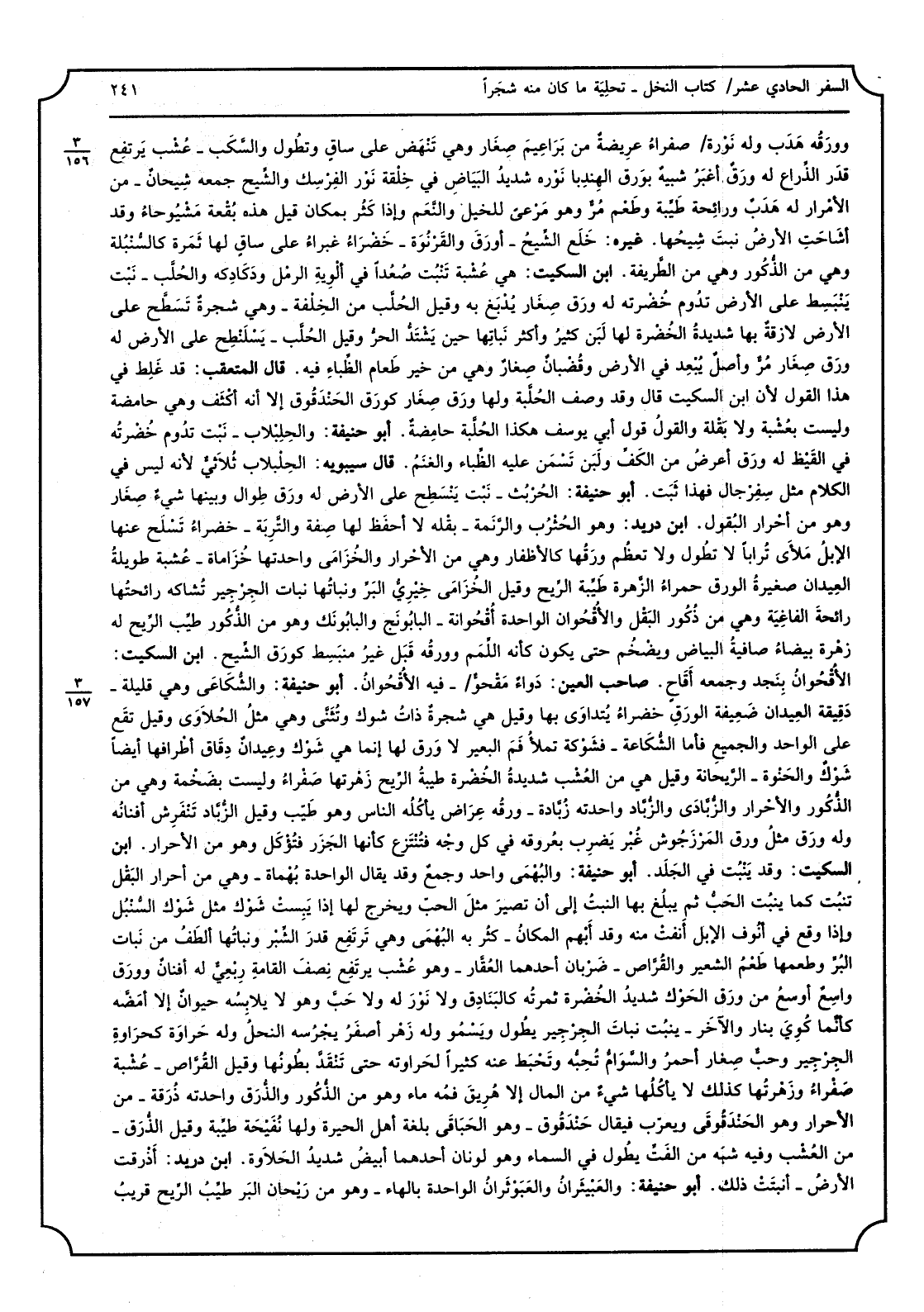 وورقه هدَب وَله نورة صفراء عريضة من براعم صغَار وَهِي تنهض على سَاق وتطول والسّكَب - عشب يرْتَفع قدر الذِّرَاع لَهُ ورق أغبر شَبيه بورق الهِندبا نوره شَدِيد الْبيَاض فِي خلقَة نور الفرسِك والشيح جمعه شيحان - من الأمرار لَهُ هدبٌ ورائحة طيبَة وَطعم مرّ وَهُوَ مرعًى للخيل والنّعم وَإِذا كثر بمَكَان قيل هَذِه بقْعَة مشيوحاء وَقد أشاحت الأَرْض - نبت شيحها. غَيره: خلع الشيح - أَوْرَق والقرنوة - خضراء غبراء على سَاق لَهَا ثَمَرَة كالسُنبُلة وَهِي من الذُّكُور وَهِي من الطّريفة. ابْن السّكيت: هِيَ عشبة تنْبت صُعداً فِي ألوية الرمل ودكادكه والحُلَّب - نبت ينبسط على الأَرْض تدوم خضرته لَهُ ورق صغَار يدبَع بِهِ وَقيل الحلّب من الخِلفة - وَهِي شَجَرَة تسطّح على الأَرْض لَازِقَة بهَا شَدِيدَة الخضرة لَهَا لبن كثير وَأكْثر نباتها حِين يشْتَد الحرّ وَقيل الحُلَّب - يسلنْطِح على الأَرْض لَهُ ورق صغَار مُرّ وأصل يبعد فِي الأَرْض وقُضبان صغَار وَهِي من خير طَعَام الظِباء فِيهِ. قَالَ المتعقب: قد غلِط فِي هَذَا القَوْل لِأَن ابْن السّكيت قَالَ وَقد وصف الحُلّبة وَلها ورق صغَار كورق الحندقوق إِلَّا أَنه أكثف وَهِي حامضة وَلَيْسَ بعشبة وَلَا بقلة وَالْقَوْل قَول أبي يُوسُف هَكَذَا الحلّبة حامضة. أَبُو حنيفَة: والحِلبلاب - نبت تدوم خضرته فِي القيظ لَهُ ورق أعرض من الكفّ ولبَن تسمَن عَلَيْهِ الظّباء وَالْغنم. قَالَ سِيبَوَيْهٍ: الحلبلاب ثلاثي لِأَنَّهُ لَيْسَ فِي الْكَلَام مثل سفرجال فَهَذَا ثَبت. أَبُو حنيفَة: الحُربُث - نبت ينسطح على الأَرْض لَهُ ورق طوال وَبَينهَا شَيْء صغَار وَهُوَ من أَحْرَار البُقول. ابْن دُرَيْد: وَهُوَ الحُثرب والرّنمة - بقلة لَا أحفظ لَهَا صفة والتربة - خضراء تسلح عَنْهَا الْإِبِل ملأى تُرَابا لَا تطول وَلَا تعظم وَرقهَا كالأظفار وَهِي من الْأَحْرَار والخُزامى واحدتها خُزاماة - عشبة طَوِيلَة العيدان صَغِيرَة الْوَرق حَمْرَاء الزّهرة طيبَة الرّيح وَقيل الخُزامى خيريّ الْبر ونباتها نَبَات الجرجير تشاكه رائحتها رَائِحَة الفاغية وَهِي من ذُكُور البقل والأقحوان الْوَاحِدَة أقحوانة - البابونج والبابونك وَهُوَ من الذُّكُور طيب الرّيح لَهُ زهرَة بَيْضَاء صَافِيَة الْبيَاض ويضخم حَتَّى يكون كَأَنَّهُ اللِمَم وورقه قبَل غيرُ منبسط كورق الشيح. ابْن السّكيت: الأقحوان بِنَجْد وَجمعه أقاح. صَاحب الْعين: دَوَاء مقحو - فِيهِ الأقحوان. أَبُو حنيفَة: والشُكاعى والشَّكاعى وَهِي قَليلَة - دقيقة العيدان ضَعِيفَة الْوَرق خضراء يتداوى بهَا وَقيل هِيَ شَجَرَة ذَات شوك وتثنّى وَهِي مثل الحلاوَى وَقيل تقع على الْوَاحِد والجميع فَأَما الشُكاعة - فشوكة تملأ فَم الْبَعِير لَا ورق لَهَا إِنَّمَا هِيَ شوك وعيدان دِقاق أطرافها أَيْضا شوك والحَنوة - الريحانة وَقيل هِيَ من العشب شَدِيدَة الخضرة طيبَة الرّيح زهرتها صفراء وَلَيْسَت بضخمة وَهِي من الذُّكُور والأحرار والزُبادى والزُبّاد واحدته زبّادة - ورقه عراض يَأْكُلهُ النَّاس وَهُوَ طيّب وَقيل الزُبّاد تنفرش أفنانه وَله ورق مثل ورق المرزجوش غُبر يضْرب بعروقه فِي كل وَجه فتنتزع كَأَنَّهَا الجزر فتُؤكل وَهُوَ من الْأَحْرَار. ابْن السّكيت: وَقد ينْبت فِي الجلَد. أَبُو حنيفَة: والبُهْمى وَاحِد وَجمع وَقد يُقَال الْوَاحِدَة بُهماة - وَهِي من أَحْرَار البَقل تنْبت كَمَا ينْبت الحبّ ثمَّ يبلغ بهَا النبت إِلَى أَن تصير مثل الحبّ وَيخرج لَهَا إِذا يَبِسَتْ شوك مثل شوك السُنبُل وَإِذا وَقع فِي أنوف الْإِبِل أنفِتْ مِنْهُ وَقد أبهم الْمَكَان - كثر بِهِ البُهمى وَهِي ترْتَفع قدر الشِبْر ونباتُها ألطَف من نَبَات البُرّ وطعمها طعم الشّعير والقُرّاص - ضَرْبَان أَحدهمَا العُقّار - وَهُوَ عشب يرْتَفع نصف الْقَامَة ربعي لَهُ أفنان وورق وَاسع أوسع من ورق الحوْك شَدِيد الخضرة ثَمَرَته كالبنادق وَلَا نور لَهُ وَلَا حبّ وَهُوَ