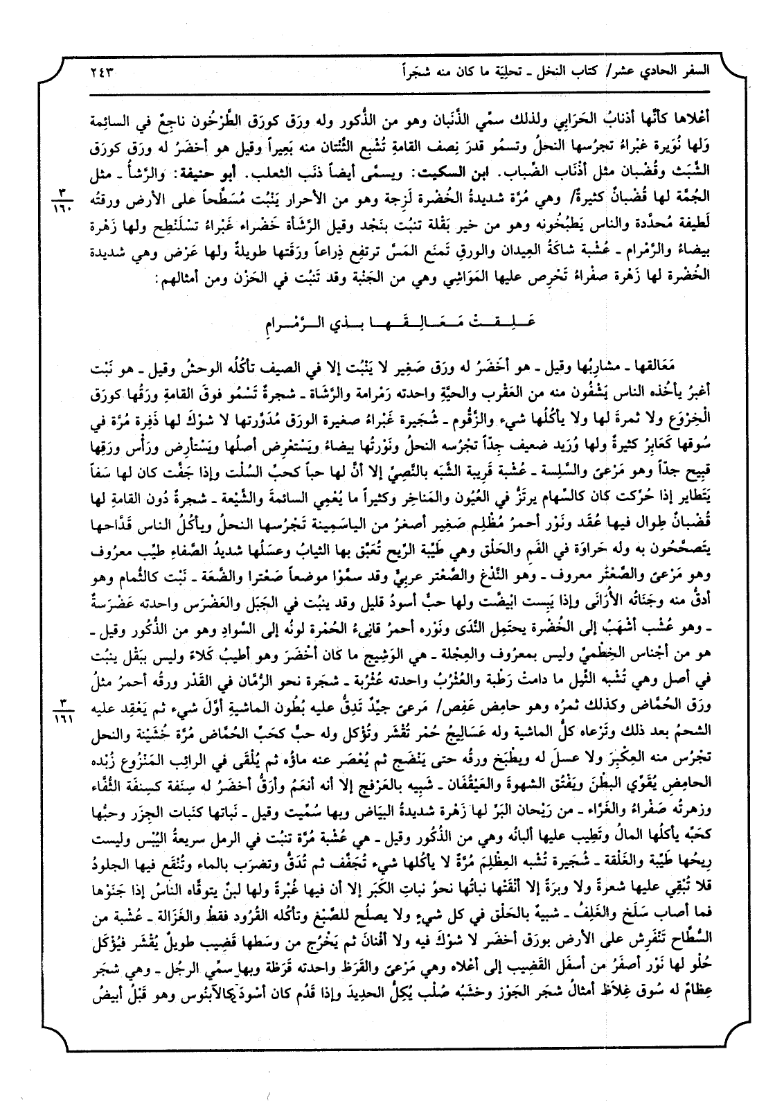 أَعْلَاهَا كَأَنَّهَا أَذْنَاب الحرابي وَلذَلِك سمّي الذّنبان وَهُوَ من الذُّكُور وَله ورق كورق الطّرخون ناجع فِي السَّائِمَة وَلها نُوَيْرَة غبراء تجرسها النَّحْل وتسمو قدر نصف الْقَامَة تشبع الثنتان مِنْهُ بَعِيرًا وَقيل هُوَ أَخْضَر لَهُ رق كورق الشّبث وقضبان مثل أَذْنَاب الضِّباب. ابْن السّكيت: وَيُسمى أَيْضا ذَنْب الثَّعْلَب. أَبُو حنيفَة: والرّشأ - مثل الجمّة لَهَا قضبان كَثِيرَة وَهِي مرّة شَدِيدَة الخضرة لزجة وَهُوَ من الْأَحْرَار ينْبت مسطّحاً على الأَرْض ورقته لَطِيفَة محددة وَالنَّاس يطبخونه وَهُوَ من خير بقلة تنْبت بِنَجْد وَقيل الرشأة خضراء غبراء تسلنطح وَلها زهرَة بَيْضَاء والرمرام - عشبة شاكة العيدان وَالْوَرق تمنع المسّ ترْتَفع ذِرَاعا ورقتها طَوِيلَة وَلها عرض وَهِي شَدِيدَة الخضرة لَهَا زهرَة صفراء تحرص عَلَيْهَا الْمَوَاشِي وَهِي من الجنبة وَقد تنْبت فِي الْحزن وَمن أمثالهم: بت فِي الْحزن وَمن أمثالهم: علقتْ معالقَها بِذِي الرّمرامِ معالقها - مشاربها وَقيل - هُوَ أَخْضَر لَهُ ورق صَغِير لَا ينْبت إِلَّا فِي الصَّيف تَأْكُله الوحشي وَقيل - هُوَ نبت أغبر يَأْخُذهُ النَّاس يشفون مِنْهُ من الْعَقْرَب والحيّة واحدته رمرامة والرّشاة - شَجَرَة تسمو فَوق الْقَامَة وَرقهَا كورق الخروع وَلَا ثَمَرَة لَهَا وَلَا يأكلها شَيْء والزّقوم - شجيرة غبراء صَغِيرَة الْوَرق مدوّرتها لَا شوك لَهَا ذفرة مرّة فِي سوقها كعابر كَثِيرَة وَلها وريد ضَعِيف جدا تجرسه النَّحْل ونورتها بَيْضَاء ويستعرض أَصْلهَا ويستأرض وَرَأس وَرقهَا قَبِيح جدا وَهُوَ مرعًى والسلسة - عشبة قريبَة الشّبه بالنّصي إِلَّا أَن لَهَا حبا كحبّ السلْت وَإِذا جفّت كَانَ لَهَا سفاً يتطاير إِذا حرّكت كَانَ كالسهام يرتزّ فِي الْعُيُون والمناخر وَكَثِيرًا مَا يعمي السَّائِمَة والشّيعة - شَجَرَة دون الْقَامَة لَهَا قضبان طوال فِيهَا عقد وَنور أَحْمَر مظلم صَغِير أَصْغَر من الياسمينة تجرسها النَّحْل وَيَأْكُل النَّاس قدّاحها يتصححون بِهِ وَله حراوة فِي الْفَم وَالْحلق وَهِي طيبَة الرّيح تعبّق بهَا الثِّيَاب وعسلها شَدِيد الصفاء طيّب مَعْرُوف وَهُوَ مرعى والصّعتر مَعْرُوف - وَهُوَ النّدغ والصّعتر عَرَبِيّ وَقد سموا موضعا صعتراً والضّعة - نبت كالثُمام وَهُوَ أدقّ مِنْهُ وجناته الأُرانى وَإِذا يَبِسَتْ ابيضّت وَلها حب أسود قَلِيل وَقد ينْبت فِي الْجَبَل والعضرس واحدته عضرسة - وَهُوَ عشب أَشهب إِلَى الخضرة يحْتَمل النّدى ونوره أَحْمَر قانئ الْحمرَة لَونه إِلَى السوَاد وَهُوَ من الذُّكُور وَقيل - هُوَ من أَجنَاس الخطميّ وَلَيْسَ بِمَعْرُوف والعجلة - هِيَ الوشيج مَا كَانَ أَخْضَر وَهُوَ أطيب كلأ وَلَيْسَ ببقل ينْبت فِي أصل وَهِي تشبه الثيل مادامت رطبَة والعثرب واحدته عثربة - شَجَرَة نَحْو الرّمان فِي الْقدر ورقه أَحْمَر مثل ورق الحمّاض وَكَذَلِكَ ثمره وَهُوَ حامض عفص مرعًى جيّد تدقّ عَلَيْهِ بطُون الْمَاشِيَة أول شَيْء ثمَّ يعْقد عَلَيْهِ الشَّحْم بعد ذَلِك وترعاه كل الْمَاشِيَة وَله عساليج حمر تقشَر وتؤكل وَله حب كحب الحمّاض مرّة خُشينة والنحل تجرس مِنْهُ العكبر وَلَا عسل لَهُ ويطبخ ورقه حَتَّى ينضج ثمَّ يعصر عَنهُ مَاؤُهُ ثمَّ يُلقى فِي الرائب المنزوع زُبده الحامض يقوّي الْبَطن ويفتق الشَّهْوَة والعيقفان - شَبيه بالعرفج إِلَّا أَنه أنعم وأرقّ أَخْضَر لَهُ سنفة كسنفة الثفّاء وزهرته صفراء والغرّاء - من ريحَان البرّ لَهَا زهرَة شَدِيدَة الْبيَاض وَبهَا سمّيت وَقيل - نباتها كنبات الجزر وحبها كحبّة يأكلها المَال وتطيب عَلَيْهَا ألبانه وَهِي من الذُّكُور وَقيل - هِيَ عشبة مرّة تنْبت فِي الرمل سريعة اليُبس وَلَيْسَت رِيحهَا طيّبة والغلْقة - شجيرة تشبه العظلم مرّة لَا يأكلها شَيْء تجفَّف ثمَّ تدقّ وتضرب بِالْمَاءِ وتُنقع فِيهَا الْجُلُود فَلَا تبقي عَلَيْهَا شَعْر