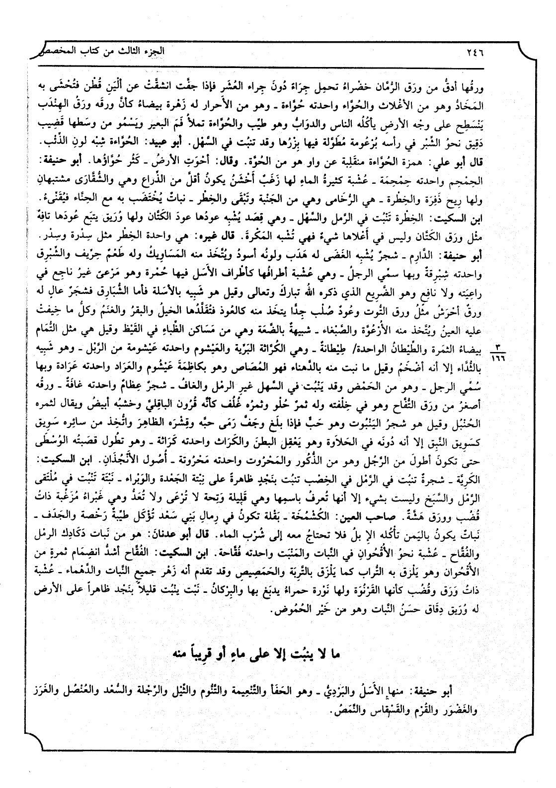 وَرقهَا أدقّ من ورق الرُمّان خضراء تحمل جراءً دون جراء العُشَر فَإِذا جفّت انشقّت عَن أَلين قُطن فتُحشى بِهِ المخادّ وَهُوَ من الأغلاث والحوّاء واحدته حوّاءة - وَهُوَ من الْأَحْرَار لَهُ زهرَة بَيْضَاء كَأَن ورقه ورق الهِندَب ينسطح على وَجه الأَرْض يَأْكُلهُ النَّاس وَالدَّوَاب وَهُوَ طيّب والحوّاءة تملأ فَم الْبَعِير ويسمو من وَسطهَا قضيب دَقِيق نَحْو الشبر فِي رَأسه بُرعومة مطوّلة فِيهَا بزرُها وَقد تنْبت فِي السهل. أَبُو عبيد: الحوّاءة شبه لون الذِّئْب. قَالَ أَبُو عَليّ: همزَة الحواءة منقلبة عَن وَاو هُوَ من الحوّة. وَقَالَ: أحوت الأَرْض - كثر حوّاؤها. أَبُو حنيفَة: الحمحِم واحدته حَمْحَمَة - عشبة كَثِيرَة المَاء لَهَا زغب أخشن يكون أقلّ من الذّراع وَهِي والشُقّارى مشتبهان وَلها ريح ذفِرة والخِطرة - هِيَ الرُخامى وَهِي من الجنبة وَتبقى والخِطْر - نَبَات يُختضَب بِهِ مَعَ الحنّاء فيقنّئُ. ابْن السّكيت: الخِطرة تنْبت فِي الرمل والسهل - وَهِي قصد يُشبه عودُها عودَ الكتّان وَلها وريق يتبع عودَها تافه مثل ورق الْكَتَّان وَلَيْسَ فِي أَعْلَاهَا شَيْء فَهِيَ تشبه المكرة. قَالَ غَيره: هِيَ وَاحِدَة الخِطْر مثل سِدرة وسِدر. أَبُو حنيفَة: الدّارم - شجر يشبه الغضَى لَهُ هدَب ولونه أسود ويتّخذ مِنْهُ المساويك وَله طعم حرّيف والشِبرِق واحدته شِبرِقة وَبهَا سمي الرجل - وَهِي عشبة أطرافها كأطراف الأسَل فِيهَا حمرَة وَهُوَ مرعًى غيرُ ناجع فِي راعيته وَلَا نَافِع وَهُوَ الضّريع الَّذِي ذكر الله تبَارك وَتَعَالَى وَقيل هُوَ شَبيه بالأسَلة فَأَما الشُبارق فشجر عالٍ لَهُ ورق أحرش مثل ورق التوت وعود صلب جدا يتَّخذ مِنْهُ كالعوَذ فتقلَّدها الْخَيل وَالْبَقر وَالْغنم وكل مَا خِيفت عَلَيْهِ الْعين ويُتّخذ مِنْهُ الأرعوّة والصّبْغاء - شَبيهَة بالضّعة وَهِي من مسَاكِن الظِباء فِي القيظ وَقيل هِيَ مثل الثُمام بَيْضَاء الثَّمَرَة والطيطان الْوَاحِدَة طيطانة - وَهِي الكرّاثة البريّة والعيشوم واحدته عيشومة من الرّبل - وَهُوَ شَبيه بالثُدّاء إِلَّا أَنه أضخم وَقيل مَا نبت مِنْهُ بالدّهناء فَهُوَ المُصاص وَهُوَ بكاظمة عيشوم والعَراد واحدته عَرادة وَبهَا سُمّي الرجل - وَهُوَ من الحمْض وَقد ينبُت فِي السهل غير الرمل والغافُ - شجر عِظَام واحدته غافة - ورقه أَصْغَر من ورق التّفاح وَهُوَ فِي خِلفته وَله ثَمَر حُلْو وثمره غُلُف كَأَنَّهُ قُرون الباقلّى وخشبه أبيضُ وَيُقَال لثمره الحُنبُل وَقيل هُوَ شجر الينبوت وَهُوَ حبّ فَإِذا بلغ وجفّ رمى حبّه وقشره الظَّاهِر واتُّخِذ من سائره سويق كسويق النّبق إِلَّا أَنه دونه فِي الْحَلَاوَة وَهُوَ يعقل الْبَطن والكَراث واحدته كَراثة - وَهُوَ تطول قصبت 4 هـ الْوُسْطَى حَتَّى تكون أطول من الرّجُل وَهُوَ من الذّكور والمحروت واحدته محروتة - أصُول الأنجذان. ابْن السّكيت: الكريّة - شَجَرَة تنْبت فِي الرّمل فِي الخِصْب تنْبت بِنَجْد ظَاهِرَة على نِبتة الجَعْدة والوَبْراء - نبتة تنْبت فِي مُلتقى الرمل والسّبخ وَلَيْسَت بِشَيْء إِلَّا أَنَّهَا تُعرف باسمها وَهِي قَليلَة وتِحة لَا تُرعى وَلَا تُعدّ وَهِي غبراء مزغبة ذَات قُضب وورق هشّة. صَاحب الْعين: الكُشمُخة - بقلة تكون فِي رمال بني سعد تُؤْكَل طيبَة رَخصة والجدَف - نَبَات يكون بِالْيمن تَأْكُله الْإِبِل فَلَا تحْتَاج مَعَه إِلَى شرب المَاء. قَالَ أَبُو عدنان: هُوَ من نَبَات دكادِك الرمْل والفُقّاح - عشبة نَحْو الأقحوان فِي النّبات والمنبَت واحدته فُقّاحة. ابْن السّكيت: الفُقّاح أَشد انضمام ثَمَرَة من الأقحوان وَهُوَ يلزق بِهِ التُّرَاب كَمَا يلزَق بالتربة والحَمصيص وَقد تقدم أَنه زهر جَمِيع النّبات والدّهماء - عُشبة ذَات ورق وقُضب كَأَنَّهَا القرنُوة وَلها نورة حَمْرَاء يدبغ بهَا والبِركان - نبت ينْبت قَلِيلا بِنَجْد ظَاهرا على الأَرْض لَهُ وريق دِقاق حسن النّبات وَهُوَ من خير