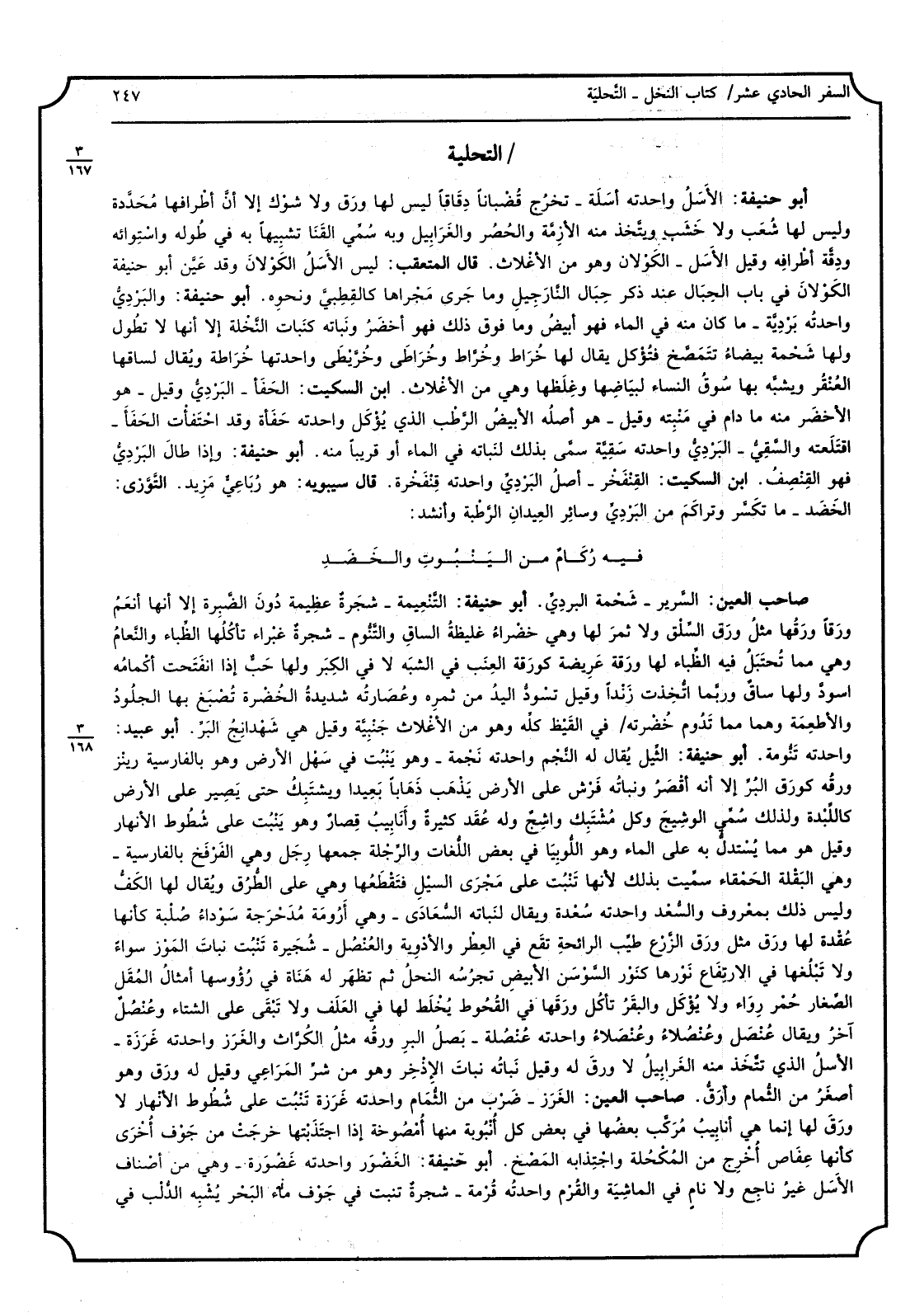 أَبُو حنيفَة: الأسل واحدته أسلة - تخرج قُضباناً دِقاقاً لَيْسَ لَهَا ورق وَلَا شوْك إِلَّا أنّ أطرافها محدّدة وَلَيْسَ لَهَا شُعَب وَلَا خشب ويتّخذ مِنْهُ الأزمّة والحُصُر والغَرابيل وَبِه سُمي القَنا تَشْبِيها بِهِ فِي طوله واستوائه ودقّة أَطْرَافه وَقيل الأسل - الكَولان وَهُوَ من الأغْلاث. قَالَ المتعقب: لَيْسَ الأسل الكوْلان وَقد عيّن أَبُو حنيفَة الكَولان فِي بَاب الحِبال عِنْد ذكر حِبال النّارجيل وَمَا جرى مجْراهَا كالقِطبيّ وَنَحْوه. أَبُو حنيفَة: والبَرديّ واحدته برديّة - مَا كَانَ مِنْهُ فِي المَاء فَهُوَ أَبيض وَمَا فَوق ذَلِك فَهُوَ أَخْضَر ونباته كنبات النّخلة إِلَّا أَنَّهَا لَا تطول وَلها شحمة بَيْضَاء تتمصّخ فنؤكل يُقَال لَهَا خُراط وخرّاط وخرّيْطى واحدتها خُراطة وَيُقَال لساقها العُنقُر ويشبّه بهَا سوق النِّسَاء لبياضها وغِلَظها وَهِي من الأغلاث. ابْن السّكيت: الحفأ - البرديّ وَقيل - هُوَ الْأَخْضَر مِنْهُ مَا دَامَ فِي منبته وَقيل - هُوَ أَصله الْأَبْيَض الرّطْب الَّذِي يُؤْكَل واحدته حفأة وَقد احتفأت الحفأ - اقتلعته والسّقيّ - البَرديّ واحدته سقيّة سمّي بذلك لنباته فِي المَاء أَو قَرِيبا مِنْهُ. أَبُو حنيفَة: وَإِذا طَال البرديّ فَهُوَ القِنصِف. ابْن السّكيت: القِنفَخْر - أصل البردي واحدته قِنفخرة. قَالَ سِيبَوَيْهٍ: هُوَ رُباعيّ مَزيد. التّوّزي: الخضَد - مَا تكسّر وتراكم من البردي وَسَائِر العيدان الرّطبة وَأنْشد: فِيهِ رُكامٌ من اليَنبوت والخضَدِ صَاحب الْعين: السّرير - شحمة البردي. أَبُو حنيفَة: التّنعيمة - شَجَرَة عَظِيمَة دون الضّبِرة إِلَّا أَنَّهَا أنعم وَرقا وَرقهَا مثل ورق السِلق وَلَا ثَمَر لَهَا وَهِي خضراء غَلِيظَة السَّاق والتّنّوم - شَجَرَة غبراء تأكلها الظِباء والنّعام وَهِي مِمَّا تُحتَبل فِيهِ الظِباء لَهَا ورقة عريضة كورقة الْعِنَب فِي الشّبَه لَا فِي الْكبر وَلها حبّ إِذا انفتحت أكمامه اسودّ وَلها سَاق وربّما اتُخذت زنداً وَقيل تسودّ اليدُ من ثمره وعُصارته شَدِيدَة الخُضرة تُصبغ بهَا الْجُلُود والأطعمة وهما مِمَّا تدوم خضرته فِي القيظ كُله وَهُوَ من الأغلاث جنبيّة وَقيل هِيَ شهدانج البرّ. أَبُو عبيد: واحدته تنّومة. أَبُو حنيفَة: الثّيل يُقال لَهُ النَّجْم واحدته نجمة - وَهُوَ ينْبت فِي سهل الأَرْض وَهُوَ بِالْفَارِسِيَّةِ رينز ورقه كورق البُرّ إِلَّا أَنه أقصر ونباته فرش على الأَرْض يذهب ذَهاباً بَعيدا ويشتبك حَتَّى يصير على الأَرْض كاللِبْدة وَلذَلِك سمّي الوشيج وكل مشتبك واشج وَله عقد كَثِيرَة وأنابيب قصار وَهُوَ ينْبت على شطوط الْأَنْهَار وَقيل هُوَ مِمَّا يُستدل بِهِ على المَاء وَهُوَ اللوبيا فِي بعض اللُّغَات والرِجلة جمعهَا رِجَل وَهِي الفرفخ بِالْفَارِسِيَّةِ - وَهِي البقلة الحمقاء سمّيت بذلك لِأَنَّهَا تنْبت على مجْرى السَّيْل فتقطَعُها وَهِي على الطّرق وَيُقَال لَهَا الكفّ وَلَيْسَ ذَلِك بِمَعْرُوف والسُعد واحدته سُعدة وَيُقَال لنباته السُعادى - وَهِي أرومة مدحرجة سَوْدَاء صُلبة كَأَنَّهَا عُقدة لَهَا ورق مثل ورق الزّرع طيّب الرَّائِحَة تقع فِي الْعطر والأدوية والعُنصُل - شجيرة تنْبت نَبَات الموز سَوَاء وَلَا تبلغها فِي الِارْتفَاع نورها كنور السّوسن الْأَبْيَض تجرسه النَّحْل ثمَّ تظهر لَهُ هناة فِي رؤوسها أَمْثَال المُقل الصغار حُمر رواء وَلَا يُؤْكَل وَالْبَقر تَأْكُل وَرقهَا فِي القُحوط يخلَط لَهَا فِي الْعلف وَلَا تبقى على الشتَاء وعُنصل آخر وَيُقَال عُنصَل وعُنصُلاء وعنصَلاء واحدته عنصلة - بصل الْبر ورقه مثل الكرّاث والغرَز واحدته غرزة - الأسل الَّذِي تتَّخذ مِنْهُ الغَرابيل لَا ورق لَهُ وَقيل نَبَاته نَبَات الإذخِر وَهُوَ من شرّ المراعي وَقيل لَهُ ورق وَهُوَ أَصْغَر من الثُمام وأرقّ. صَاحب الْعين: الغرَز - شرب من الثُمام واحدته غرَزة تنبُت على شُطوط الْأَنْهَار لَ