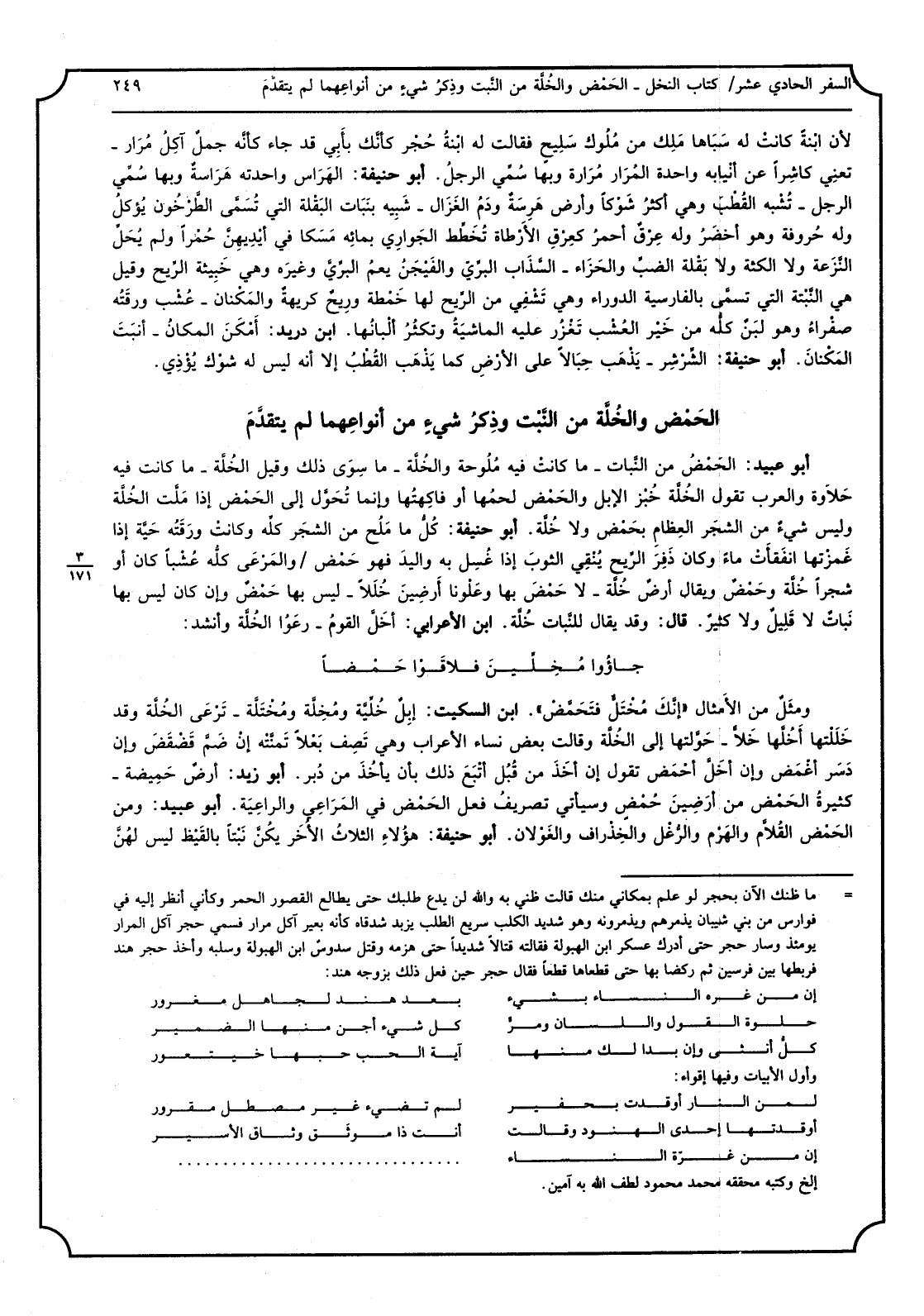لِأَن ابْنة كَانَت لَهُ سَباها ملك من مُلُوك سليح فَقَالَت لَهُ ابْنة حُجر كأنّك بِأبي قد جَاءَ كَأَنَّهُ جمل آكِلُ مُرار - تَعْنِي كاشِراً عَن أنيابه وَاحِدَة المرار مُرارة وَبهَا سُمّي الرجل. أَبُو حنيفَة: الهَراس واحدته هَراسة وَبهَا سمي الرجل - تشبه القطب وَهِي أَكثر شوكاً وَأَرْض هرسة وَدم الغزال - شَبيه بنَبات البقْلة الَّتِي تسمّى الطّرخون يُؤْكَل وَله حروفة وَهُوَ أَخْضَر وَله عرق أَحْمَر كعِرق الأرْطاة تخطّط الْجَوَارِي بمائه مسكاً فِي أَيْدِيهنَّ حُمراً وَلم يُحل النّزعة وَلَا الكثة وَلَا بقلة الضبّ والحَزاء - السّذاب الْبري والفيجن يعم البريّ وَغَيره وَهِي خبيئة الرّيح وَقيل النّبتة الَّتِي تسمّى بِالْفَارِسِيَّةِ الدوراء وَهِي تشْفي من الرّيح لَهَا خمطة وريح كريهة والمَكْنان - عشْب ورقته صفراء وَهُوَ لبن كلّه من خير العشب تغزر عَلَيْهِ الْمَاشِيَة وتكثر أَلْبَانهَا. ابْن دُرَيْد: أمكن الْمَكَان - أنبت المكْنان. أَبُو حنيفَة: الشِرشِر - يذهب حِبالاً على الأَرْض كَمَا يذهب القُطب إِلَّا أَنه لَيْسَ شوك يُؤْذِي.