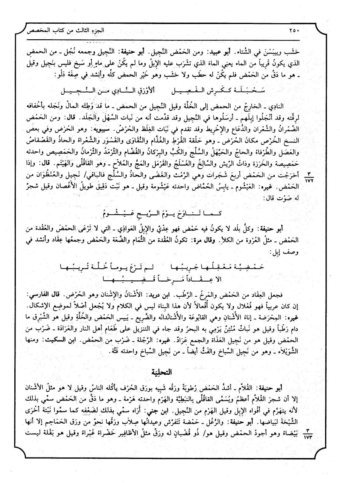 خشب وييبسن فِي الشتَاء. أَبُو عبيد: وَمن الحمض النّجيل. أَبُو حنيفَة: النّجيل وَجمعه نُجُل - من الحمض الَّذِي يكون قَرِيبا من المَاء يَعْنِي المَاء الَّذِي تشرب عَلَيْهِ الْإِبِل وَمَا لم يكن على ماءِ أَو سبخ فَلَيْسَ بنجيل وَقيل - هُوَ مَا دقّ من الحمض فَلم يكن لَهُ حطب وَلَا خشب وَهُوَ خير الحمض كُله وَأنْشد فِي صفة دلْو: سحبَلَة ككرِش الفَصيل الأورقِ النّادي من النّجيل النادي - الْخَارِج من الحمض إِلَى الخُلّة وَقيل النّجيل من الحمض - مَا قد وَطئه المَال ونجَله بأخفاقه لرقّته وَقد أنجلوا إبلهم - أرسلوها فِي النّجيل وَقد قدّمت أَنه من نَبَات السهل والجلَد. قَالَ: وَمن الحمض الضّمران والشّعران والدُعاع والإخريط وَقد تقدم فِي نَبَات الغلَظ والحرُض. سِيبَوَيْهٍ: وَهُوَ الحرض وَفِي بعض النّسخ الخُرُص مَكَان الحُرْض - وَهُوَ حلْقة القُرْط والغذّام والنُقاوَى والقَسْور والشّعراء والحاذ والقَصقاص والعصَل والطّرفاء والحاجُ والحيهل والسُلّج ولُكّب والبِركان والقُضّام والثّرمد والثّرمان والحميص واحدته حمصيصة والخرزة وَذَات الريش والسّالخ والغسلج والقرمل والمَجّ والمُلاح - وَهُوَ القاقُليّ والهيتم. قَالَ: وَإِذا أخرجت من الحمض أَربع شجرات وَهِي الرِمث والغضى والحاذ والسُلّج فالباقي نجيل والعُنظوان من الحمض. غَيره: العيشوم - يَابِس الحمّاض واحدته عيشومة وَقيل - هُوَ نبت دَقِيق طَوِيل الأغصان وَقيل شجر لَهُ صَوت قَالَ: كَمَا تناوحَ يومَ الرّيح عيشومُ أَبُو حنيفَة: وكل بلد لَا يكون فِيهِ حمض فَهُوَ عدْي وَالْإِبِل العواذي - الَّتِي لَا ترعى الحمضَ والعُقدة من الحمض - مثل العُروة من الْكلأ. وَقَالَ مرّة: تكون العُقدة من الثُمام والضّعة والحمض وَجَمعهَا عِقاد وَأنْشد فِي وصف الْإِبِل: حمضيّة معقلُها جريبُها لم ترعَ يَوْمًا خلّة تُريبها إِلَّا عِقاداً مرخاً قضيبها فَجعل العِقاد من الحمض والمرِخُ - الرّطب. ابْن دُرَيْد: الأشنان والإشنان وَهُوَ الحُرُض. قَالَ الْفَارِسِي: إِن كَانَ عَرَبيا فَهُوَ فُعلال وَلَا يكون أُفعالاً لِأَن هَذَا الْبناء لَيْسَ فِي الْكَلَام وَلَا يُجعل أصلا لموْضِع الْإِشْكَال. غَيره: المِحرضة - إِنَاء الأُشنان وَهِي القابوعة والأُشناندانة والضّريع - يبيس الحمض والخلّة وَقيل هُوَ الشِبرِق مادام رطبا وَقيل هُوَ نَبَات منتن يَرْمِي بِهِ الْبَحْر وَقد جَاءَ فِي التَّنْزِيل على طَعَام أهل النَّار والعَرادة - ضرب من الحمض وَقيل هُوَ من نجيل العذاة وَالْجمع عراد. غَيره: الرِجْلة - ضرب من الحمض. ابْن السّكيت: وَمِنْهَا الشويْلاء - وَهُوَ من نجيل السِباخ والفثّ أَيْضا - من نجيل السِباخ واحدته فثّة.
